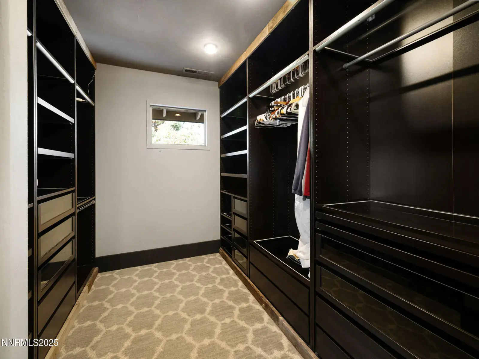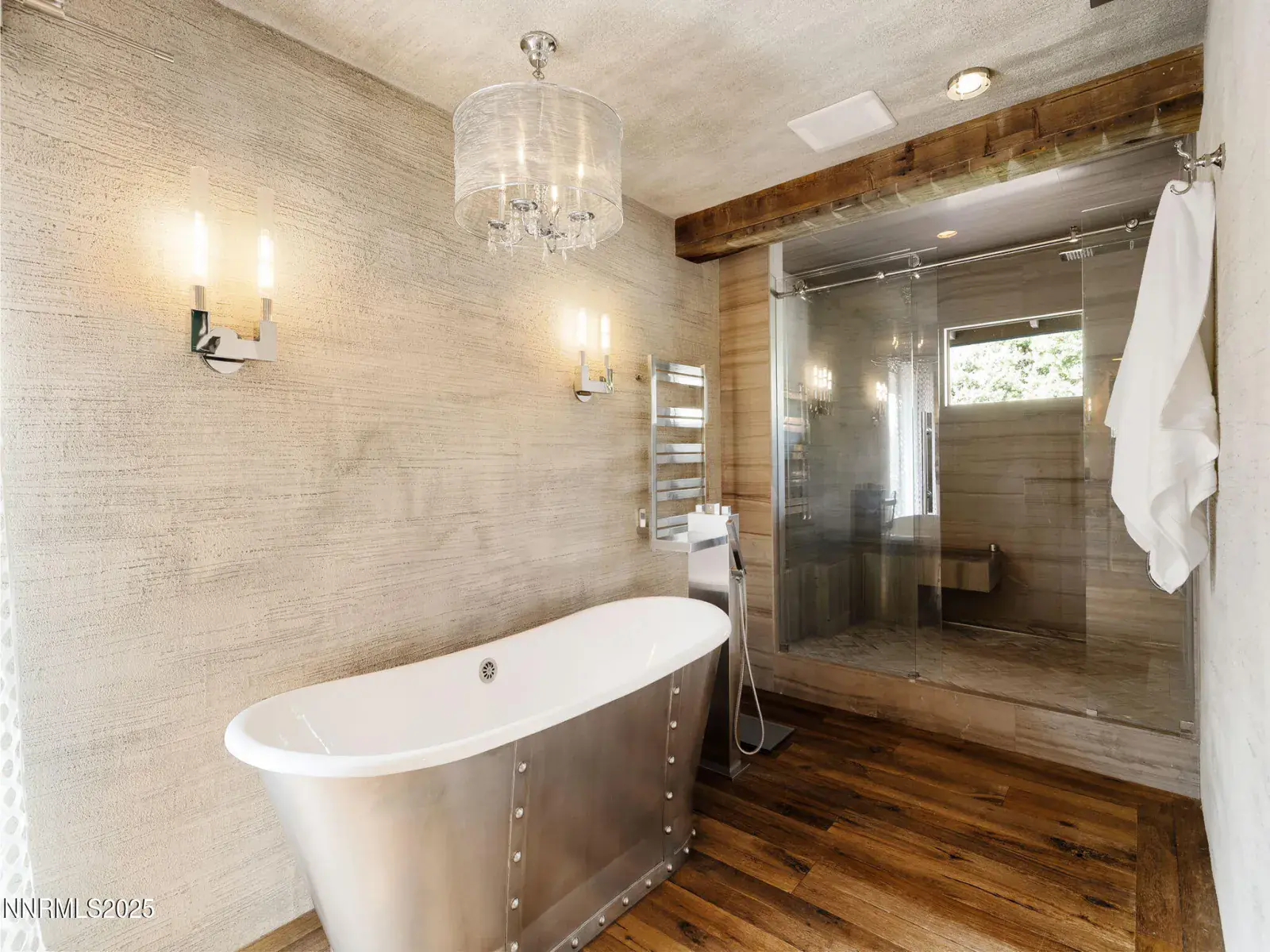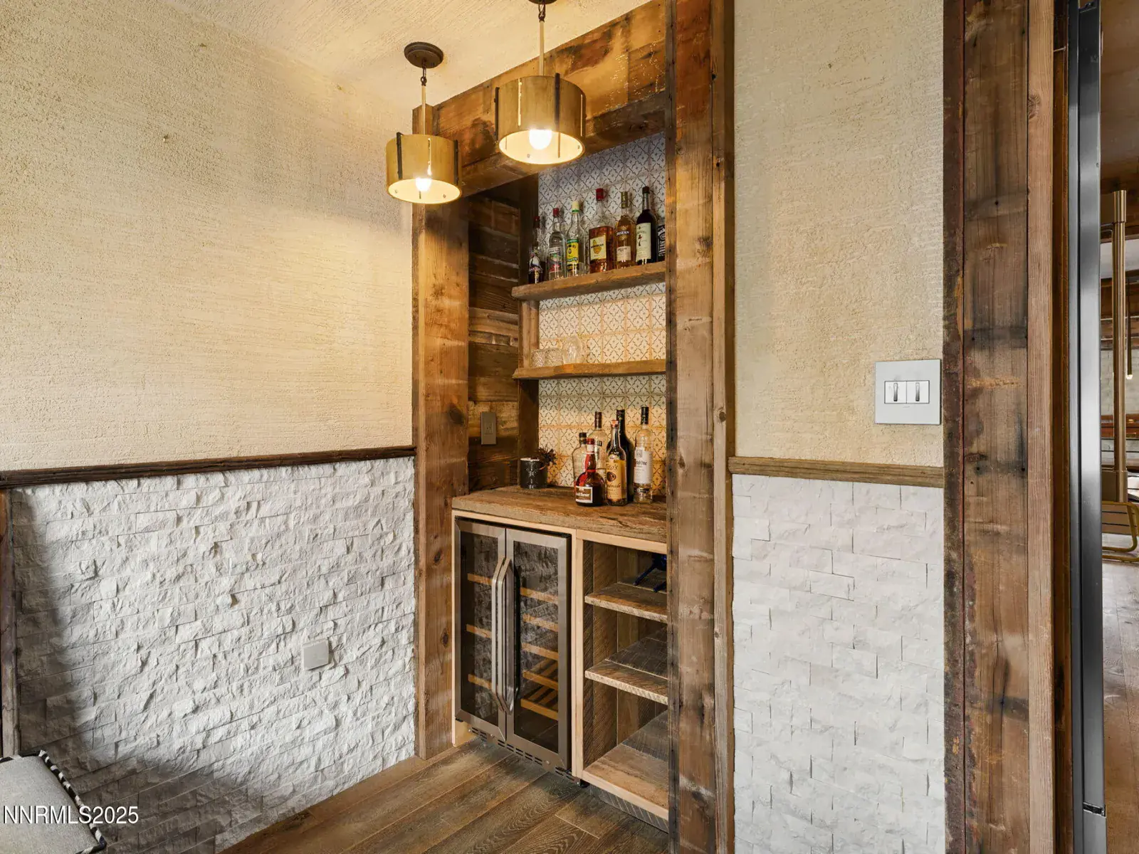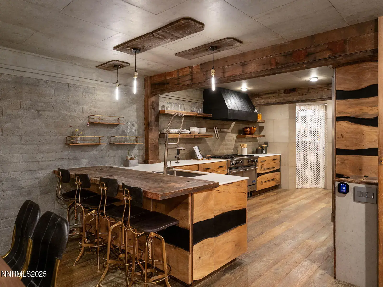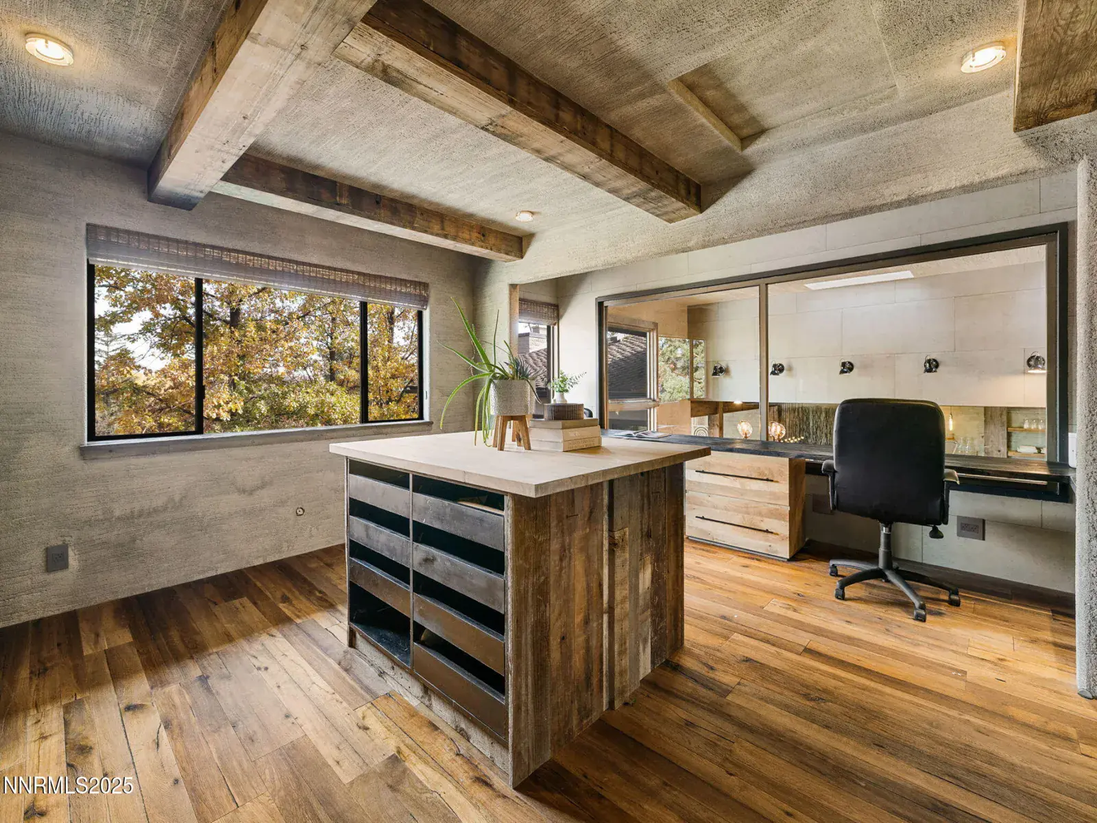 Designed by a renowned Northern Nevada architect, this residence was built in the 1970s for the original family who lovingly cared for the home until 2016 when the current owners bought the home. The property underwent a complete redesign and renovation in 2017, where all interior and exterior surfaces were rebuilt, including new walls, flooring, windows, doors, cabinetry, appliances, plumbing fixtures, counters, and lighting. Distinctive features include barnwood ceiling beams, fireplaces, custom metal-and-wood kitchen cabinetry, walnut living-room wall slabs and mantle, a media room with a functioning vault door, built-in office cabinetry, interior stucco wall texture, and a dedicated glass-enclosed wine storage. Interior doors were crafted from reclaimed wood from the Tahoe Queen dock in South Lake Tahoe. Custom cabinetry was fabricated in Truckee, CA, and the walnut elements were built in Minden, NV. The landscape, designed by Artistic Gardens of Reno, includes terraced boulder pads, garden beds, rose garden, fruit trees, and an outdoor fireplace. There is a large composite deck, paved seating areas, and an RV parking space on the Manzanita Lane side. Energy-efficient upgrades include foam-board exterior insulation added in 2018, geothermal heating with natural-gas backup, three new AC zones (2022), and a geothermal pump replaced in 2022. The home also features smart-home lighting controls, remote-operated thermostats, and garage doors that sense vehicle proximity.