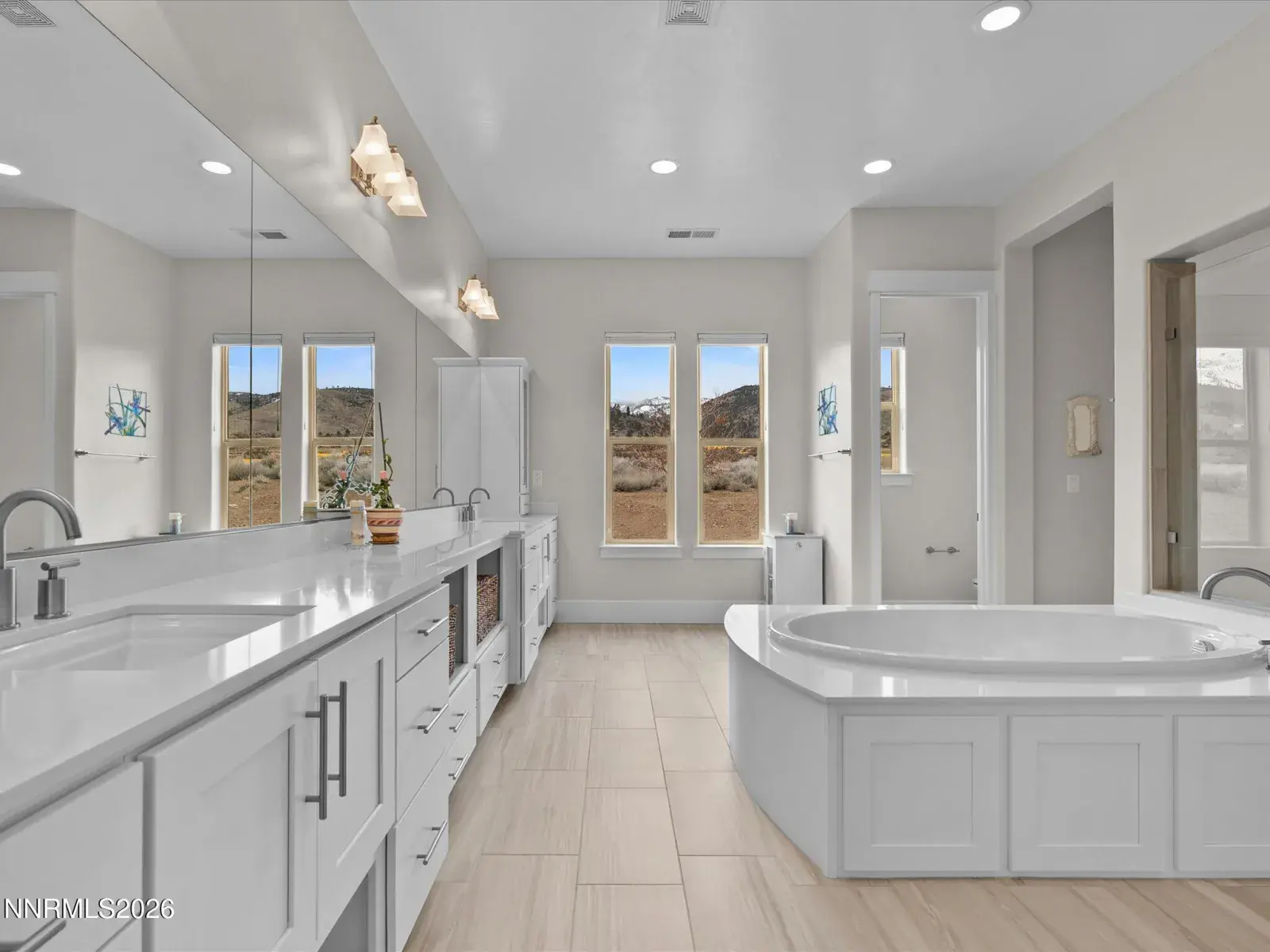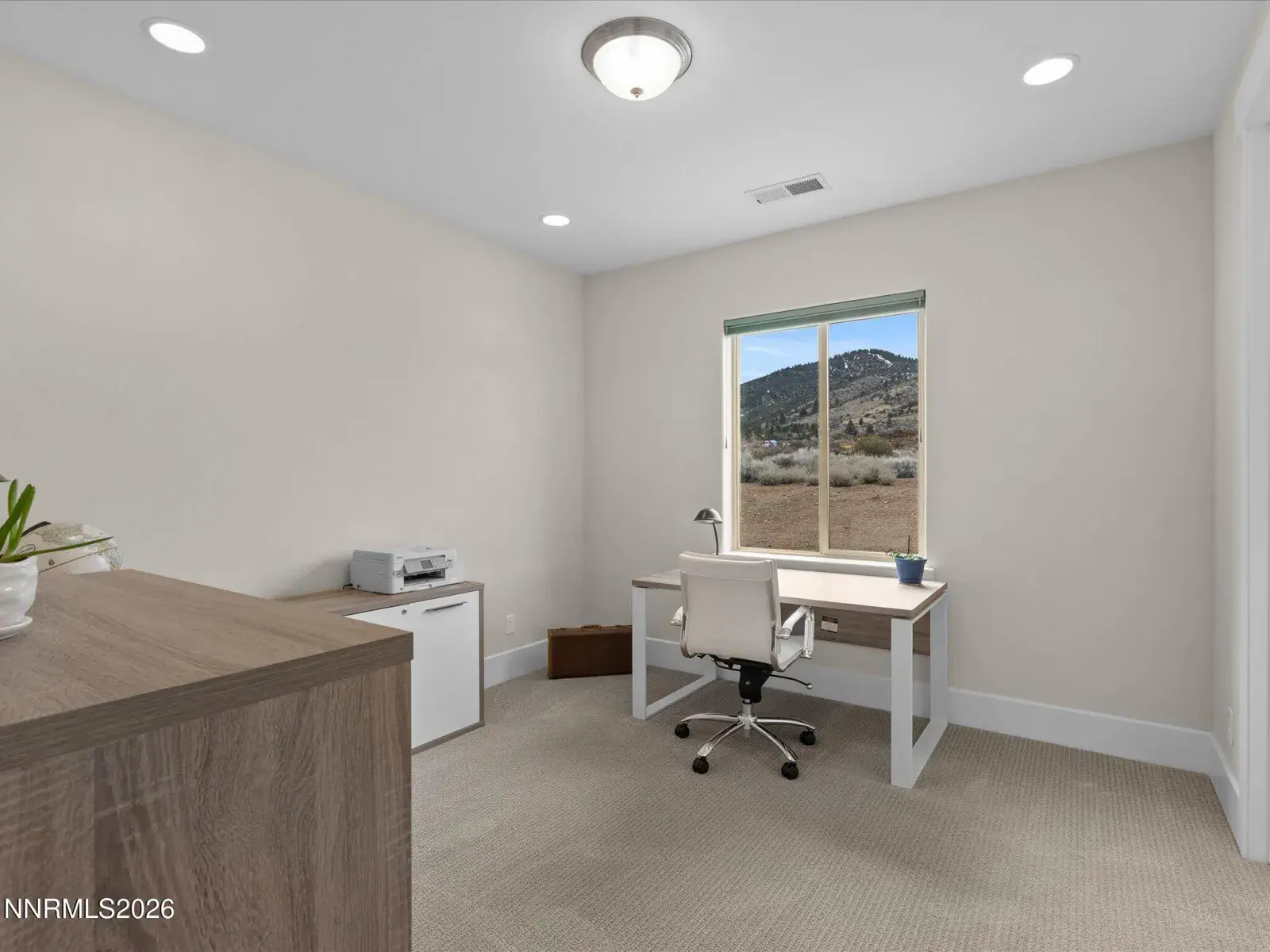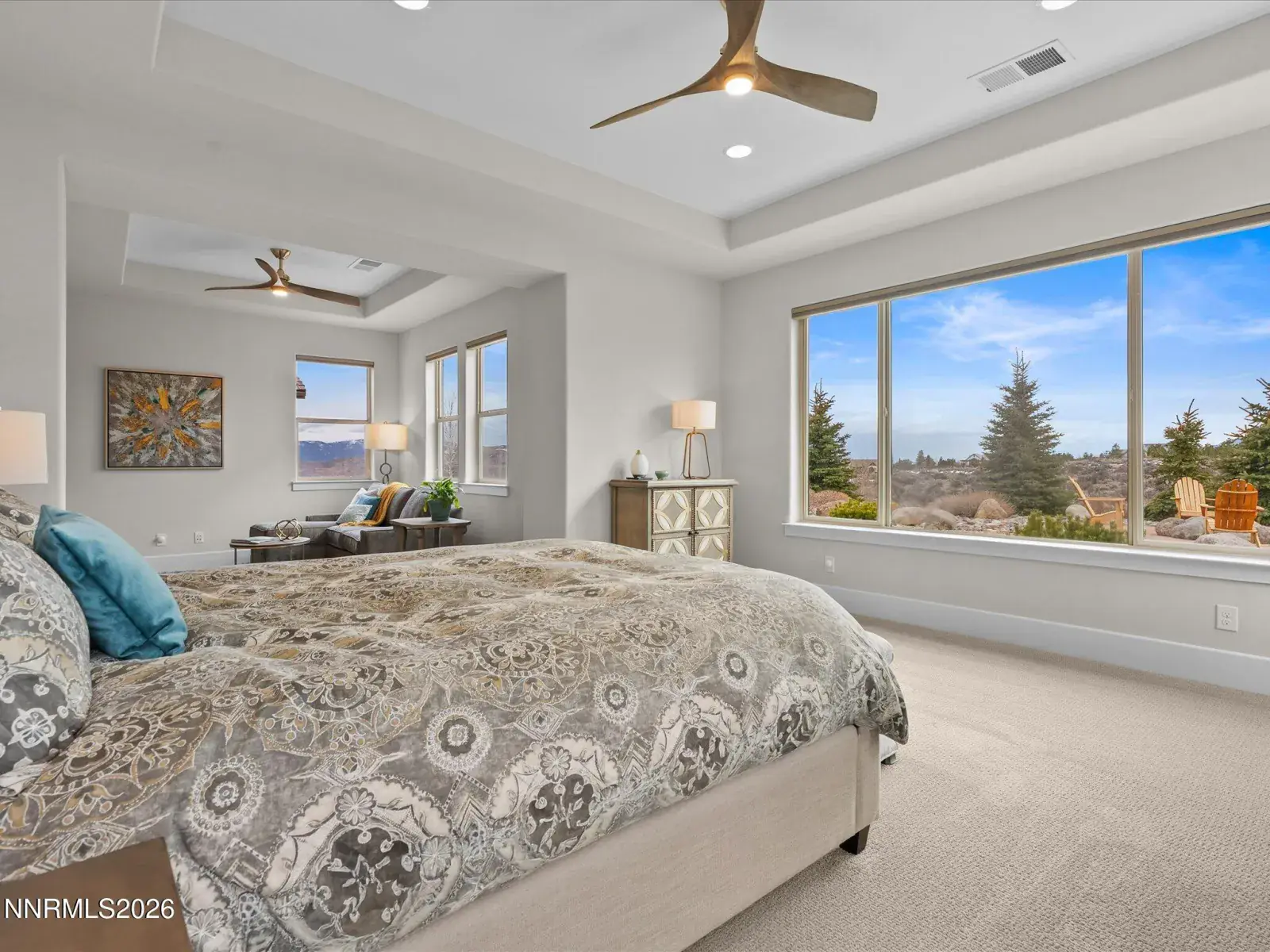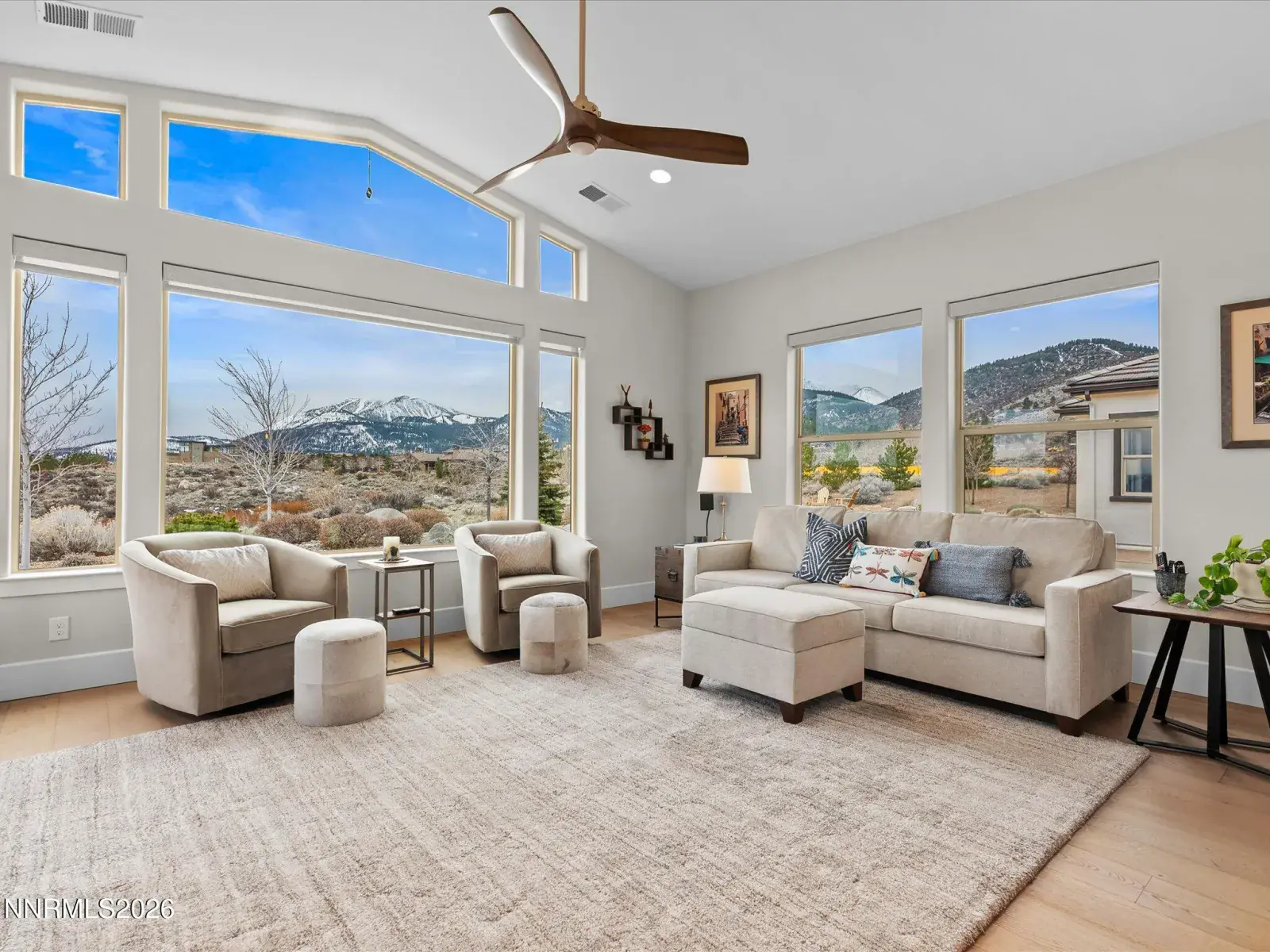 VIEWS, VIEWS, VIEWS! Set at the top of scenic Salmon River Court with sweeping, unobstructed views of Mt. Rose, Slide Mountain, the Virginia City foothills, and Washoe Valley, this 2017-built custom residence offers refined mountain living on a professionally landscaped 1.03-acre parcel backing up to White’s Creek Nature Preserve. Spanning 3,942 sq ft, the single story home features 4 bedrooms, 3.5 baths, den, office, and a finished 1,212 sq ft 4-car garage with epoxy floors, custom storage cabinetry, insulated doors, Wi-Fi LiftMaster openers, and pre-plumbing for a utility sink. Designed for elevated everyday living and seamless entertaining, the expansive kitchen offers soft-close cabinetry, pull-outs, an oversized quartz island, butler’s pantry with beverage cooler, and adjacent wine room with dedicated 20-amp outlet. The great room showcases a Xtrordinair linear fireplace with blower, is pre-wired for surround sound, and has a vaulted ceiling. Montara Mission hardwood floors are throughout the main living areas. Upon opening the 8 foot slider to a covered paver patio with dual gas stub-outs for future BBQ or outdoor kitchen and separate gas firepit, you’ll hear White’s Creek. The private primary suite is a true retreat with its own Xtrordinair fireplace, heated bathroom floors, and customized closet system. Additional highlights include hand-troweled drywall, 7.5″ baseboards, Hunter Douglas window coverings (many automated), dual-zone HVAC, tankless water heater with recirculating pump, hard-wired security system and cameras, Cat5 wiring throughout, Wi-Fi irrigation, and a gated courtyard with water feature. Direct access to White’s Creek Trail and just minutes to Thomas Creek and Sierra Front Trails, Mt. Rose Ski Resort, this exceptional property combines privacy, technology, craftmanship, and unmatched views in one of South Reno’s most desirable settings. This is a MUST SEE property for the best pictures you’ll ever take!