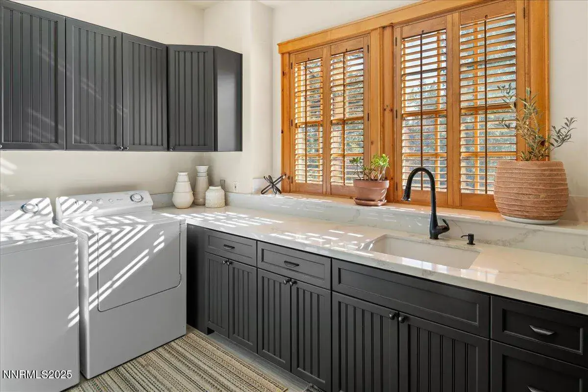Cabinets, Laundry Room, Shelves, Sink, Washer Hookup