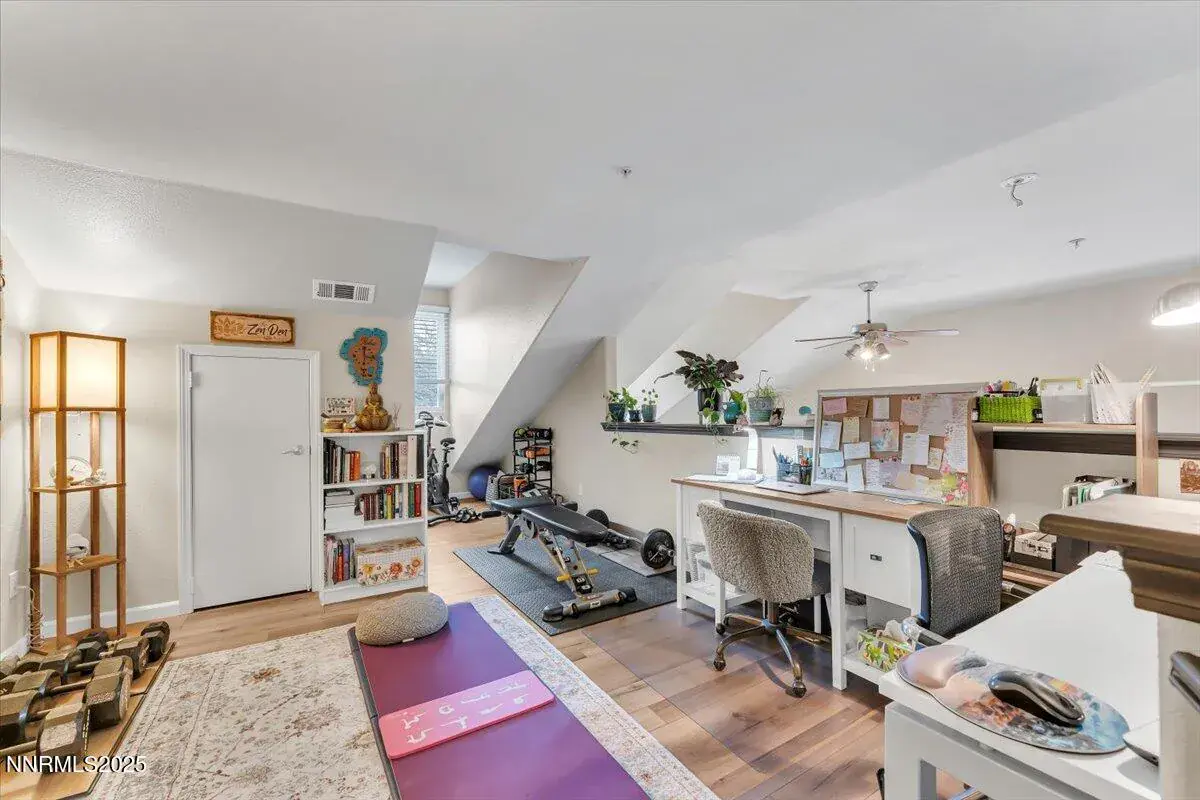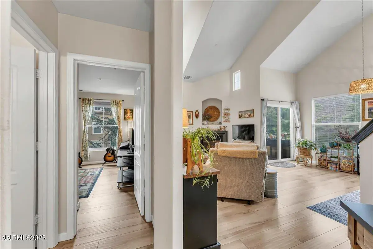 Welcome to Triana, a quiet and gated South Reno community where comfort, convenience, and stunning views come together. This move-in ready 2-bedroom + a loft, 2-bath home offers abundant natural light in every room, new luxury vinyl plank flooring throughout, and energy-efficient double-pane windows for year-round comfort. Step into a bright, open floor plan featuring a spacious living area, gas fireplace, and modern vaulted ceilings that create an inviting and airy feel. Enjoy two private balconies, one off the primary suite and another off the main living space, both offering peaceful views of the Sierra mountains and open space. The updated kitchen shines with granite countertops, a large pantry, and ample cabinet space, flowing seamlessly into the living and dining areas. The primary suite is a true retreat with a walk-in closet, private balcony, and a spa-like bathroom featuring a soaking tub and separate shower. There is tons of storage and closets throughout. The loft space adds versatility ideal for a home office, gym, or creative nook. The spacious 2-car garage offers extra storage, plus an additional parking spots. The unique location of this home makes it extra quiet and peaceful. Triana’s amenities include a pool, hot tub, playground, and direct access to walking and biking trails. Perfectly located near shopping, dining, Reno airport, hospitals, and just 30 minutes to Lake Tahoe. This highly desirable 1,477 sq. ft. model combines privacy, comfort, and location in one of South Reno’s most sought-after communities. Don’t miss your chance to call this turn-key home yours!