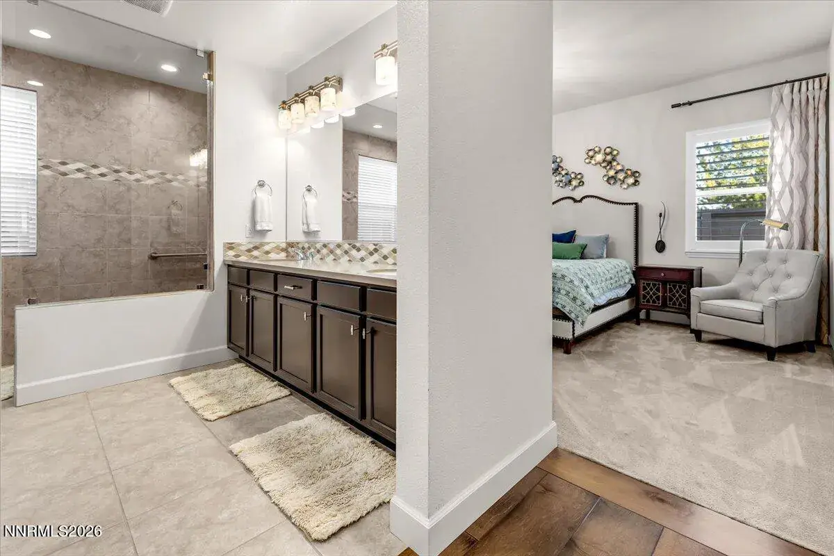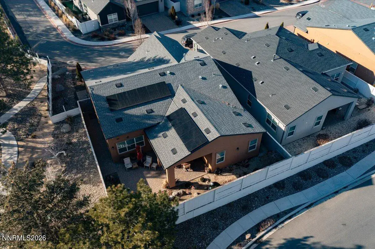 Refined single-level living in the heart of Ranchharrah. Positioned on a premium corner lot with only one neighboring home, this elegant 2 bedroom, 2.5 bathroom residence offers privacy, sophistication, and effortless living across 1,921 sq ft. Soaring ceilings and an open-concept design create a light-filled, spacious atmosphere ideal for both entertaining and everyday comfort. The kitchen is perfectly designed for the chef in you, featuring generous prep space, seamless flow to the dining and living areas, and an inviting layout that makes hosting feel effortless. The luxurious primary suite is a true retreat with a spacious bedroom, large walk-in closet, dual sinks, and an oversized walk-in shower. A private guest suite with its own en-suite bathroom offers comfort and privacy for visitors, while the dedicated office/den provides flexible space for work or relaxation. Step outside to a serene, private backyard complete with a covered paver patio and lush landscaping that comes alive in the spring. Enjoy direct gated access to Ranchharrah’s scenic walking trails and convenient proximity to the main clubhouse and resort-style amenities. Additional highlights include a 2-car garage and owned solar, delivering minimal energy costs and modern efficiency. This is low-maintenance luxury living in one of Reno’s most sought-after communities.