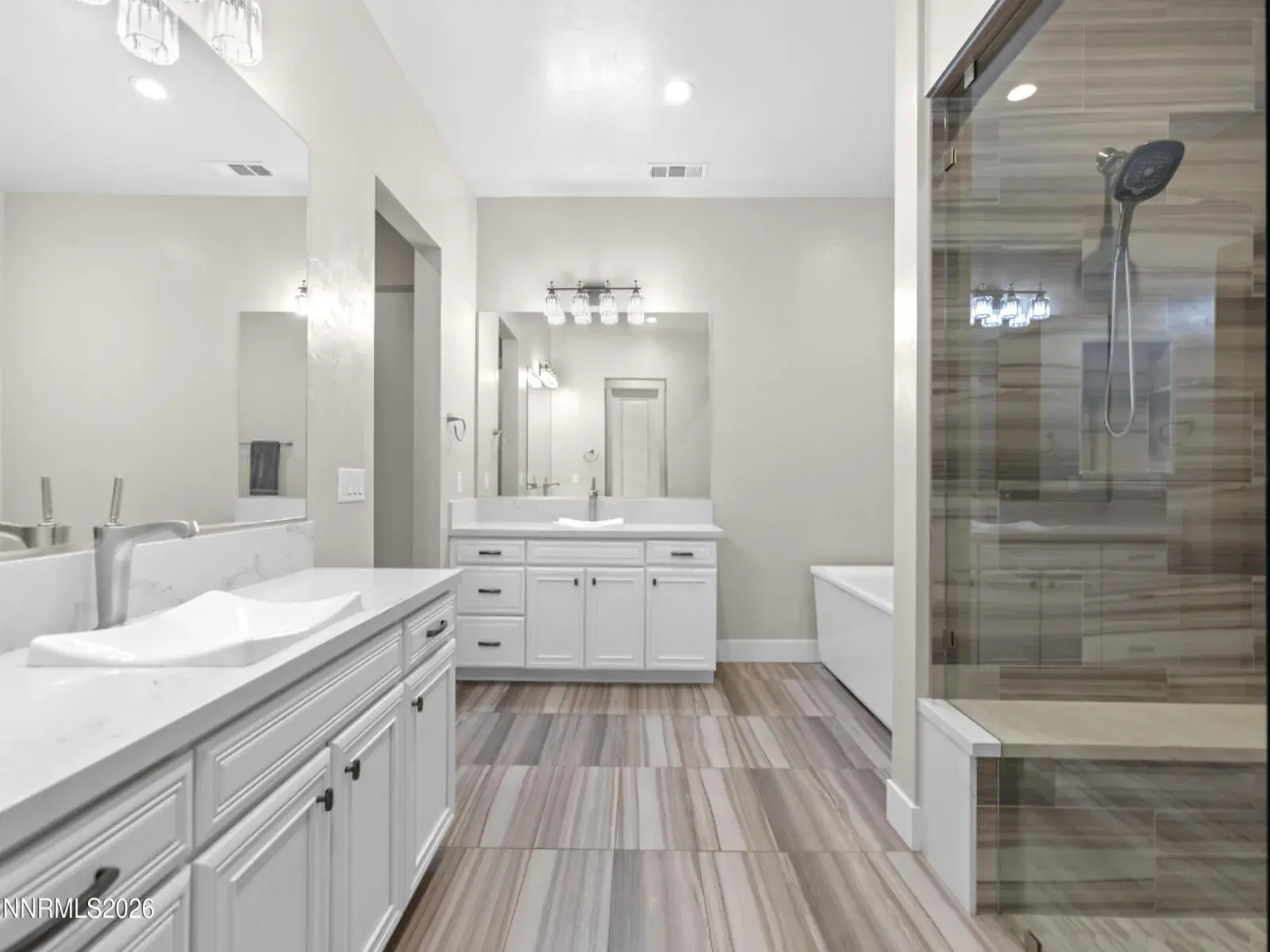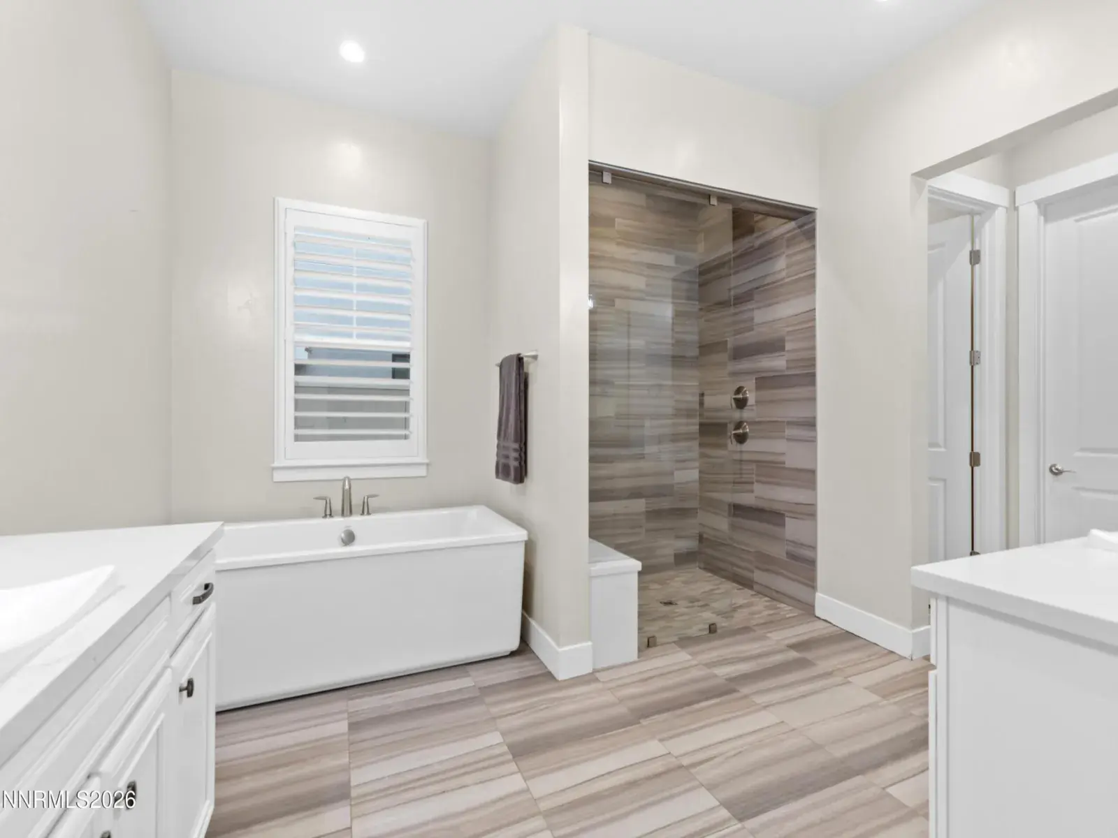 Experience refined single-level living on a private lot in one of Reno’s most coveted gated communities. This residence blends modern luxury with the serenity of mature, tree-lined surroundings and showcases over $200,000 in modern, elegant upgrades throughout. The kitchen features quartzite countertops, waterfall island, premium cabinetry, 48″ built-in refrigerator, double ovens, wine fridge, and upgraded wood-look porcelain tile flooring throughout. Additional enhancements include crystal chandeliers and lighting, recessed lighting, surround sound speakers, plantation shutters throughout, hardwood floors in the office, and a linear gas fireplace with floor-to-ceiling tile – all elevating the home’s sophisticated aesthetic. Soaring 16-foot ceilings enhance the open floor plan, while the primary suite offers a spa-inspired retreat with dual vanities, decorative/crystal vanity lighting, a standalone soaking tub, and a doorless walk-in shower wrapped in elegant tile. Each bedroom is ensuite, providing comfort and privacy for family or guests. Step outside to the covered patio with surround sound speakers and an above-ground hot tub, perfect for year-round relaxation and entertaining. Residents enjoy resort-style amenities at The Club at Rancharrah, including a pool with cabanas, full-service spa, restaurant and bar, fitness center with classes, pickleball, bocce, and curated year-round events. Ideally located near The Village at Rancharrah, premier grocers, Reno-Tahoe International Airport, and Reno’s finest dining and shopping, with Mount Rose and Lake Tahoe just a short drive away. This home delivers a rare combination of luxury, modern elegance, privacy, and effortless living -Rancharrah at its finest.
