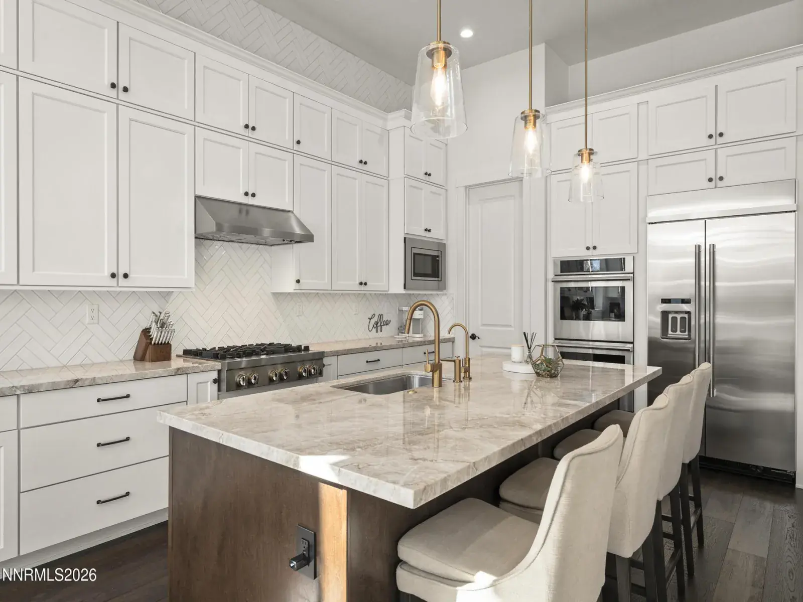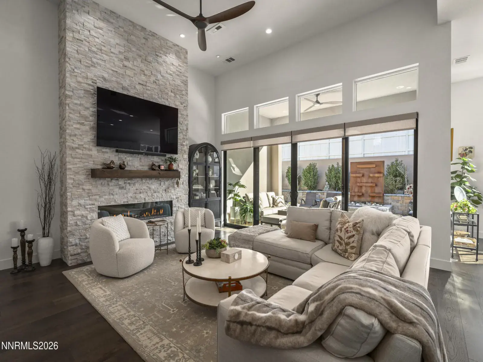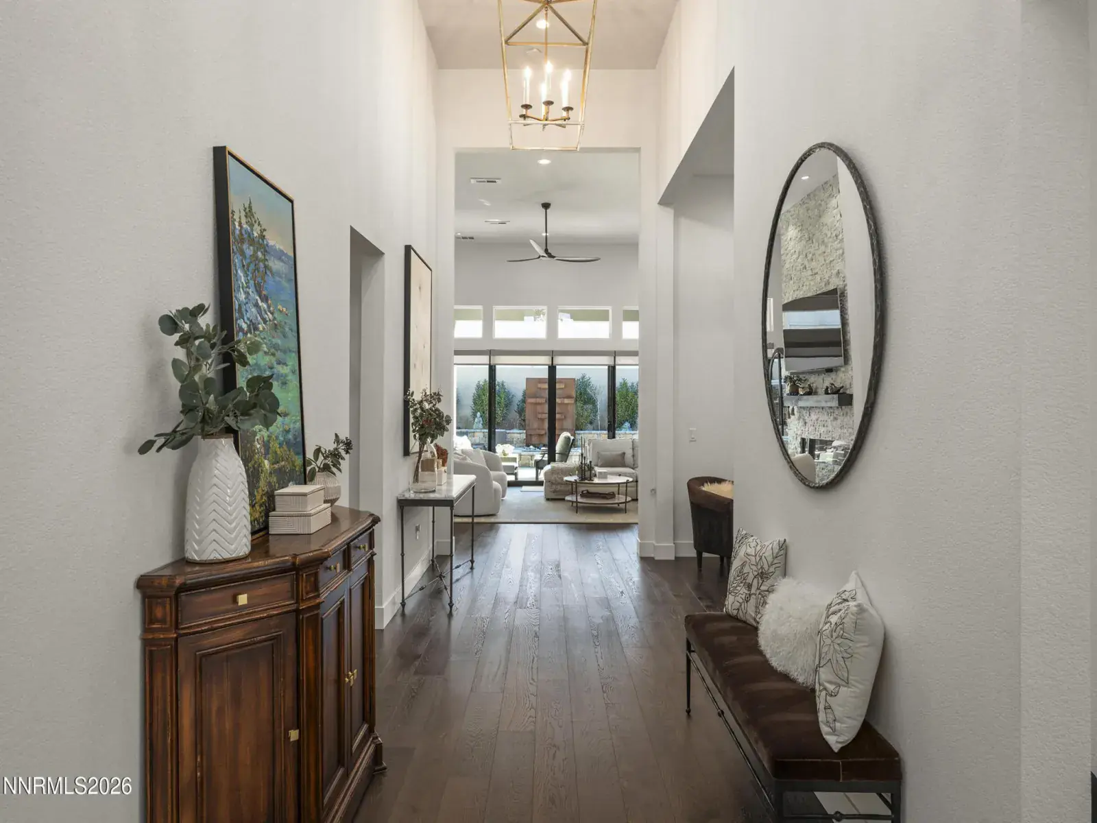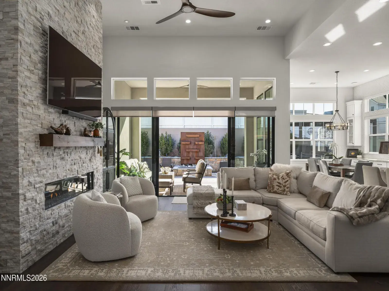 Experience elevated living in the prestigious gated community of Rancharrah. This impeccably upgraded residence offers 3 bedrooms, 3 full en-suite bathrooms, and an elegant powder room for guests—thoughtfully designed for both privacy and entertaining. No detail has been overlooked, with high-end finishes throughout, including beautiful oak flooring and a stunning chef’s kitchen anchored by Taj Mahal quartzite countertops and fully upgraded JennAir appliances. The dramatic floor-to-ceiling stone fireplace serves as the show-stopping focal point of the great room, creating the perfect setting for cozy evenings, while the dining area—highlighted by a striking chandelier—flows seamlessly and fills the space with natural light. Custom California Closets and added built-in shelving in the guest suites maximize storage while maintaining clean, designer lines. Hunter Douglas shades and shutters have been upgraded throughout, offering both sophistication and functionality. The backyard is a true retreat—professionally completed with a tranquil water feature, fire pit, built-in barbecue, and full drip irrigation system for effortless maintenance. Ideal for entertaining or relaxing under Reno’s expansive skies. Residents enjoy exceptional resort-style amenities at The Club at Rancharrah, just a short distance away, featuring a pool with cantina and poolside service, private dining at Nineteen 57, a three-level fitness center with classes, spa and salon, pickleball and bocce courts, and curated social events for all ages. Beyond the gates, The Village at Rancharrah offers fine dining, boutiques, and wellness services. Ideally located near Bartley Ranch Regional Park, Reno-Tahoe International Airport, Midtown, and Downtown Reno—with Mt. Rose Ski Tahoe just 18 minutes away and Lake Tahoe only 40 minutes from your door. Don’t miss your opportunity to own in one of Reno’s most sought-after luxury communities. This home offers modern elegance, thoughtful upgrades, and turnkey convenience.