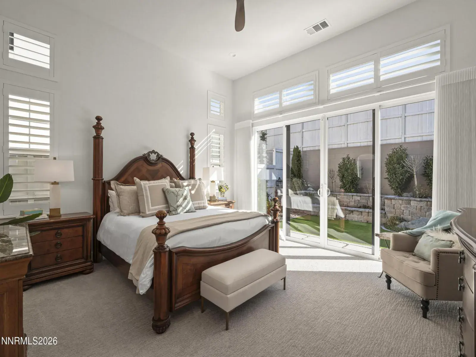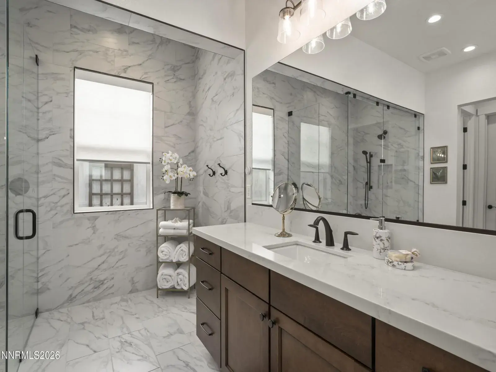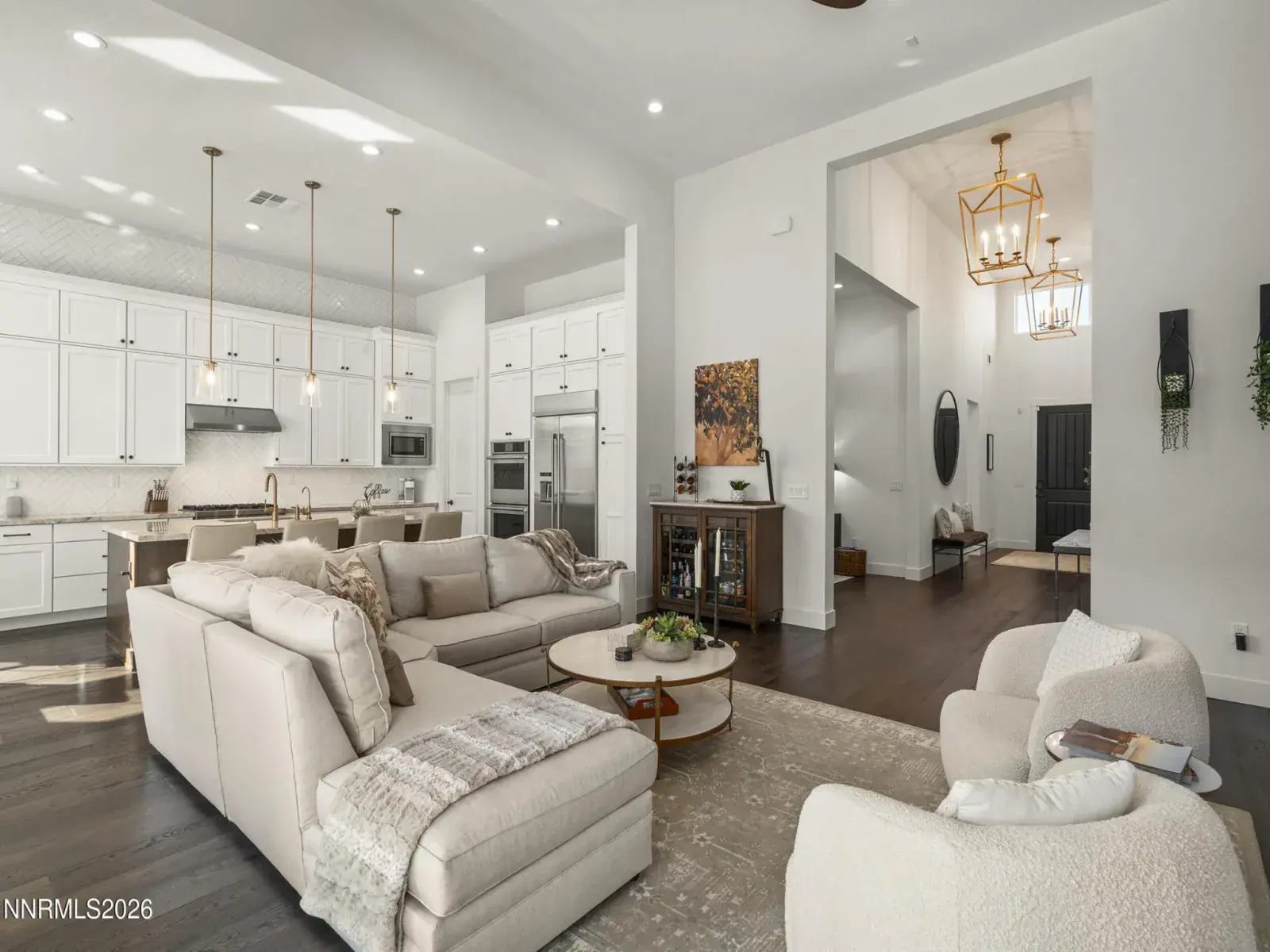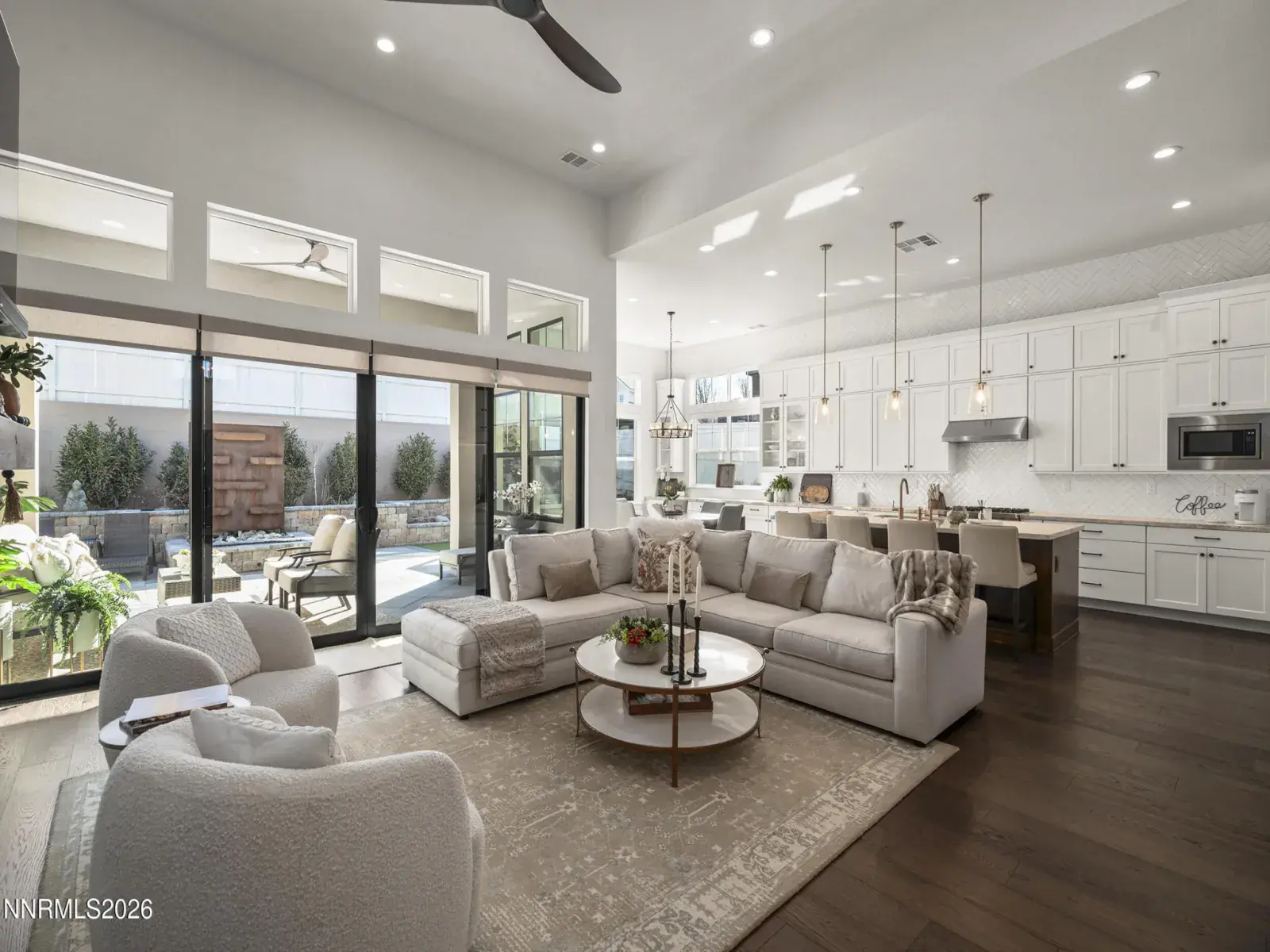 Experience elevated living in the prestigious gated community of Rancharrah. This impeccably upgraded residence offers 3 bedrooms, 3 full en-suite bathrooms, and an elegant powder room for guests—thoughtfully designed for both privacy and entertaining. No detail has been overlooked, with high-end finishes throughout, including beautiful oak flooring and a stunning chef’s kitchen anchored by Taj Mahal quartzite countertops and fully upgraded JennAir appliances. The dramatic floor-to-ceiling stone fireplace serves as the show-stopping focal point of the great room, creating the perfect setting for cozy evenings, while the dining area—highlighted by a striking chandelier—flows seamlessly and fills the space with natural light. Custom California Closets and added built-in shelving in the guest suites maximize storage while maintaining clean, designer lines. Hunter Douglas shades and shutters have been upgraded throughout, offering both sophistication and functionality. The backyard is a true retreat—professionally completed with a tranquil water feature, fire pit, built-in barbecue, and full drip irrigation system for effortless maintenance. Ideal for entertaining or relaxing under Reno’s expansive skies. Residents enjoy exceptional resort-style amenities at The Club at Rancharrah, just a short distance away, featuring a pool with cantina and poolside service, private dining at Nineteen 57, a three-level fitness center with classes, spa and salon, pickleball and bocce courts, and curated social events for all ages. Beyond the gates, The Village at Rancharrah offers fine dining, boutiques, and wellness services. Ideally located near Bartley Ranch Regional Park, Reno-Tahoe International Airport, Midtown, and Downtown Reno—with Mt. Rose Ski Tahoe just 18 minutes away and Lake Tahoe only 40 minutes from your door. Don’t miss your opportunity to own in one of Reno’s most sought-after luxury communities. This home offers modern elegance, thoughtful upgrades, and turnkey convenience.