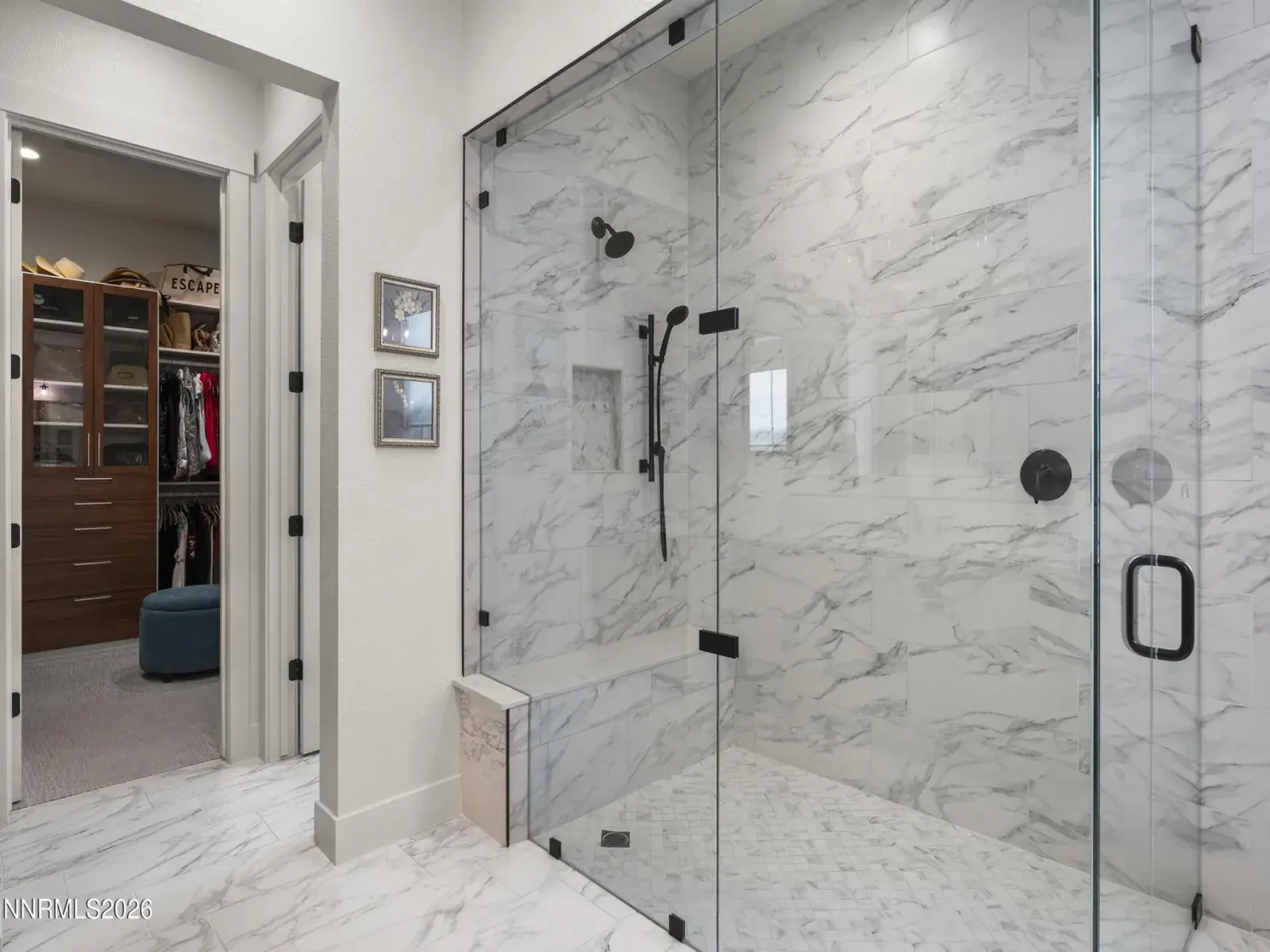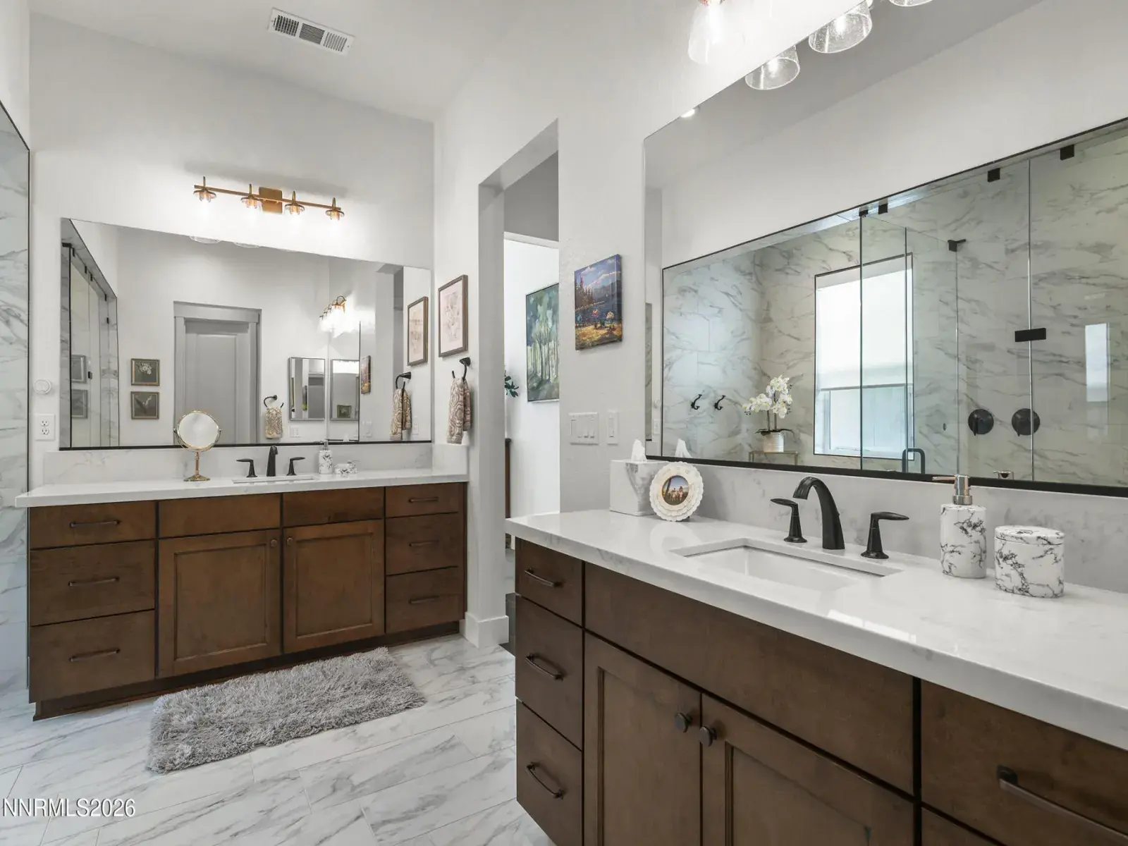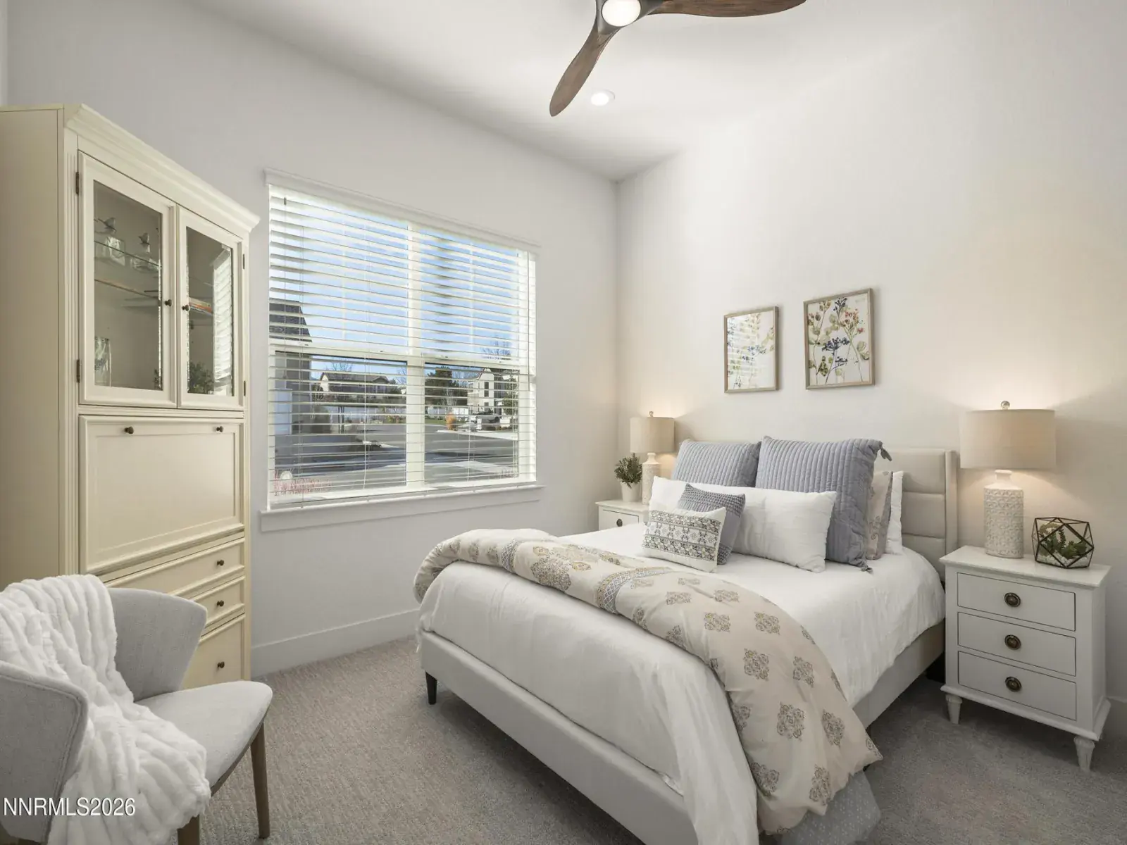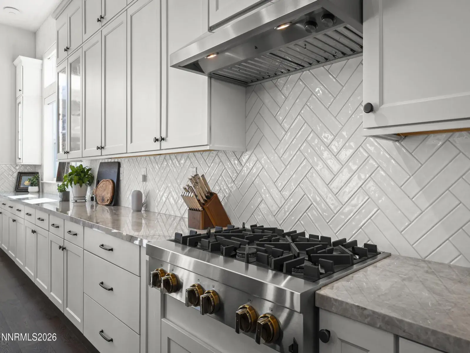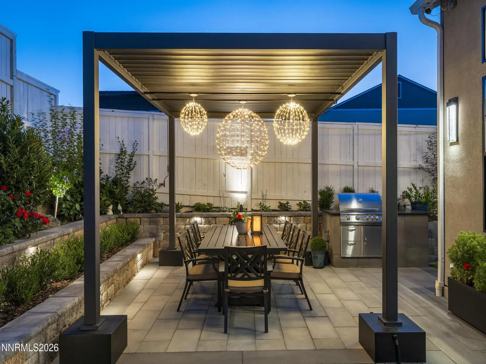 Experience elevated living in the prestigious gated community of Rancharrah. This impeccably upgraded residence offers 3 bedrooms, 3 full en-suite bathrooms, and an elegant powder room for guests—thoughtfully designed for both privacy and entertaining. No detail has been overlooked, with high-end finishes throughout, including beautiful oak flooring and a stunning chef’s kitchen anchored by Taj Mahal quartzite countertops and fully upgraded JennAir appliances. The dramatic floor-to-ceiling stone fireplace serves as the show-stopping focal point of the great room, creating the perfect setting for cozy evenings, while the dining area—highlighted by a striking chandelier—flows seamlessly and fills the space with natural light. Custom California Closets and added built-in shelving in the guest suites maximize storage while maintaining clean, designer lines. Hunter Douglas shades and shutters have been upgraded throughout, offering both sophistication and functionality. The backyard is a true retreat—professionally completed with a tranquil water feature, fire pit, built-in barbecue, and full drip irrigation system for effortless maintenance. Ideal for entertaining or relaxing under Reno’s expansive skies. Residents enjoy exceptional resort-style amenities at The Club at Rancharrah, just a short distance away, featuring a pool with cantina and poolside service, private dining at Nineteen 57, a three-level fitness center with classes, spa and salon, pickleball and bocce courts, and curated social events for all ages. Beyond the gates, The Village at Rancharrah offers fine dining, boutiques, and wellness services. Ideally located near Bartley Ranch Regional Park, Reno-Tahoe International Airport, Midtown, and Downtown Reno—with Mt. Rose Ski Tahoe just 18 minutes away and Lake Tahoe only 40 minutes from your door. Don’t miss your opportunity to own in one of Reno’s most sought-after luxury communities. This home offers modern elegance, thoughtful upgrades, and turnkey convenience.