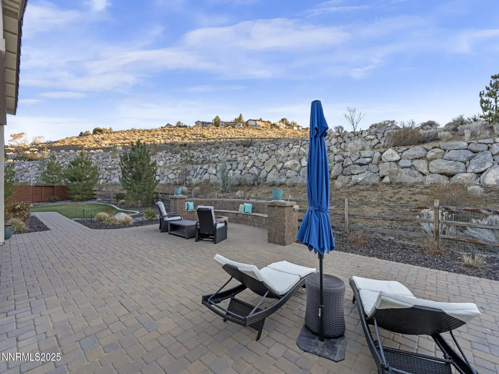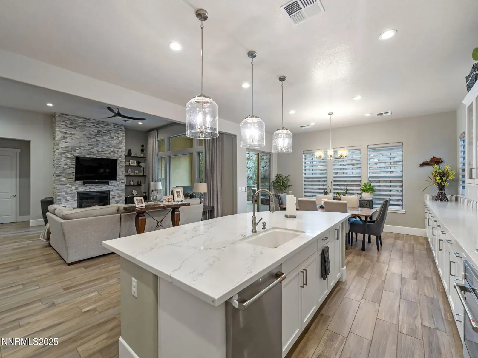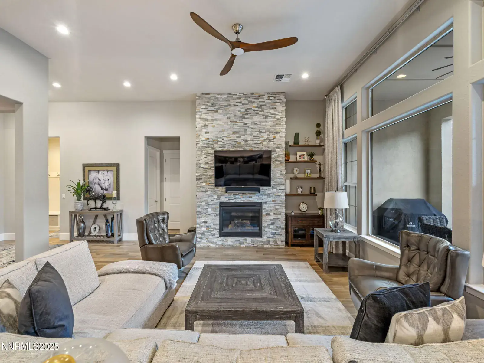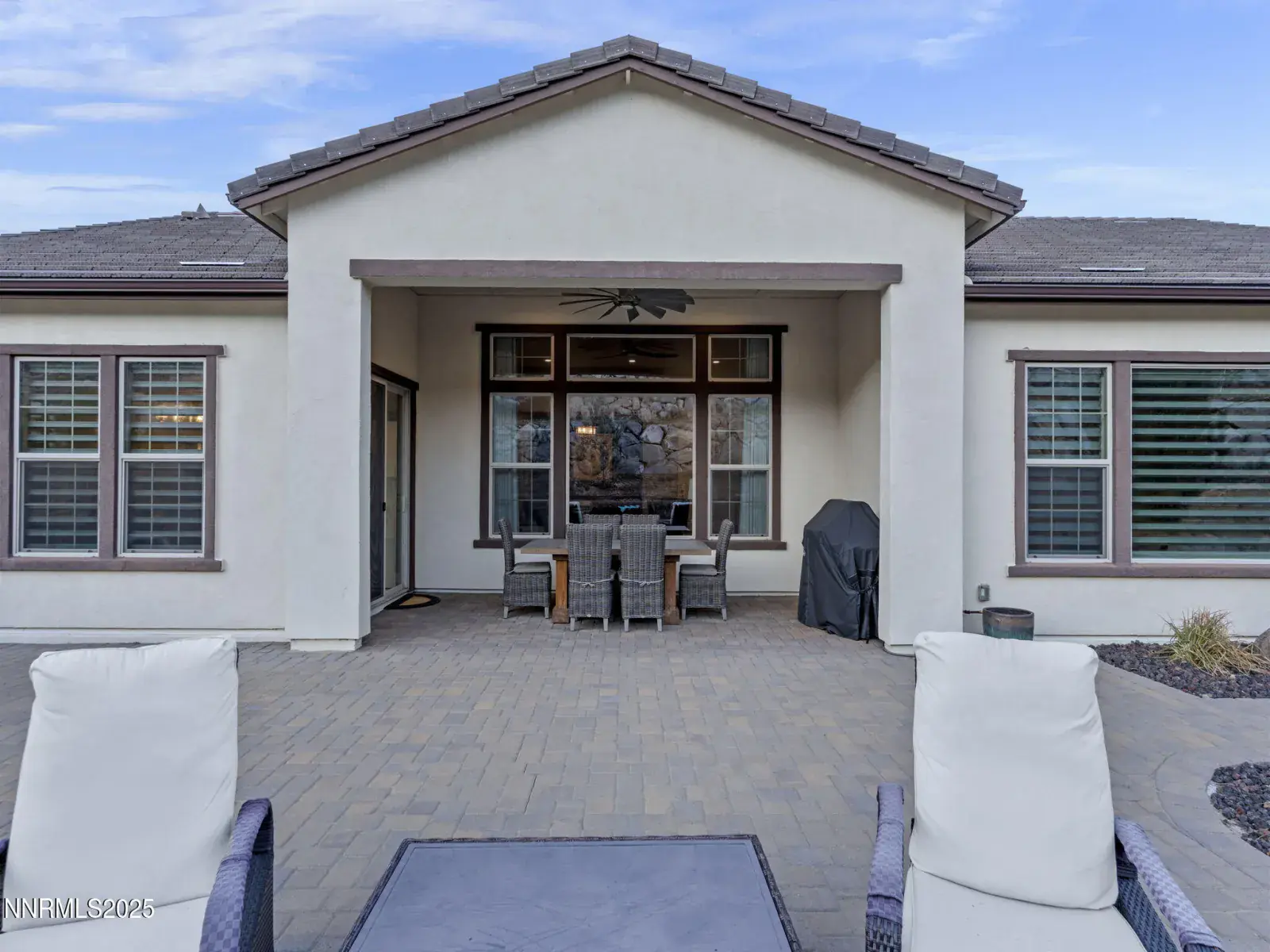 Nestled within the prestigious, gated enclave of Whispering Canyon in Caughlin Ranch, this stunning single-story residence offers an exceptional blend of luxury, comfort, and serene natural beauty. Set on a beautifully landscaped quarter-acre lot, the home enjoys a peaceful, private setting with breathtaking views—an ideal retreat while remaining conveniently close to all that Reno has to offer. Designed for both everyday living and elegant entertaining, the backyard is perfectly manicured and thoughtfully appointed with a covered loggia and a gas fire pit, creating an inviting space to unwind, host gatherings, or simply enjoy the quiet surroundings. The sense of calm and privacy continues throughout the interior, where soaring ceilings and an open great-room floor plan create a bright, welcoming atmosphere. Walls of windows flood the home with natural light, enhanced by custom automated window coverings for effortless comfort and privacy. The great room is anchored by a striking fireplace featuring a fully custom tile surround—both a focal point and a statement of refined design. The kitchen is truly the heart of the home, showcasing a massive center island with seating for six or more, high-end appliances, a custom designer backsplash, and an abundance of cabinetry. Whether hosting a dinner party or enjoying a casual morning, this space is as functional as it is beautiful. The primary suite is a private sanctuary, generously sized and complemented by a spa-inspired bathroom. Indulge in dual vanities, a dedicated makeup area, an oversized soaking tub, and a luxurious glass-enclosed shower—designed for relaxation and everyday indulgence. Completing the home is an oversized three-car garage, thoughtfully equipped with an EV charger, offering both convenience and future-ready functionality. This exceptional property combines timeless design, modern amenities, and a coveted Whispering Canyon location—an opportunity to enjoy refined single-level living at its finest.
