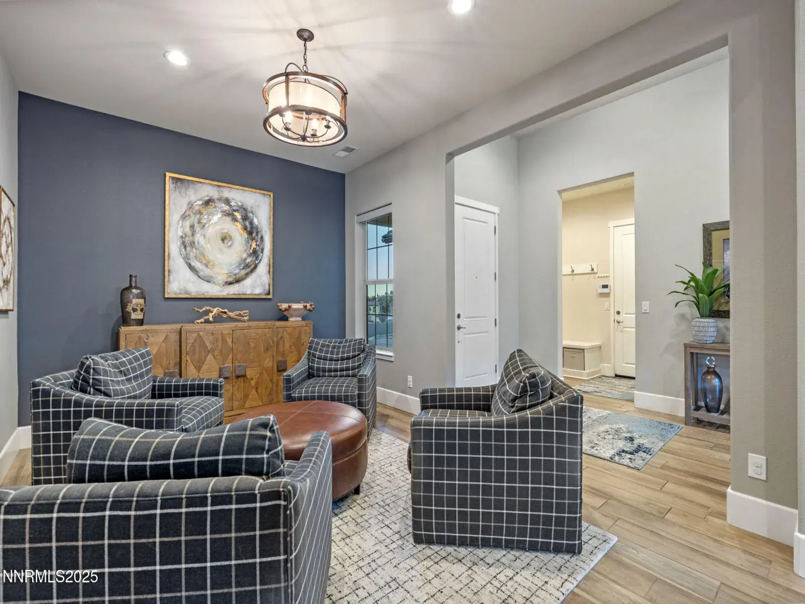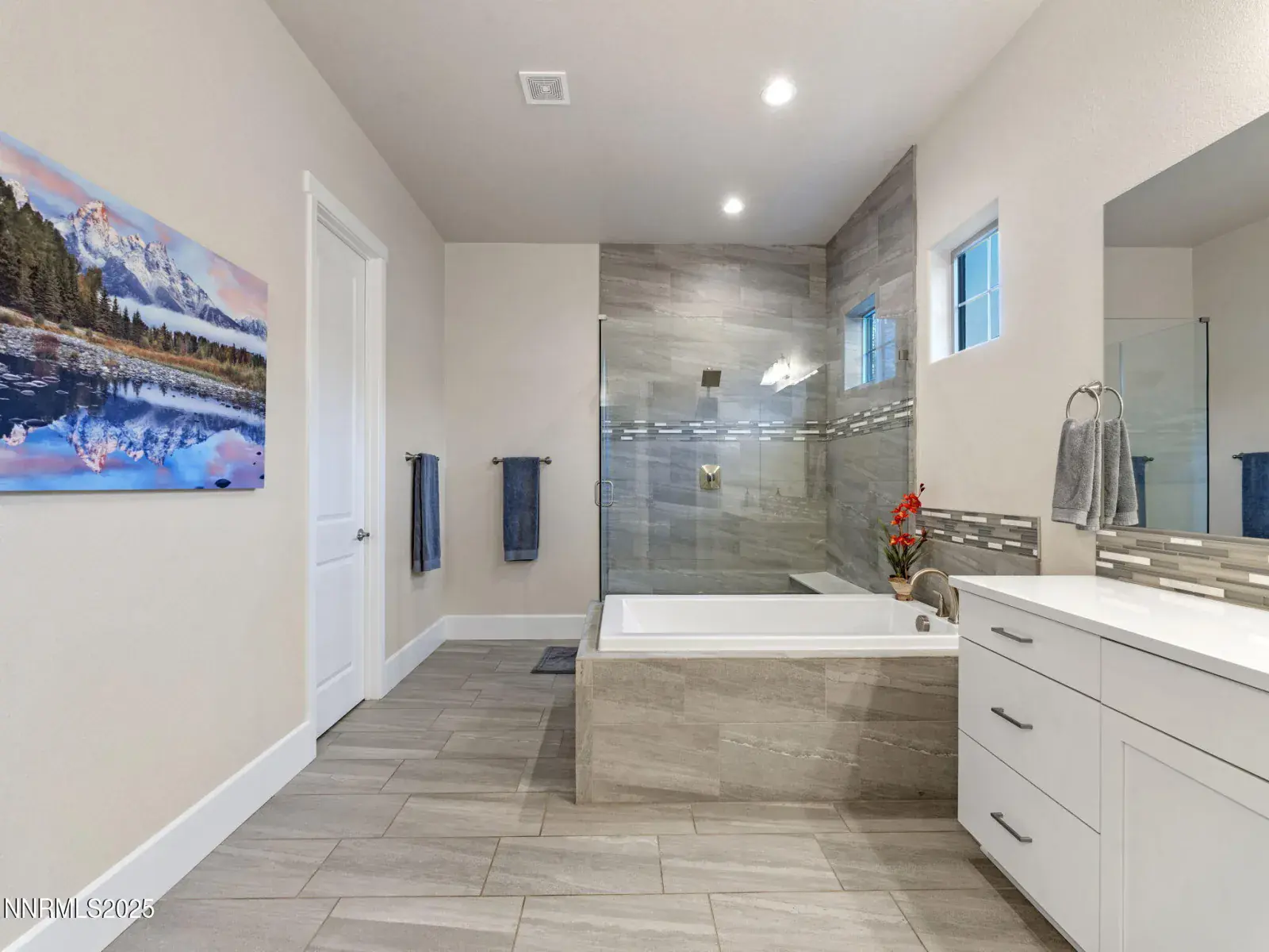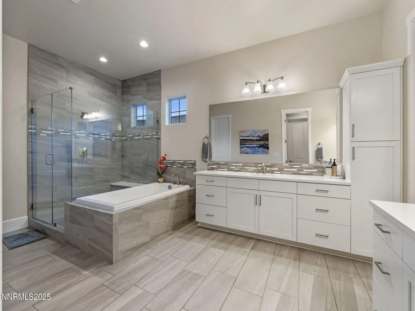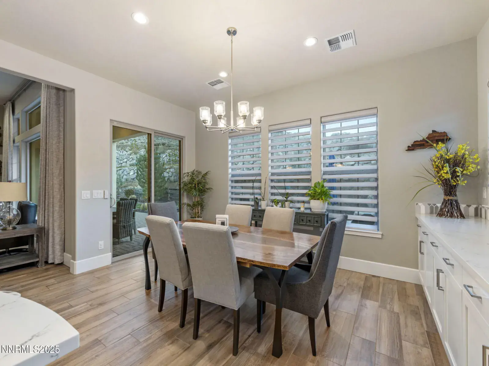 Nestled within the prestigious, gated enclave of Whispering Canyon in Caughlin Ranch, this stunning single-story residence offers an exceptional blend of luxury, comfort, and serene natural beauty. Set on a beautifully landscaped quarter-acre lot, the home enjoys a peaceful, private setting with breathtaking views—an ideal retreat while remaining conveniently close to all that Reno has to offer. Designed for both everyday living and elegant entertaining, the backyard is perfectly manicured and thoughtfully appointed with a covered loggia and a gas fire pit, creating an inviting space to unwind, host gatherings, or simply enjoy the quiet surroundings. The sense of calm and privacy continues throughout the interior, where soaring ceilings and an open great-room floor plan create a bright, welcoming atmosphere. Walls of windows flood the home with natural light, enhanced by custom automated window coverings for effortless comfort and privacy. The great room is anchored by a striking fireplace featuring a fully custom tile surround—both a focal point and a statement of refined design. The kitchen is truly the heart of the home, showcasing a massive center island with seating for six or more, high-end appliances, a custom designer backsplash, and an abundance of cabinetry. Whether hosting a dinner party or enjoying a casual morning, this space is as functional as it is beautiful. The primary suite is a private sanctuary, generously sized and complemented by a spa-inspired bathroom. Indulge in dual vanities, a dedicated makeup area, an oversized soaking tub, and a luxurious glass-enclosed shower—designed for relaxation and everyday indulgence. Completing the home is an oversized three-car garage, thoughtfully equipped with an EV charger, offering both convenience and future-ready functionality. This exceptional property combines timeless design, modern amenities, and a coveted Whispering Canyon location—an opportunity to enjoy refined single-level living at its finest.