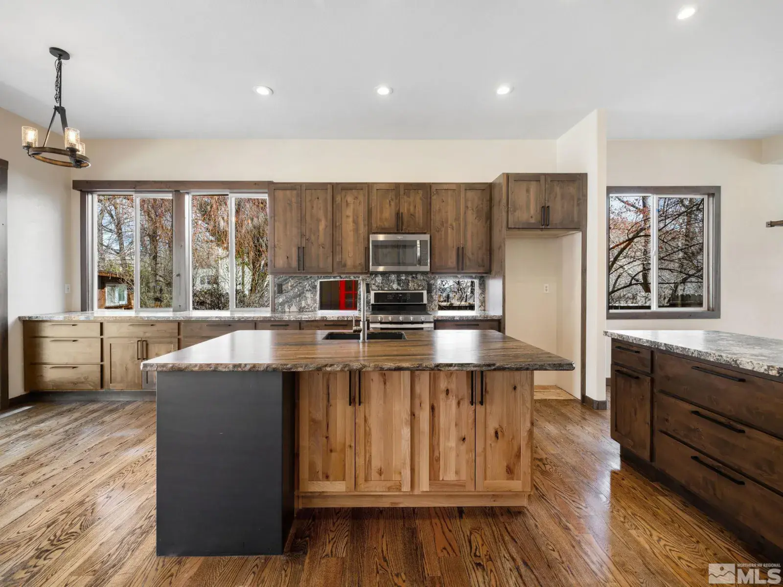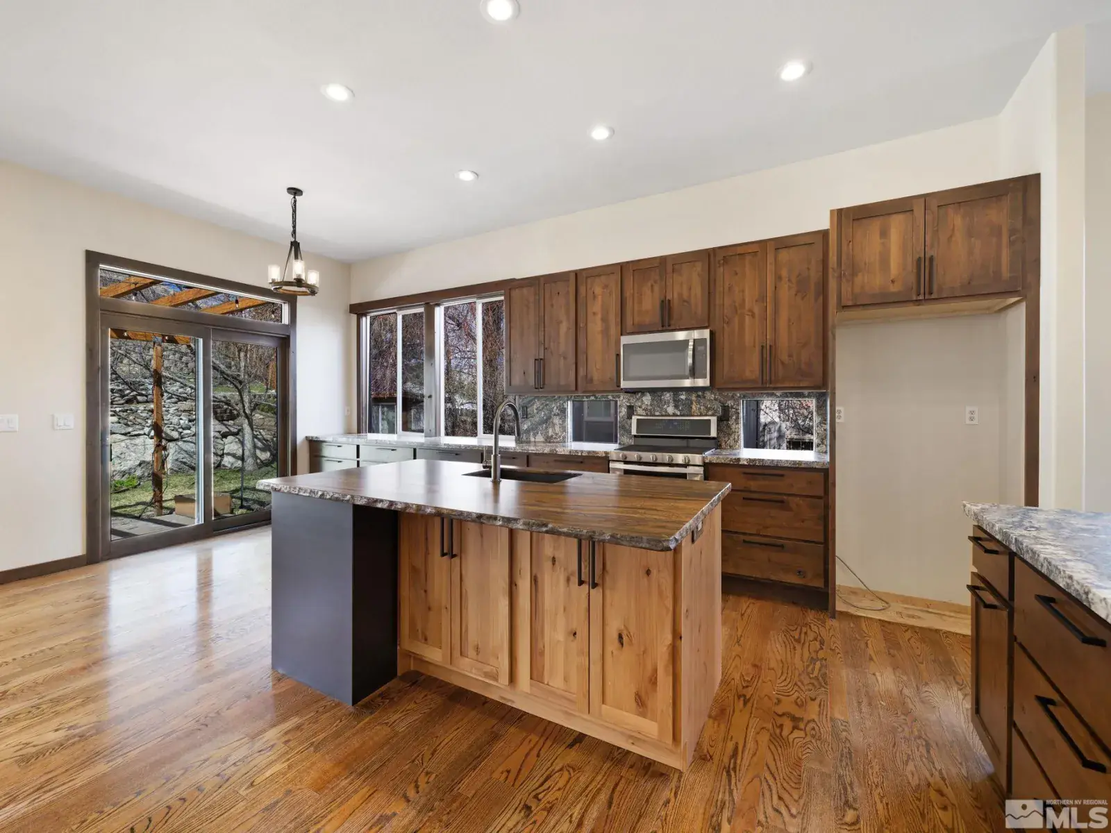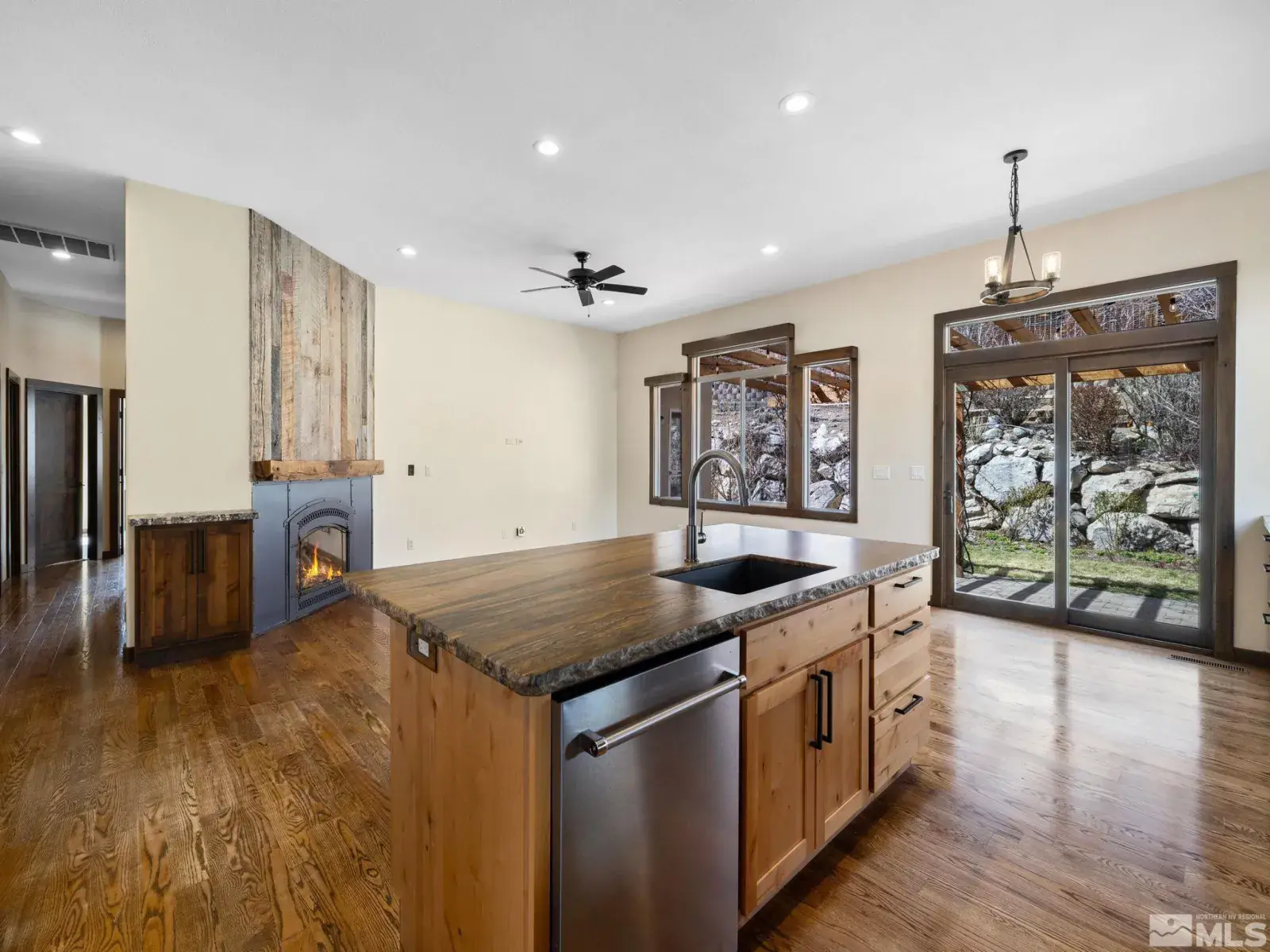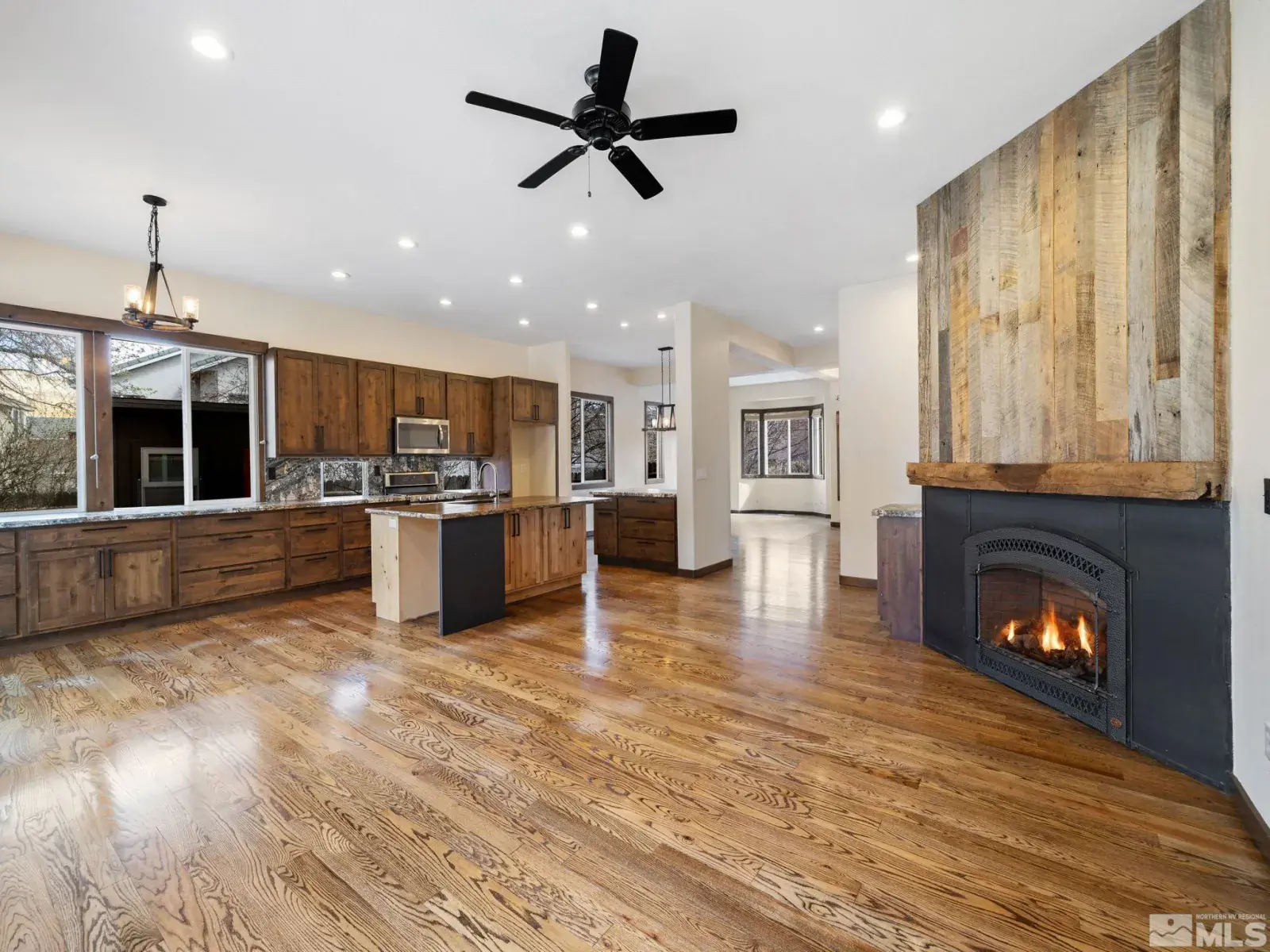 A rare find in West Reno—single-story living with no HOA and endless outdoor adventures at your doorstep! Nestled along the scenic Truckee River, this beautifully updated home offers easy access to fishing, parks, and renown trails for walking and OHV fun. Inside, the completely reimagined open-concept living space is an absolute showstopper, showcasing a one-of-a-kind kitchen remodel with expansive Knotty Alder custom cabinets, exquisite Quartzite & Granite countertops, and top-tier finishes., The transformation continues throughout with stunning ¾-inch hardwood floors, a statement-making custom fireplace, LED lighting, and Knotty Alder doors and baseboards, all designed to create a warm yet sophisticated ambiance. Plus, extensive storage ensures every inch of the home is as functional as it is beautiful. The backyard is a gardener’s paradise with 13 flourishing fruit trees and vibrant vegetable gardens all with no rear neighbors for ultimate privacy. Outside, enjoy a paver driveway and covered back patio, full fencing, oversized 3-car garage with RV parking, and wiring for a hot tub. This West Reno retreat blends natural beauty with modern comfort—don’t miss your chance to call it home!