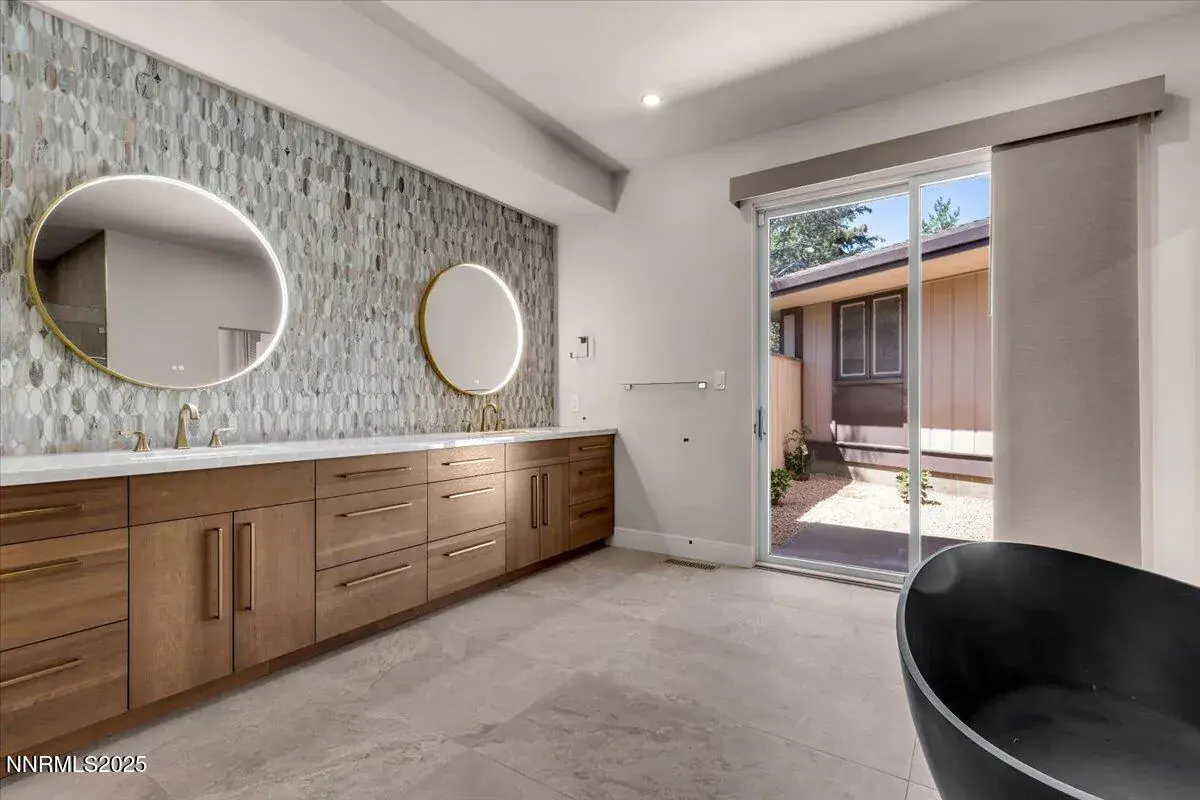 Stunning completely remodeled one-story home on the 5th hole of Lakeridge Golf Course. Located in a private enclave with sweeping city, mountain, and golf course views out oversized windows that also bring in lots of natural light. The extensive remodel includes new wood flooring, custom cabinets, LED lighting and fixtures, bathrooms, kitchen and appliances, new roof and sewer lines. This 2.4 acre enclave of only 4 homes is surrounded by the 3rd, 4th, and 5th holes of Lakeridge GC and is only minutes from shopping, dining, schools and Reno/Tahoe Airport. A private driveway leads into a spacious 2 car garage. The open great room features a remote controlled gas fireplace with a stunning 200+ year old wood mantle, and floor to ceiling windows which provides lots of natural lights and access to the expansive deck overlooking the 3rd fairway of Lakeridge Golf Course. A remodeled kitchen with custom cabinets features quartz countertops and island, Sup-Zero appliances and under-cabinet lighting. The large primary suite offers views of downtown, the mountains and golf course from the windows and a private deck. It includes a nook that could be used as a office. It has a spacious remodeled bathroom with separate tub and shower with beautiful stonework walls, double sinks, and large walk-in closet with custom cabinetry throughout. Enjoy outdoor living with incredible views of the city, mountains, and golf course on the decks off the living room and primary bedroom. A space for more lounging is in the interior courtyard. Monthly assessment includes water, landscaping maintenance, irrigation and snow removal.