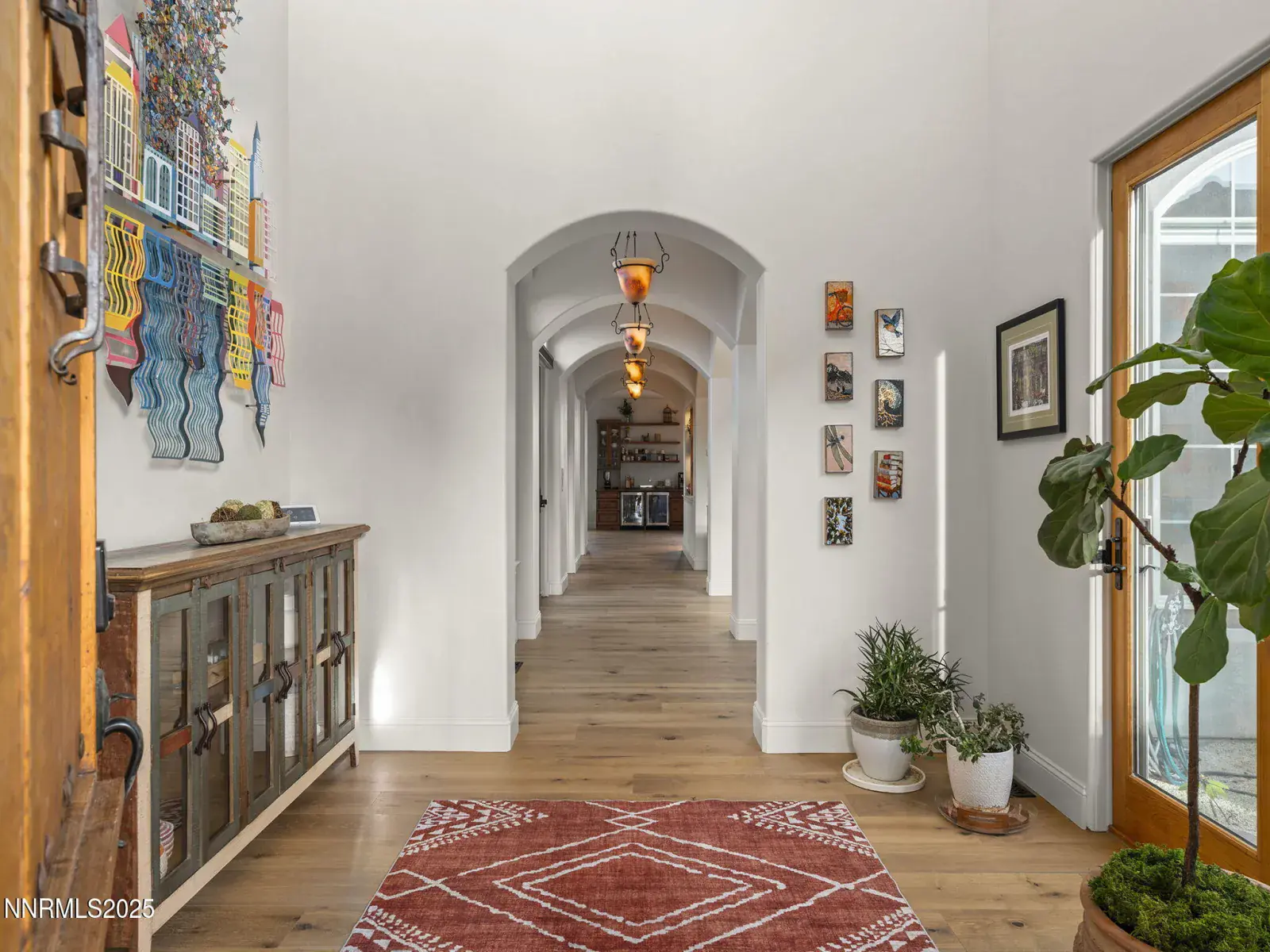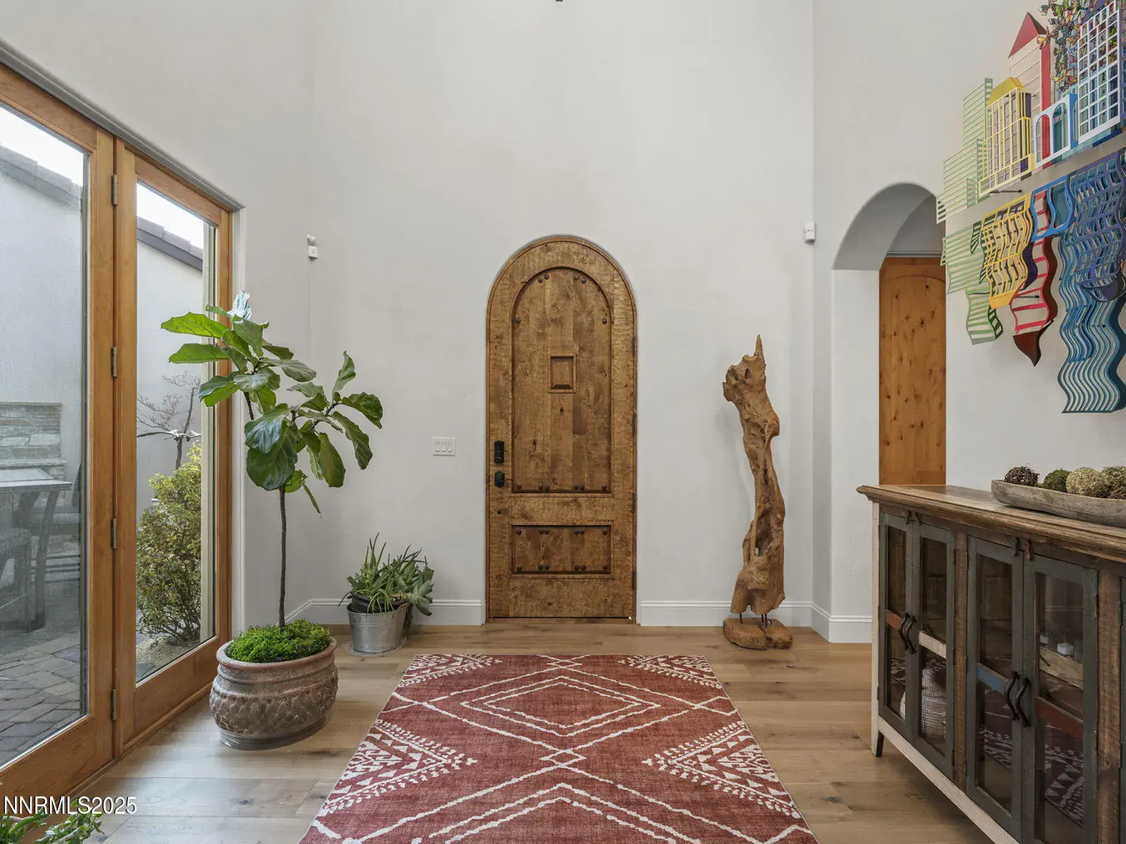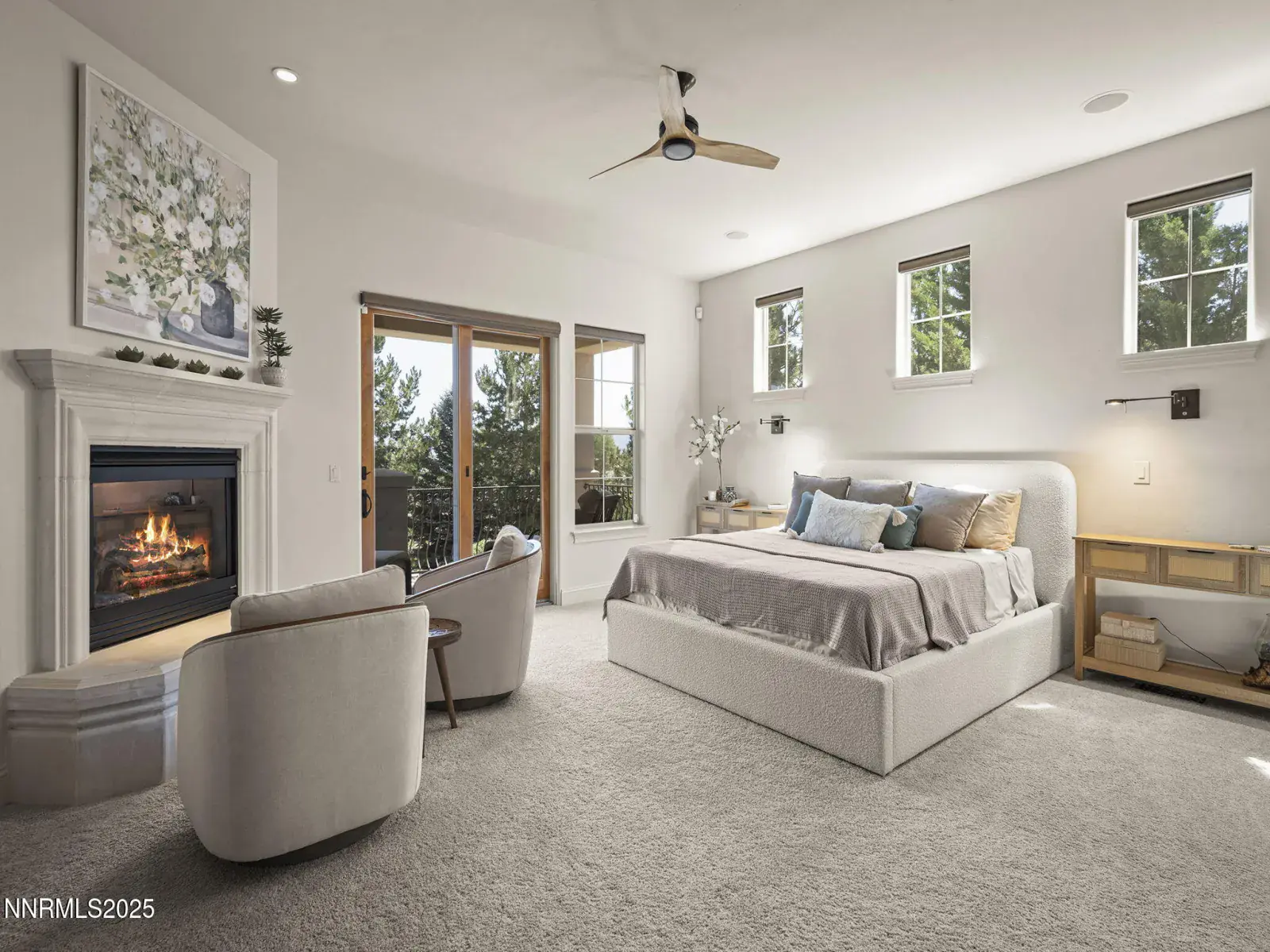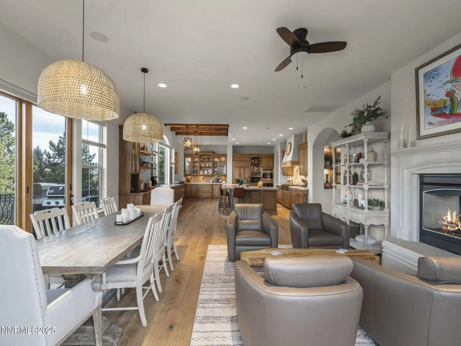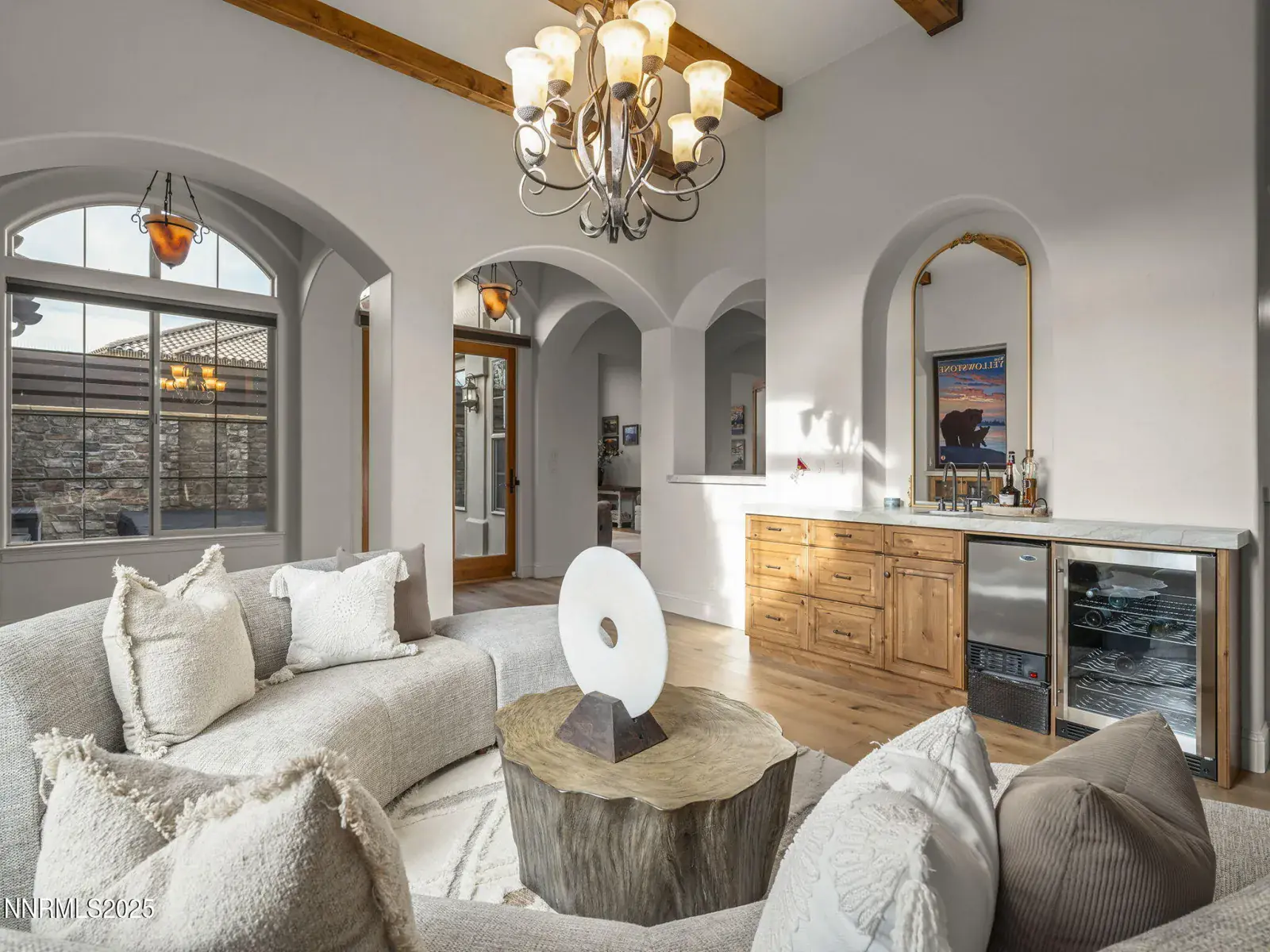 Welcome to this stunning luxury estate property, located in the prestigious Saddlehorn community. Nestled on a serene cul-de-sac, this exquisite 5 bedroom, 5 1/2 bath residence has undergone a multitude of designer renovations, offering the finest in upscale living. Enjoy the elegance of brand new engineered hardwood flooring spanning approximately 3,000 sq ft across the first-floor living areas, enhancing both style and durability.The chef’s kitchen is a true showpiece—featuring leathered Taj Mahal quartzite countertops, two built-in refrigerators, dual Bosch dishwashers, warming drawers, added custom soft-close cabinetry, and three spacious pantries. Expanded custom built-ins elevate both functionality and elegance, making this kitchen a culinary dream. Relax and unwind in the spa-inspired primary suite on the main level which includes a steam shower, gas fireplace, custom lighting, and sophisticated tilework. Downstairs you will find a spacious in-law suite including its own kitchenette with l Leather Taj Mahal quartzite counter, new sink, dishwasher, and beverage fridge- plus a versatile bonus space perfect for a game room, home theater, or additional living quarters creating the ultimate entertaining space, and two additional private bedrooms with ensuites. Additional interior highlights include a double-sided gas fireplace between the living and great rooms, a custom bunk room with exposed beam detail, a private man cave, updated designer lighting, and extensive electrical upgrades throughout. Step outside to enjoy the resort-style grounds—complete with an expanded paver patio, grand fountain, raised vegetable gardens, privacy hedging, and a swim spa with new pump & cover, custom decking for easy maintenance access. A built-in outdoor BBQ with griddle enhances alfresco living. Premium appliances include two washers, two dryers, five beverage refrigerators, and so much more. This turnkey luxury retreat combines timeless elegance with modern comfort in one of Reno’s most sought-after neighborhoods.