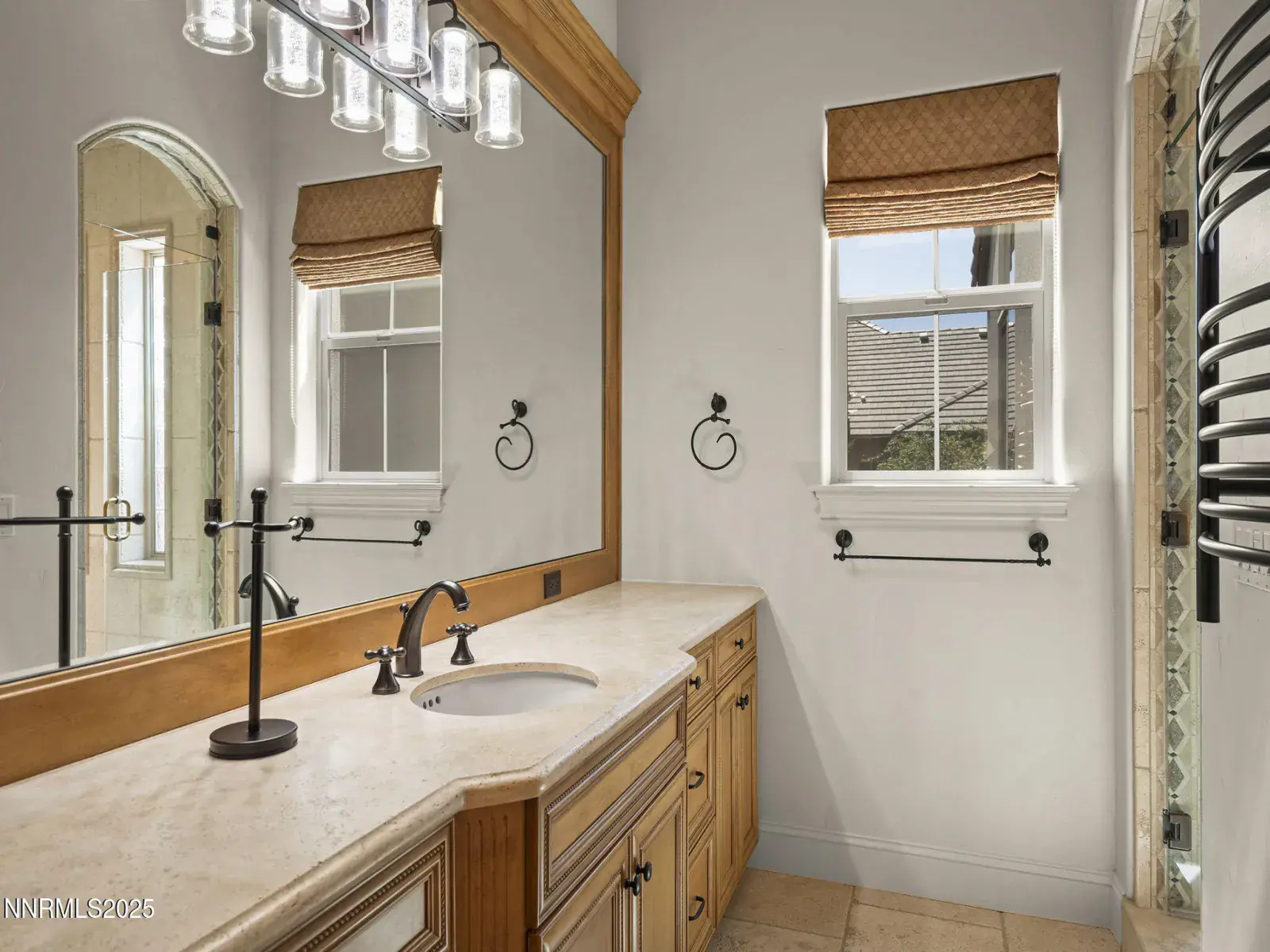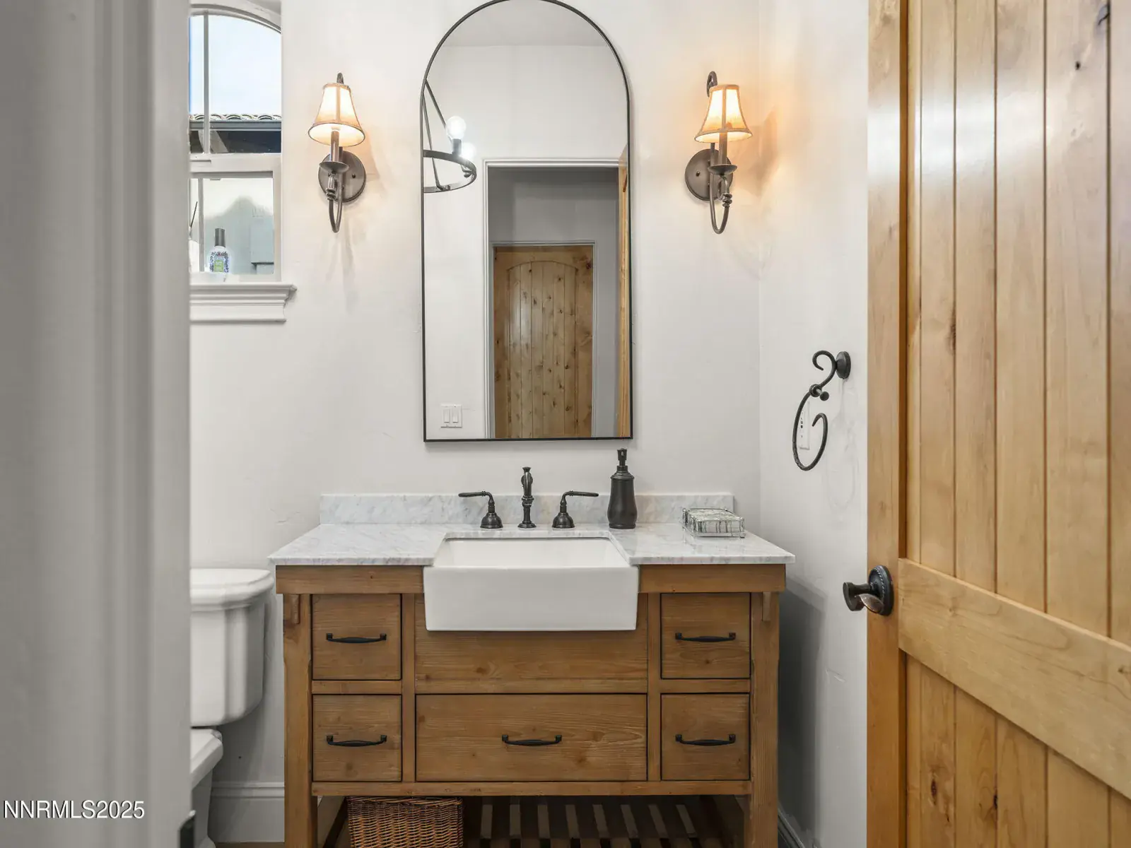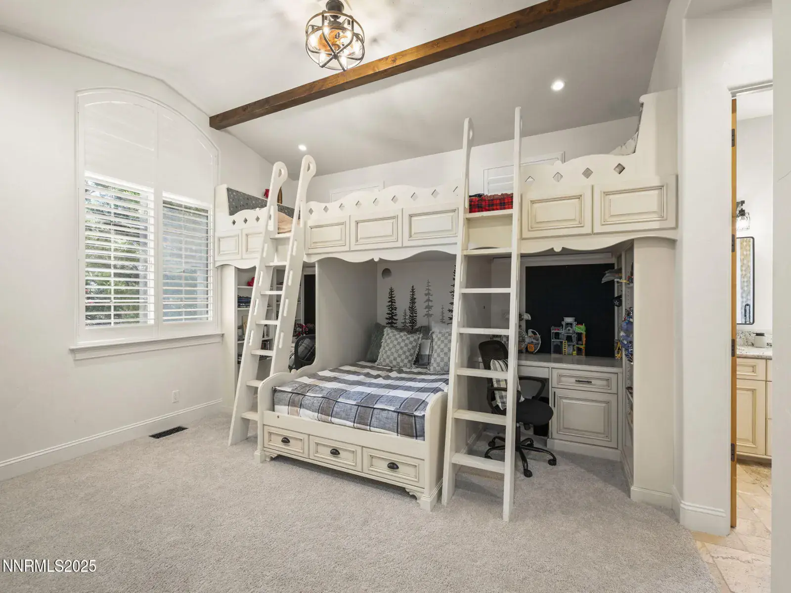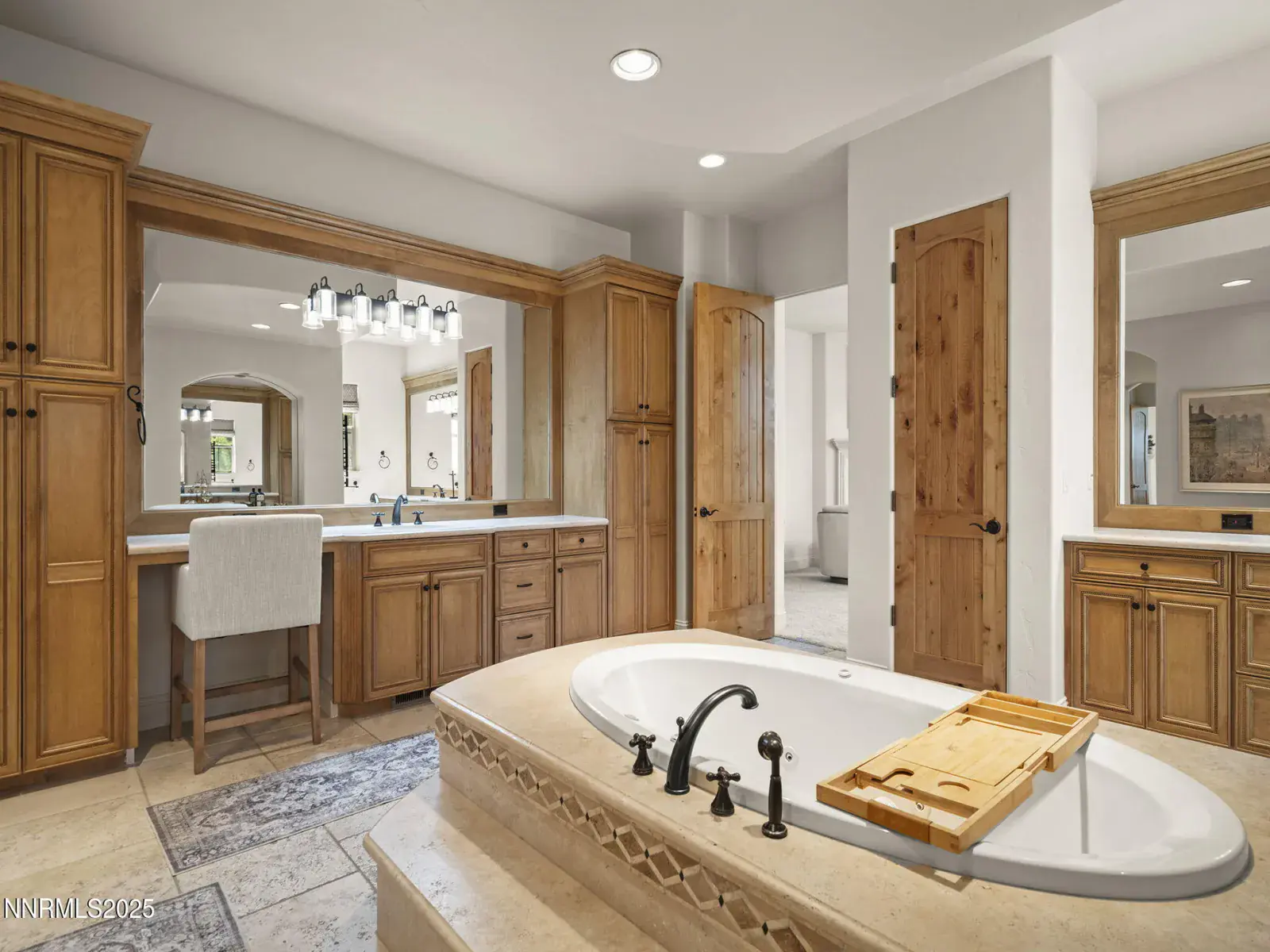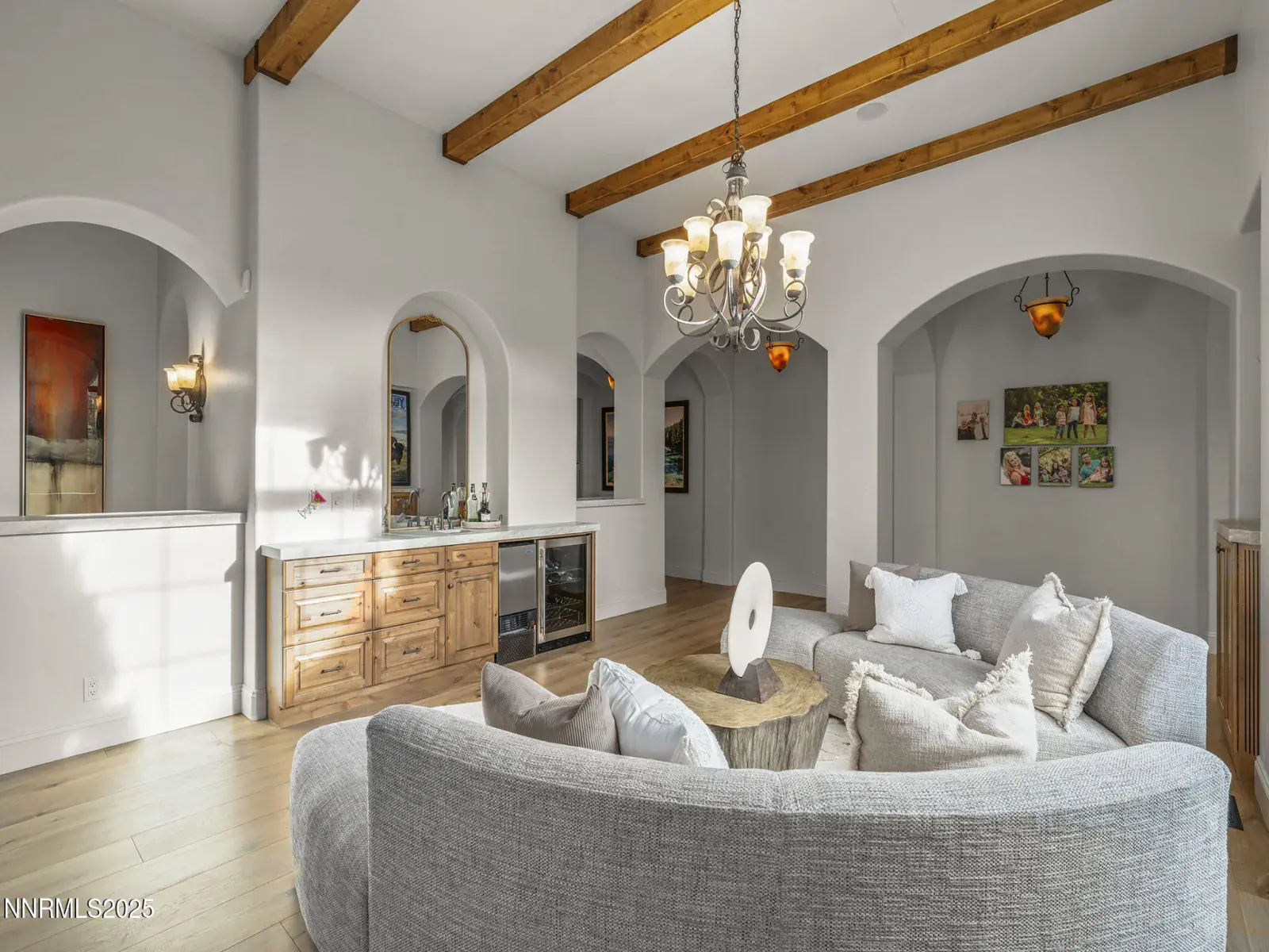 Welcome to this stunning luxury estate property, located in the prestigious Saddlehorn community. Nestled on a serene cul-de-sac, this exquisite 5 bedroom, 5 1/2 bath residence has undergone a multitude of designer renovations, offering the finest in upscale living. Enjoy the elegance of brand new engineered hardwood flooring spanning approximately 3,000 sq ft across the first-floor living areas, enhancing both style and durability.The chef’s kitchen is a true showpiece—featuring leathered Taj Mahal quartzite countertops, two built-in refrigerators, dual Bosch dishwashers, warming drawers, added custom soft-close cabinetry, and three spacious pantries. Expanded custom built-ins elevate both functionality and elegance, making this kitchen a culinary dream. Relax and unwind in the spa-inspired primary suite on the main level which includes a steam shower, gas fireplace, custom lighting, and sophisticated tilework. Downstairs you will find a spacious in-law suite including its own kitchenette with l Leather Taj Mahal quartzite counter, new sink, dishwasher, and beverage fridge- plus a versatile bonus space perfect for a game room, home theater, or additional living quarters creating the ultimate entertaining space, and two additional private bedrooms with ensuites. Additional interior highlights include a double-sided gas fireplace between the living and great rooms, a custom bunk room with exposed beam detail, a private man cave, updated designer lighting, and extensive electrical upgrades throughout. Step outside to enjoy the resort-style grounds—complete with an expanded paver patio, grand fountain, raised vegetable gardens, privacy hedging, and a swim spa with new pump & cover, custom decking for easy maintenance access. A built-in outdoor BBQ with griddle enhances alfresco living. Premium appliances include two washers, two dryers, five beverage refrigerators, and so much more. This turnkey luxury retreat combines timeless elegance with modern comfort in one of Reno’s most sought-after neighborhoods.