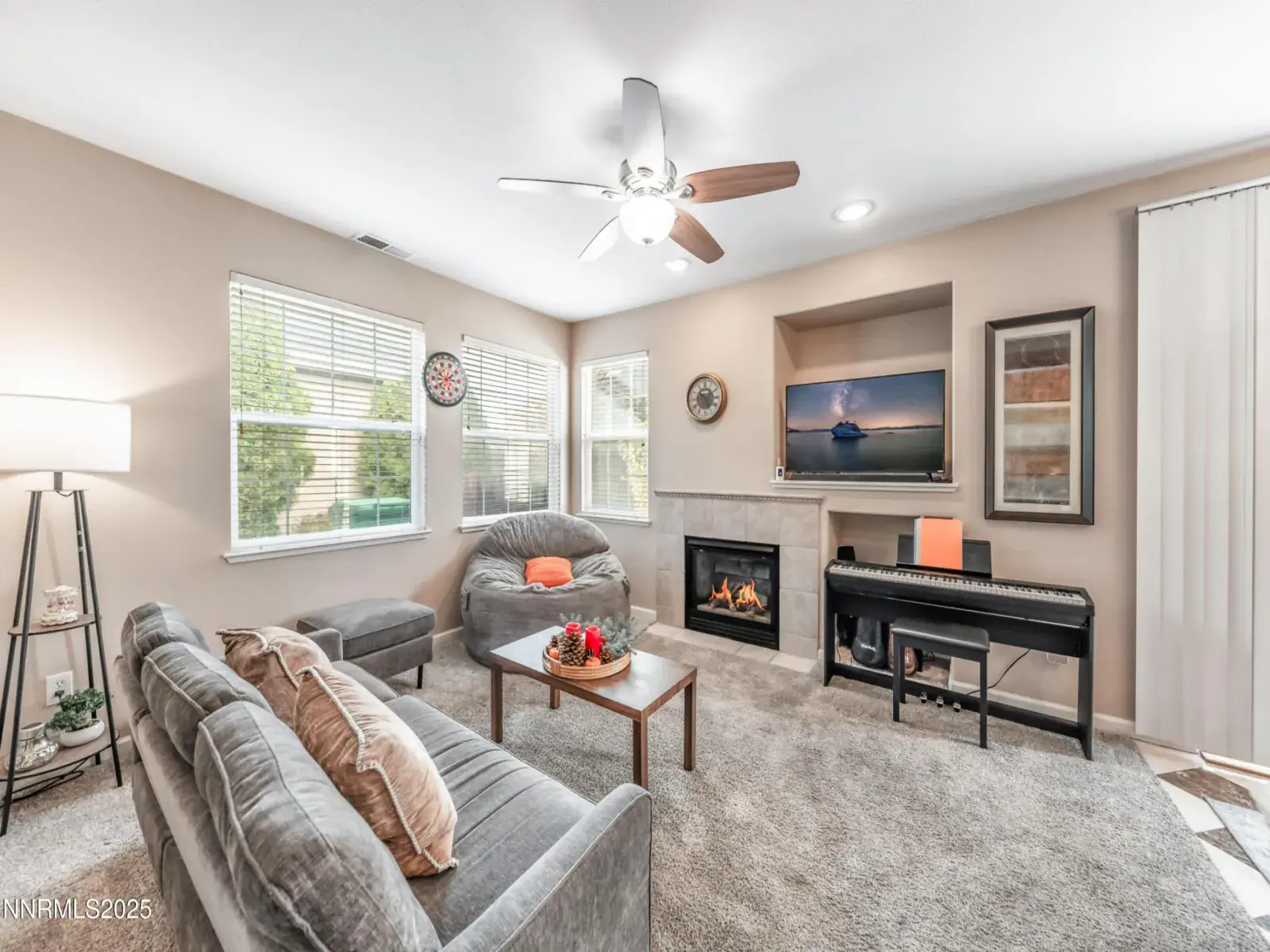 Welcome to this beautifully maintained 3-bedroom, 2.5-bath home perfectly situated in the desirable Northwest Reno community. Step inside to discover upgraded interiors featuring new travertine-style porcelain tile kitchen countertops, backsplash and breakfast bar. New stainless-steel appliances, upgraded kitchen cabinets, and gas fireplace that elevate the home’s modern appeal. Enjoy the ease of a dedicated laundry room complete with washer, dryer and shelving, plus a two-car garage with epoxy flooring for a clean, finished look. Primary bedroom offers a ceiling fan, walk in closet and new black marble bathroom floors and countertops. Relax in the fully fenced, low-maintenance backyard with pleasant views — ideal for quiet evenings or entertaining. The home’s location is unbeatable: walking distance to scenic trails, local stores, schools, and quick highway access. If you’re looking for a comfortable, move-in-ready home in Reno’s sought-after 89523 area, this one will check all the boxes. Low HOA with well-maintained landscaping, sidewalks, roads, additional parking, and walking paths. Ideal investment for rental and/or started home.