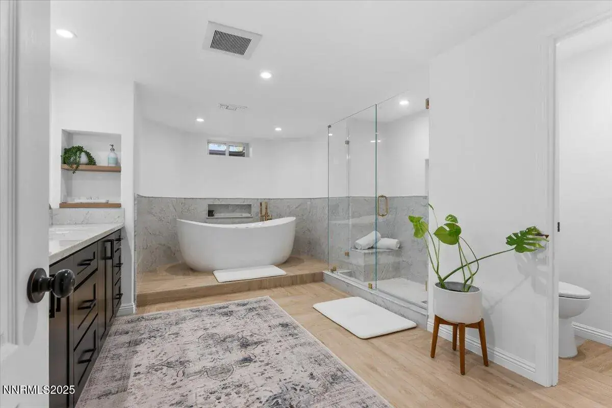 Beautifully maintained and thoughtfully updated, this Reno home offers versatile living with primary suite and two bedrooms on the main level and a second primary suite downstairs—perfect for multi-generational living or guests. Both primary bedrooms feature walk-in closets and relaxing jetted tubs. The renovated gourmet kitchen showcases modern fixtures and stainless appliances, quartzite countertops, and Zellige tile. Kitchen opens to bright living spaces with high ceilings. Enjoy city and mountain views with beautiful sunsets. The expansive lower level offers a second living room with a wet bar and flex rooms ideal for a home theater, office, or gym, plus a private entrance via the lower grass yard. The upstairs patio beckons with a cozy gas fire pit, elegant dining alcove, and mounted television, creating an idyllic setting for al fresco gatherings. Delight in the bounty of mature fruit trees—vibrant apple, cherry, peach, plum and grapes—offering seasonal harvests. Garage includes Tesla EV charger and ample storage. Tucked away in a tranquil enclave free from HOA constraints, this extraordinary home places you minutes from Jesse Beck Elementary, picturesque walking trails, the Washoe Valley Golf Course and much more.
