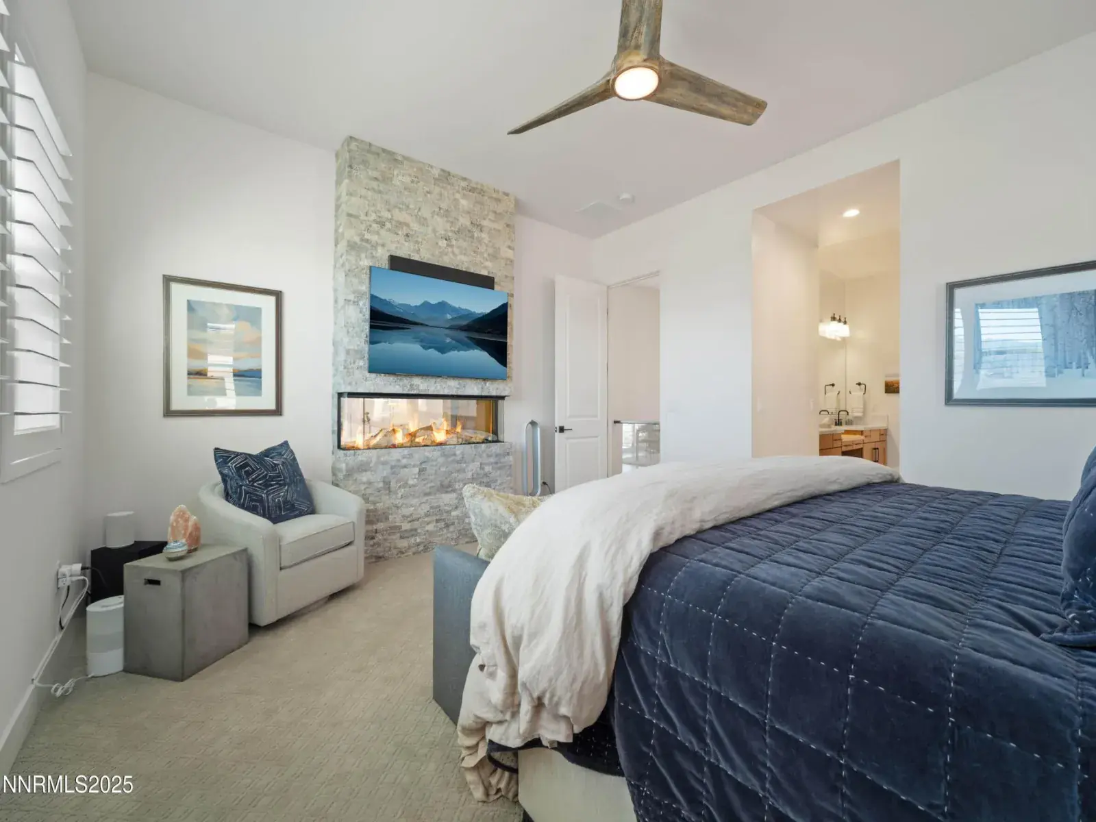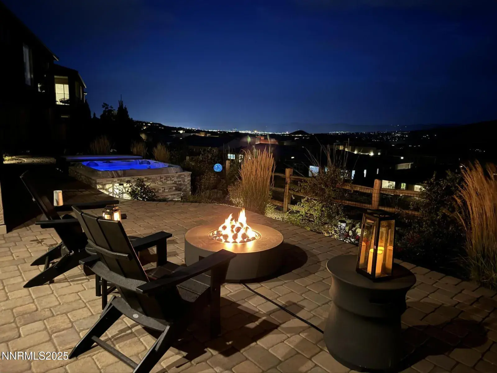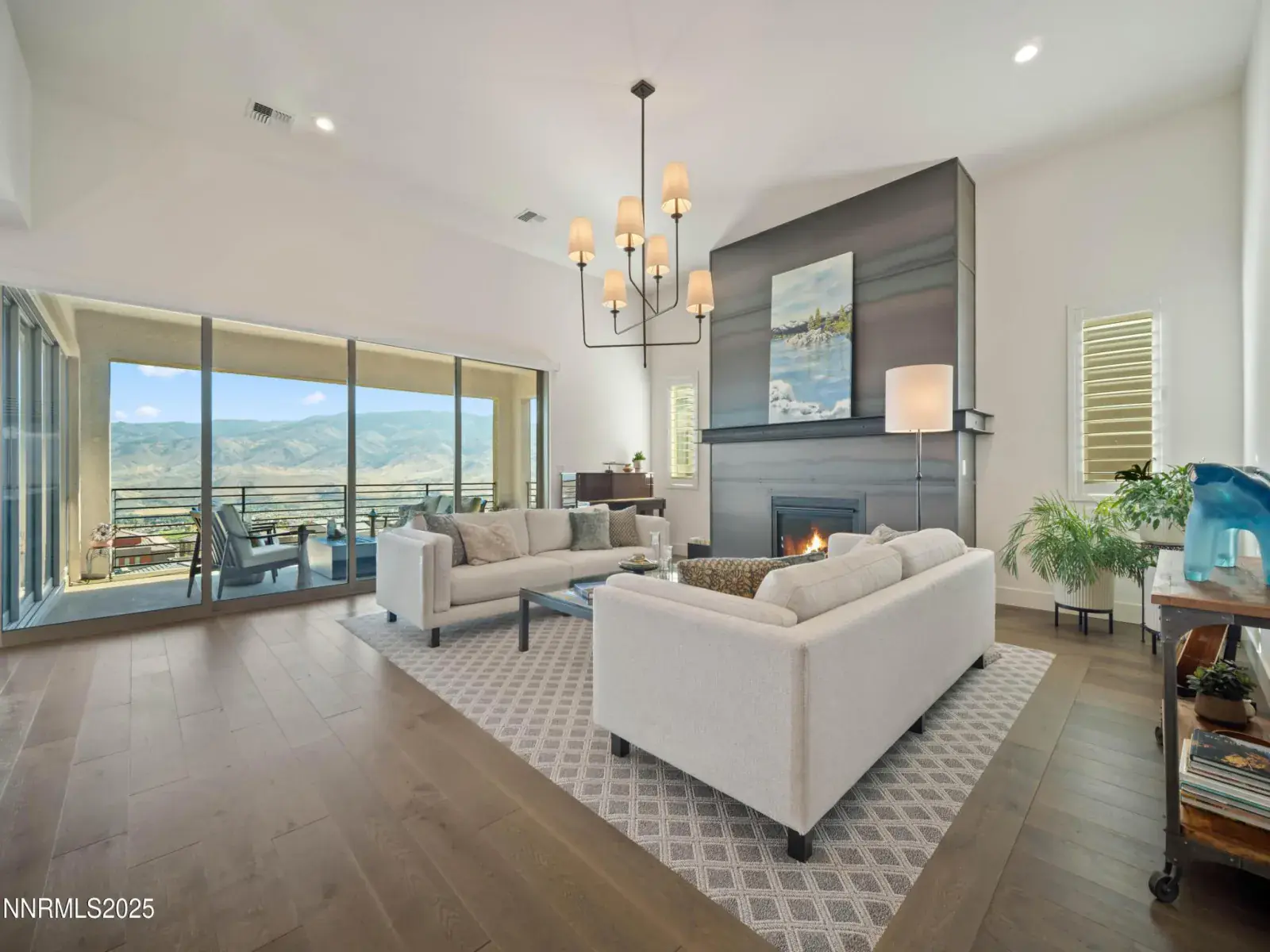 Stunning Modern Home in The Cliffs at Somersett. Discover luxury living in this exquisite 5-bedroom, 5.5-bathroom home located in the prestigious Cliffs community of Somersett. Perched on a premium 180-degree view lot, this meticulously designed residence boasts breathtaking mountain views, sophisticated architecture, and high-end finishes throughout. Enter through a private front courtyard into a spacious open floor plan highlighted by floor-to-ceiling picture windows, hand-troweled walls, and a striking rolled steel fireplace with I-beam detail. The custom glass and wood staircase sets a contemporary tone, while 7″ white oak plank flooring adds warmth and elegance. The entertainer’s kitchen is a showstopper, featuring a massive 9-foot quartz island, Sub-Zero refrigerator, JennAir appliances, double ovens, a walk-in pantry, and soft-close dovetail cabinetry. Designer light fixtures, black matte hardware, and Italian porcelain surfaces complete the sophisticated design. The walk-out basement includes a newly added fireplace with Italian tile surround, covered patio, and an in-ground hot tub overlooking stunning mountain vistas. Upstairs, enjoy seamless indoor-outdoor living with a multi-panel corner sliding door leading to a large deck—perfect for entertaining. The luxurious primary suite offers a cozy fireplace, spa-like walk-in shower, double vanities, and a spacious walk-in closet. Additional highlights include dual-zone HVAC with two furnaces and water heaters, smart home security, insulated interior walls for soundproofing, never-freeze roof de-icing system, TV/data smurf tubes, a pure water softener, and professionally designed WaterSense landscaping. With a 3-car garage, large laundry/mud room, and exceptional craftsmanship throughout, this home offers comfort, style, and functionality in one of Reno’s most sought-after communities.