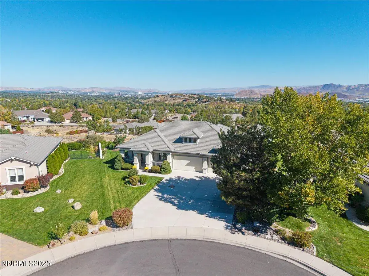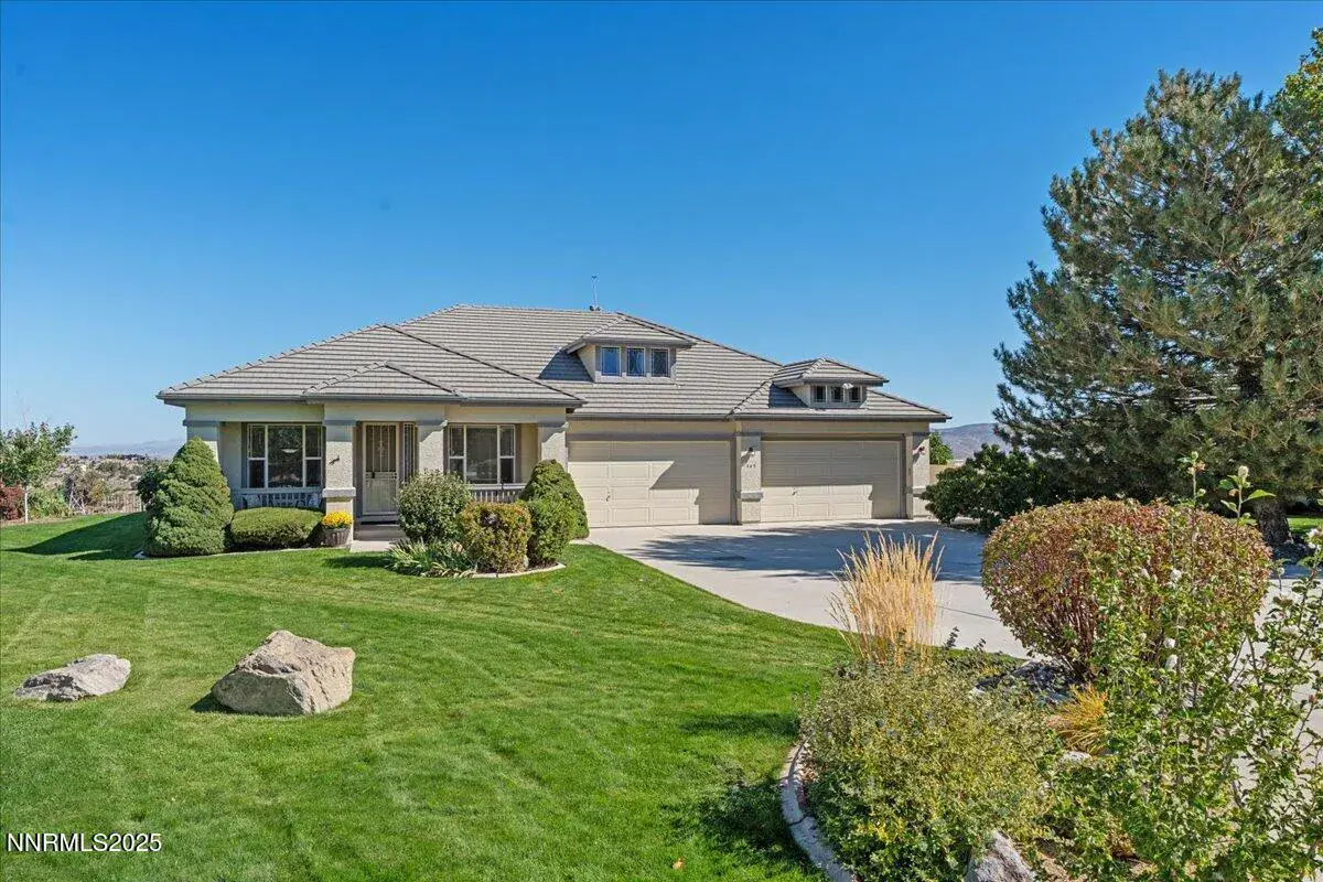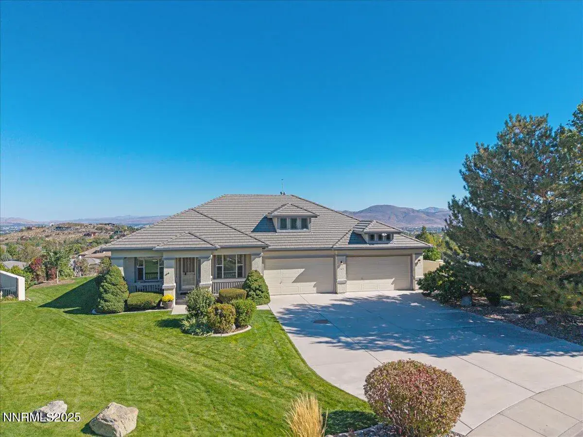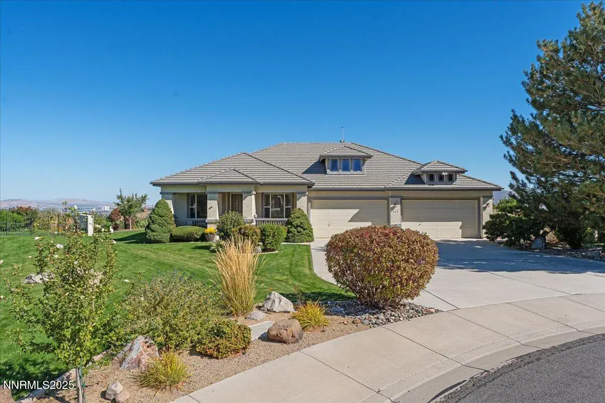 Experience single-level living at its finest in this beautifully situated home with a rare 4-car garage and breathtaking panoramic views of the city, mountains, and valley. Backs up to common area so no rear neighbors. Protected patio includes stubbed in gas for the BBQ (included), and is plumbed for a hot tub. The front is south facing so you can let mother nature do the driveway snow removal if needed! Luscious peach trees and a spot to grow your tomatoes on the east side of the home and roses and grapes on the west. Low maintenance landscaping so you can “lock and leave”. Washer and dryer are included (only a couple of years old), along with the refrigerator in the kitchen. Nestled on a quiet cul-de-sac on a spacious 0.37-acre lot, this property offers the perfect blend of privacy, tranquility, and convenience. Zoned for great schools and just minutes from shopping, golf, Mt. Rose Ski Resort, Lake Tahoe, and Reno-Tahoe International Airport, the location is ideal for both daily living and weekend adventures. Inside, the home has been freshly painted and is ready for your personal touch. Whether you’re relaxing on the back patio enjoying sweeping vistas, or making the most of the oversized garage for your vehicles, gear, or hobbies, this home checks all the boxes. Don’t miss this rare opportunity to own a view property in one of the area’s most desirable neighborhoods. New flooring is being installed and seller home warranty in place!