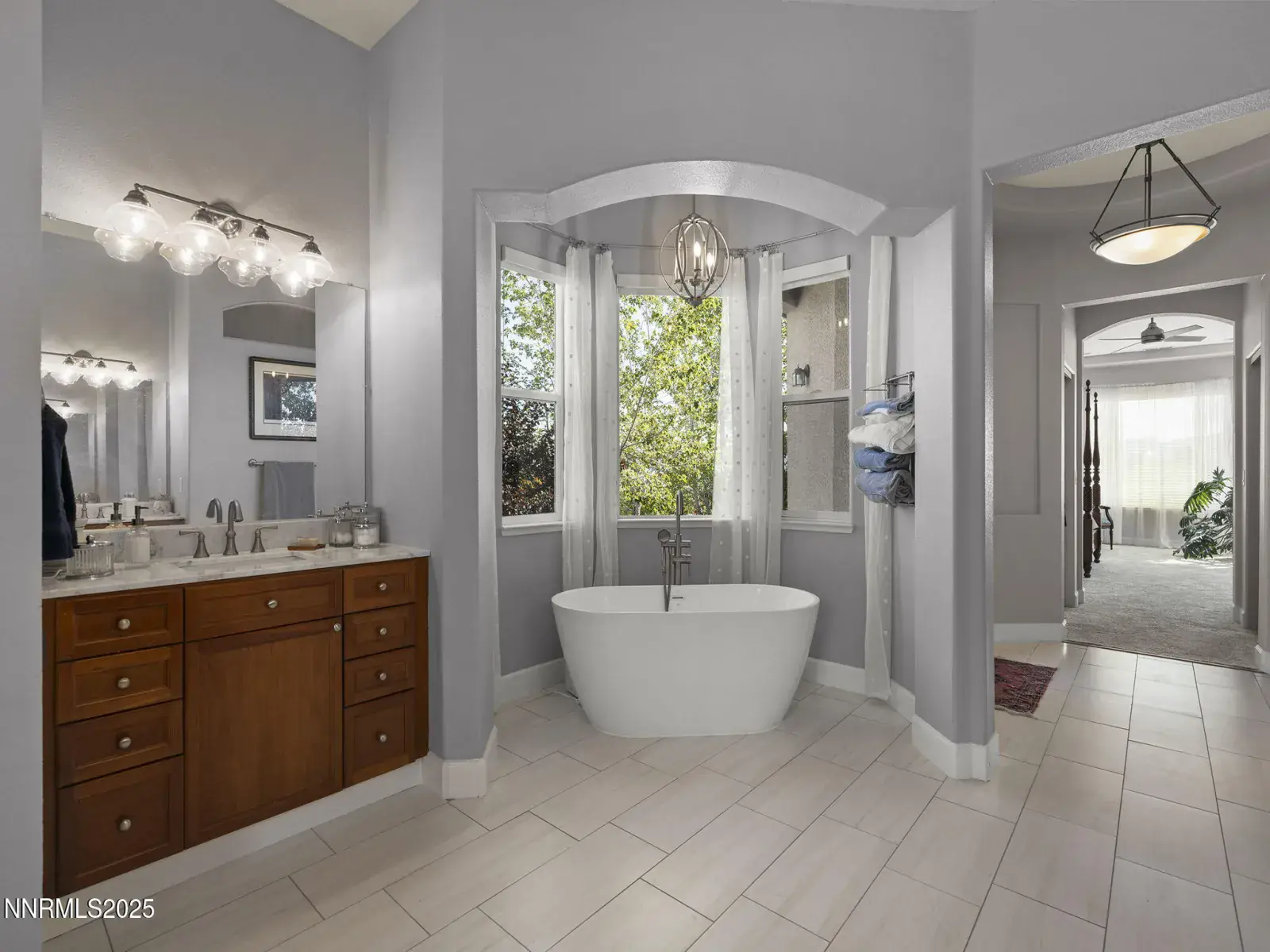 Retreat to the luxurious primary suite, where picture windows capture the views and the spa-like bath features a soaking tub framed by columns, dual vanities, and a generous walk-in closet. Additional bedrooms are spacious and private, perfect for family, guests, or a home office.