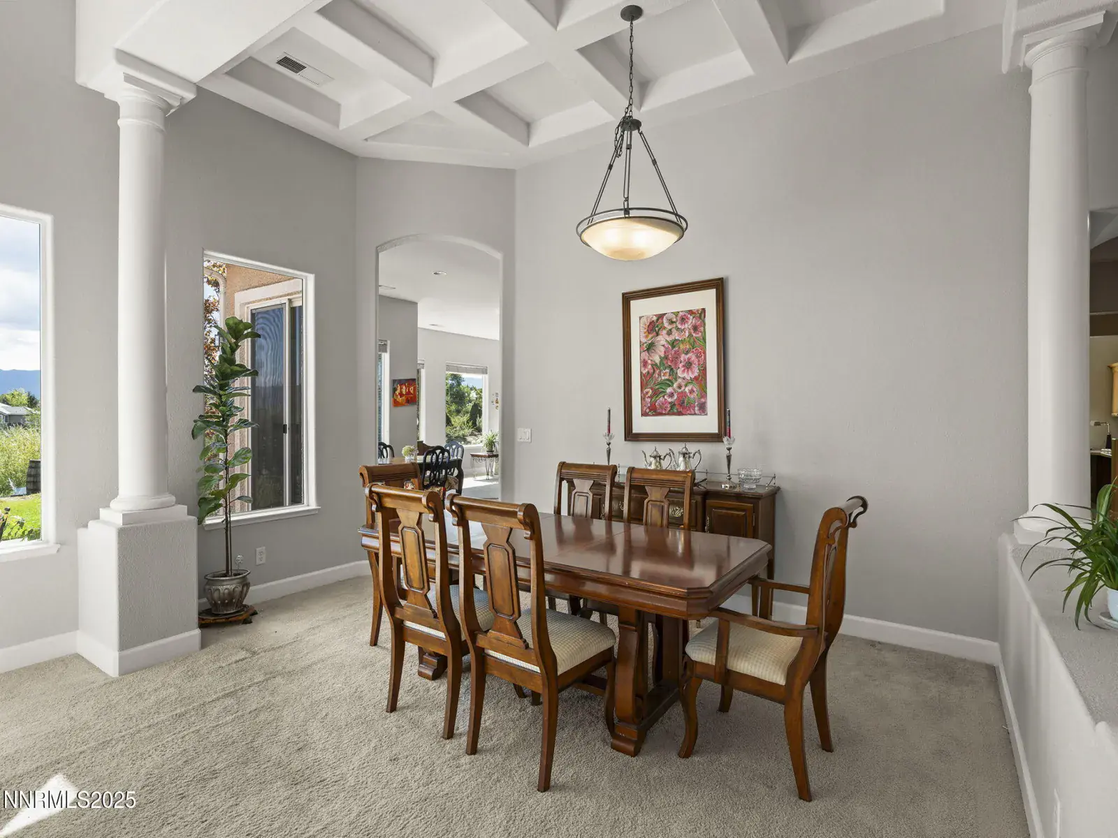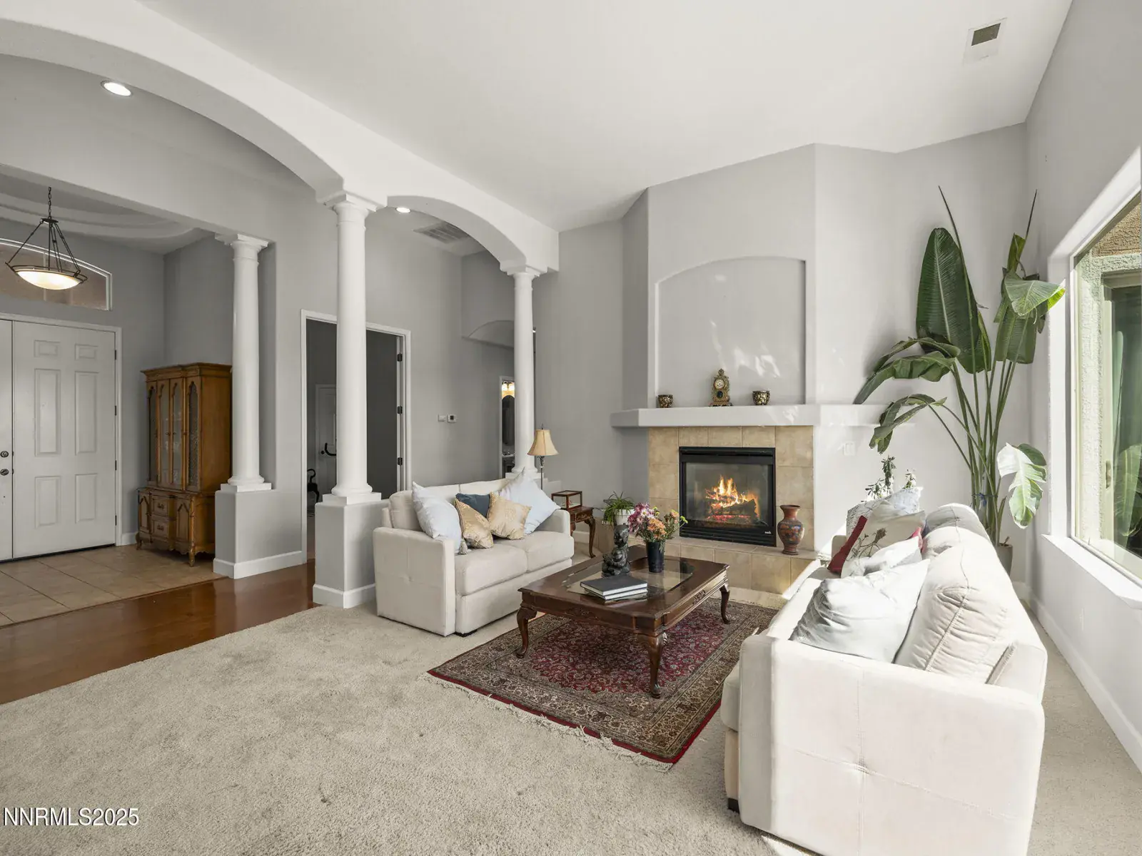From the moment you arrive, the circular driveway and stately covered entry welcome you inside to soaring ceilings, architectural columns, and a bright, open floor plan designed for both comfort and style. The formal living area features expansive windows framing breathtaking vistas, a cozy gas fireplace, and an effortless flow into the dining space—ideal for hosting gatherings or enjoying quiet evenings in.