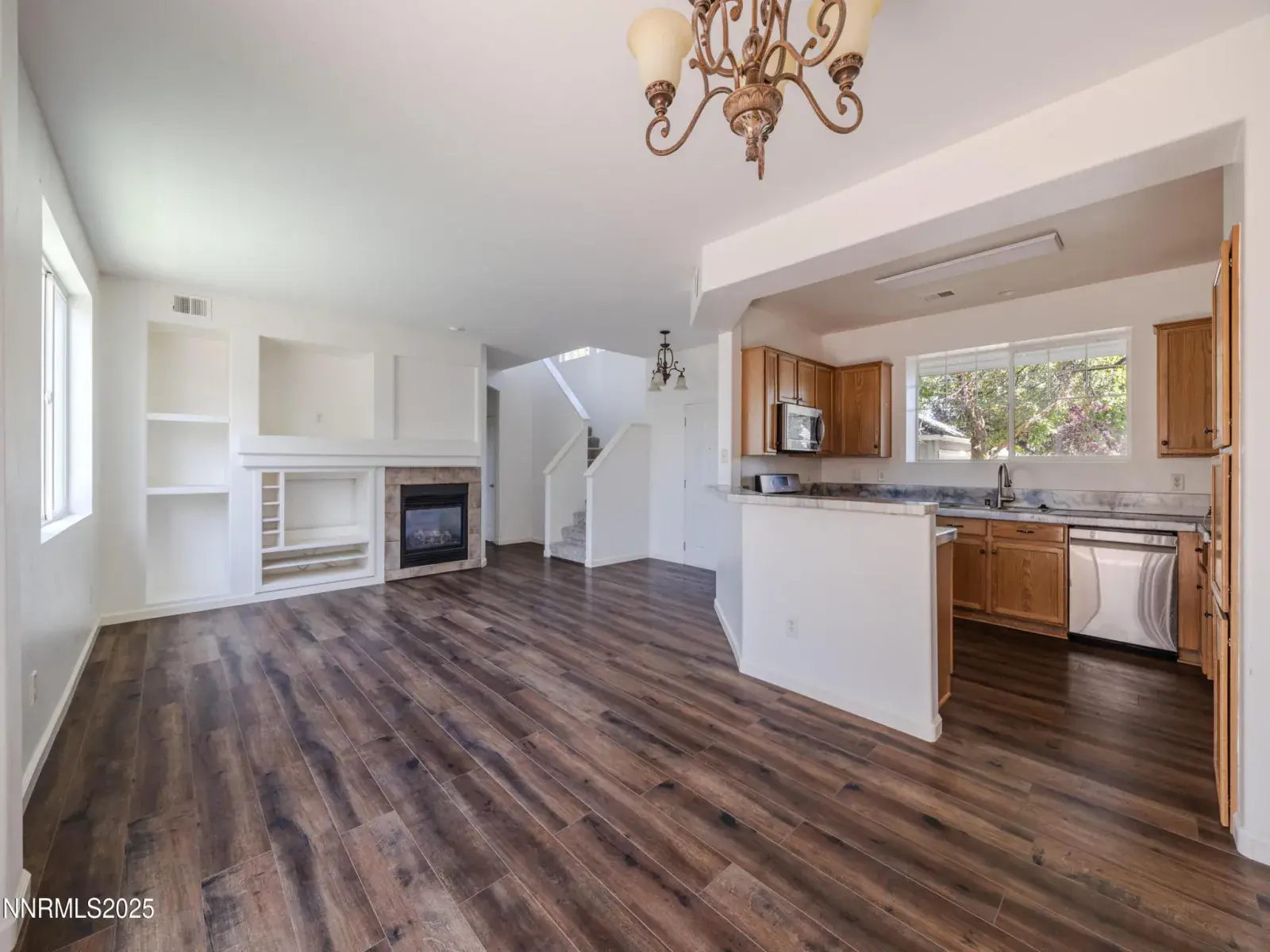 Step inside to find a bright, open floor plan with fresh paint, updated flooring, and large windows that fill the space with natural light. The spacious living room features a cozy gas fireplace and custom built-ins, creating the ideal spot to relax or entertain. The open-concept kitchen boasts stainless steel appliances, abundant counter space, and a breakfast bar for casual dining.