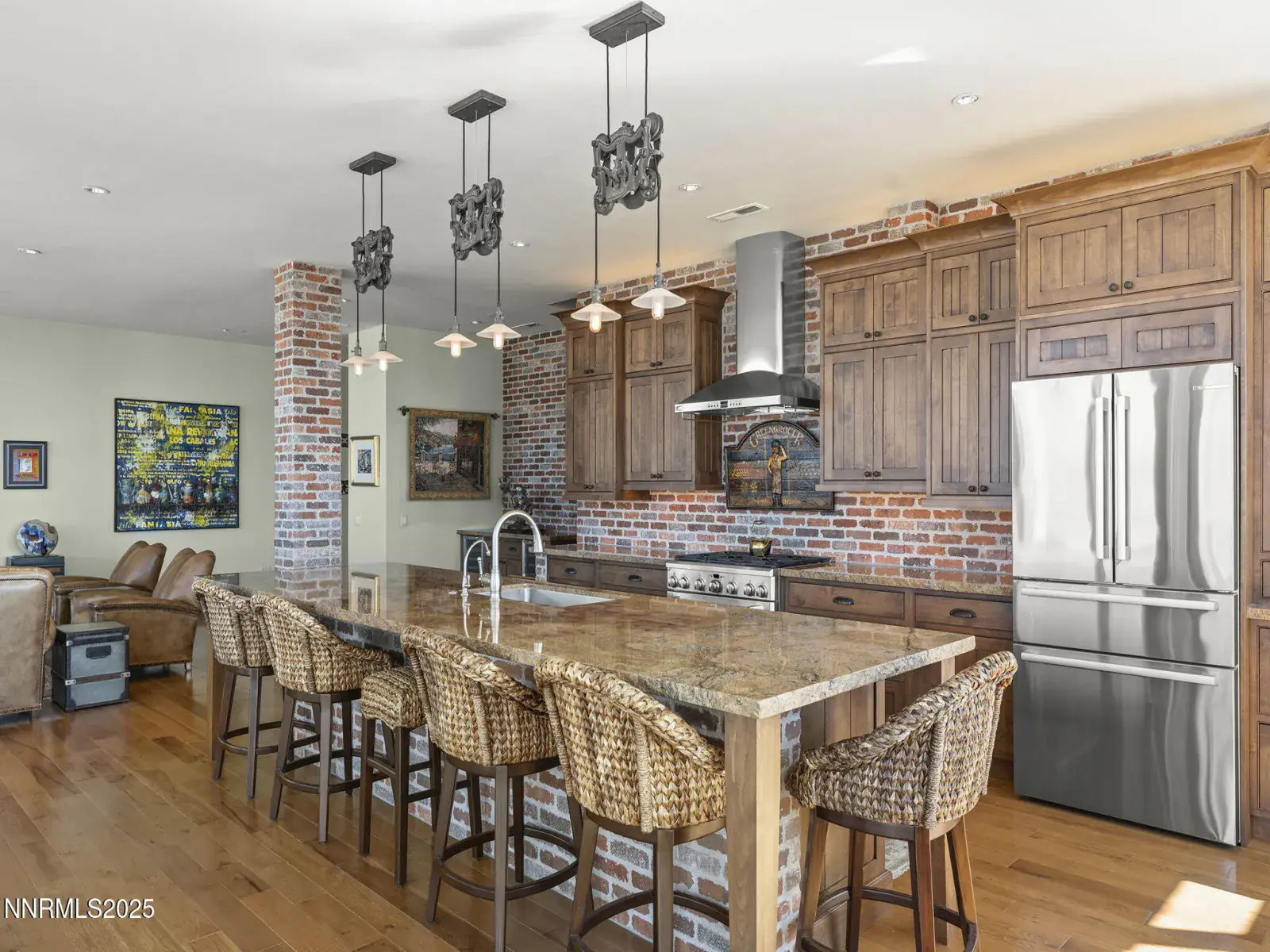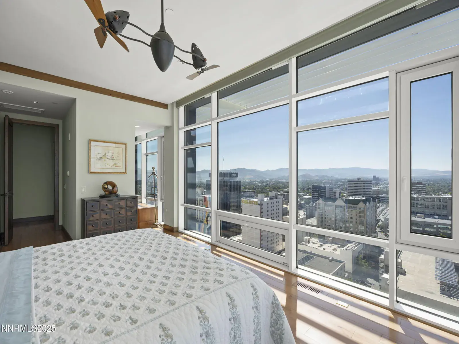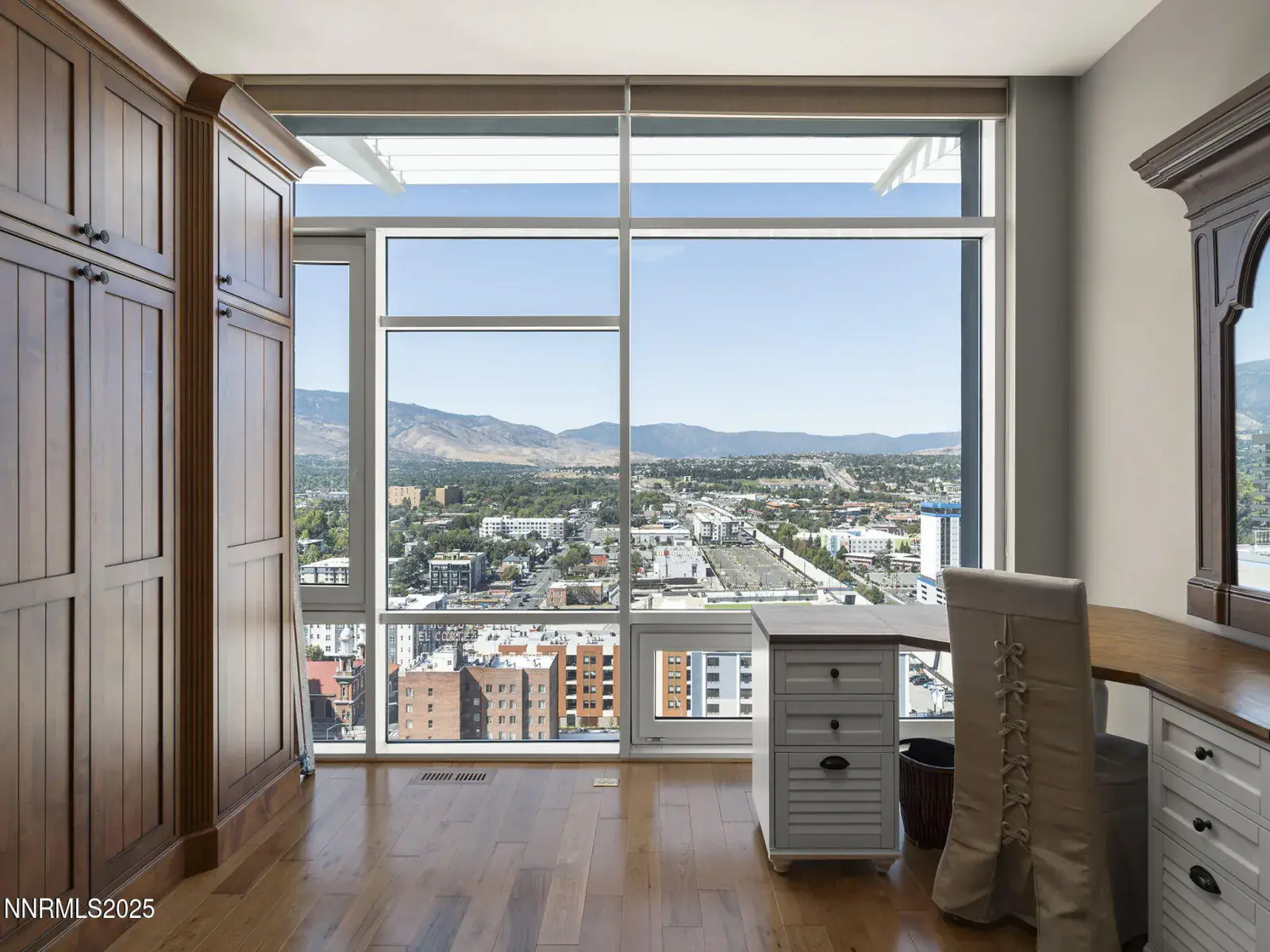 Perched high above downtown Reno, where sunsets light up the sky and storms move across the horizon, this Montage penthouse combines the look of a New York brownstone with the brightness and size of a modern mountain high-rise. Every part of this 2,658 sqft home has been upgraded for comfort and quality. Renovated throughout, the 2-bed plus office, 2.5-bath residence features brick walls, alder cabinetry, hickory floors, and panoramic views from Mt. Rose to the city skyline. From the moment you step inside the entry of 255 N. Sierra St. PH 2303, framed by alder wood doors and millwork, the home’s design is unmistakable. In the striking living space, the expansive windows and open layout celebrate the vast western landscape while brick walls and iron accents add old-world warmth. Outside, the penthouse’s 23rd-floor balcony offers a rare front-row seat to storms sweeping across the Sierra, sunsets blazing over the mountains, or city lights flickering at night. The open-concept kitchen features custom alder cabinetry, granite countertops, a large island with seating, stainless steel appliances, and dual-temperature wine storage. It flows seamlessly into the dining area and living room, which are equipped with a flat-screen TV and a Bose sound system, perfect for entertaining or relaxing at home. Upstairs, the primary suite is a true retreat. Wake to mountain views through glass walls, unwind in a spa-like bath with a soaking tub positioned to take in the vistas, and step into a custom glass-front closet designed with boutique-quality detail. A skylight illuminates the upper loft-like area, highlighting custom ironwork details and a private infrared sauna. An additional bedroom and a versatile office feature custom cabinetry, bookshelves, and built-ins suited for remote work, creative pursuits, or a second dressing area. The layout invites personalization, making it ideal for modern, separate workspaces. Every upgrade in this home combines beauty with practicality, from the engineered hickory hardwood floors to the whole-home water purification system. Motorized shades in the great room, primary bedroom, and office offer modern convenience. Soundproofing along the upper walls maintains privacy, and an upgraded balcony sealing system shields the interior from wind and weather. Energy-efficient LED lighting enhances ambiance throughout. Additional storage and convenience features include two private storage units and four parking spaces directly across from the elevator. Living at The Montage elevates the experience. Residents enjoy a zen-inspired lobby with a staffed front desk available 24/7, ensuring comfort and security. Amenities include a pool terrace with hot tubs and grills, a clubhouse for entertaining, and the downtown’s most expansive 24/7 in-building gym. Additional conveniences include bike storage, personal storage units, secure parking, and spaces for package pickup and daily needs. Communal areas such as the owner’s lounge, library, and garden deck offer opportunities to connect—or simply enjoy fireworks and city views from a shared skyward vantage point. Located at the heart of Reno’s evolving downtown, The Montage offers unparalleled access to the city’s energy. The Truckee Riverwalk is just blocks away, along with cultural venues and dining options lining the streets. Midtown’s eclectic shopping and restaurants are nearby, while the building’s height and orientation provide a sense of quiet retreat, with views connecting you to mountains and sky rather than just the streetscape. Whether you’re seeking a lock-and-leave retreat, a luxurious primary residence, or an exceptional setting for entertaining, Penthouse 2303 offers a rare combination: the warmth of custom design, the convenience of modern systems, and the drama of Reno’s panoramic views. Few residences manage to blend the intimacy of a handcrafted home with the scale of a true high-rise.