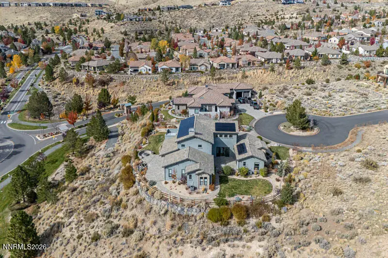 Views. Views. Views. Experience elevated living in this exceptional custom-built estate located within a gated enclave of Somersett, offering privacy and breathtaking, unobstructed 270-degree views. Designed to seamlessly blend indoor and outdoor living, the home features two expansive multi-slide, floor-to-ceiling window wall systems that frame the surrounding landscape and open to stunning outdoor spaces. The chef’s kitchen is a true showpiece, appointed with Wolf and Sub-Zero appliances, a built-in coffee system, two wine refrigerators, two dishwashers, and an oversized walk-in pantry. Custom cabinetry is showcased throughout the home, paired with a complete home water filtration system and dual tankless water heaters for efficiency and comfort. The thoughtfully designed floor plan includes a private office or den just off the kitchen and a luxurious primary suite featuring separate his-and-hers walk-in closets. Every detail has been considered, from Tesla solar panels with battery backup to a fully integrated interior and exterior wired security system with cameras, and Sonos audio wired throughout the home and outdoor living areas. The detached gym with a full bath and steam shower offers flexibility as a private guest suite or wellness retreat. Outdoor living is equally impressive, featuring an exterior courtyard fireplace, outdoor kitchen, gas fire pit, and multiple spaces designed to entertain or unwind while enjoying panoramic views. A rare combination of luxury, privacy, and cutting-edge amenities—this Somersett estate offers refined Nevada living at its finest.