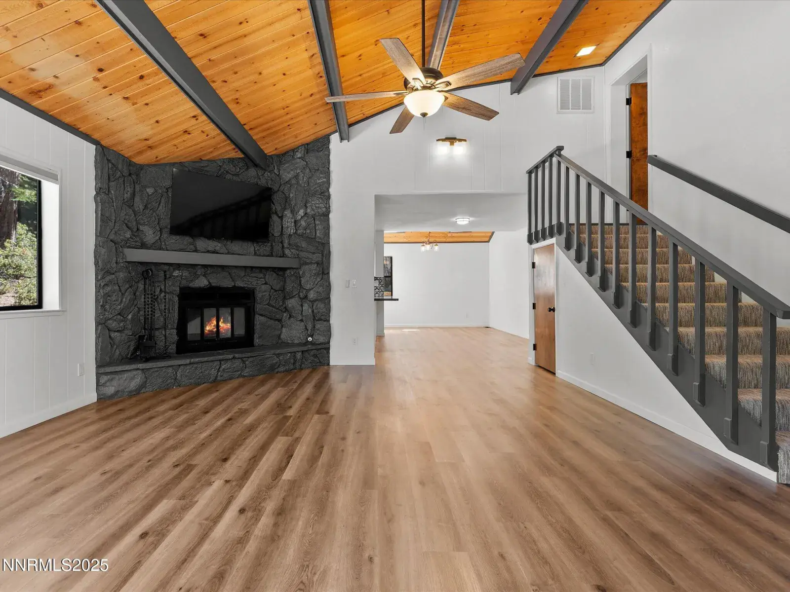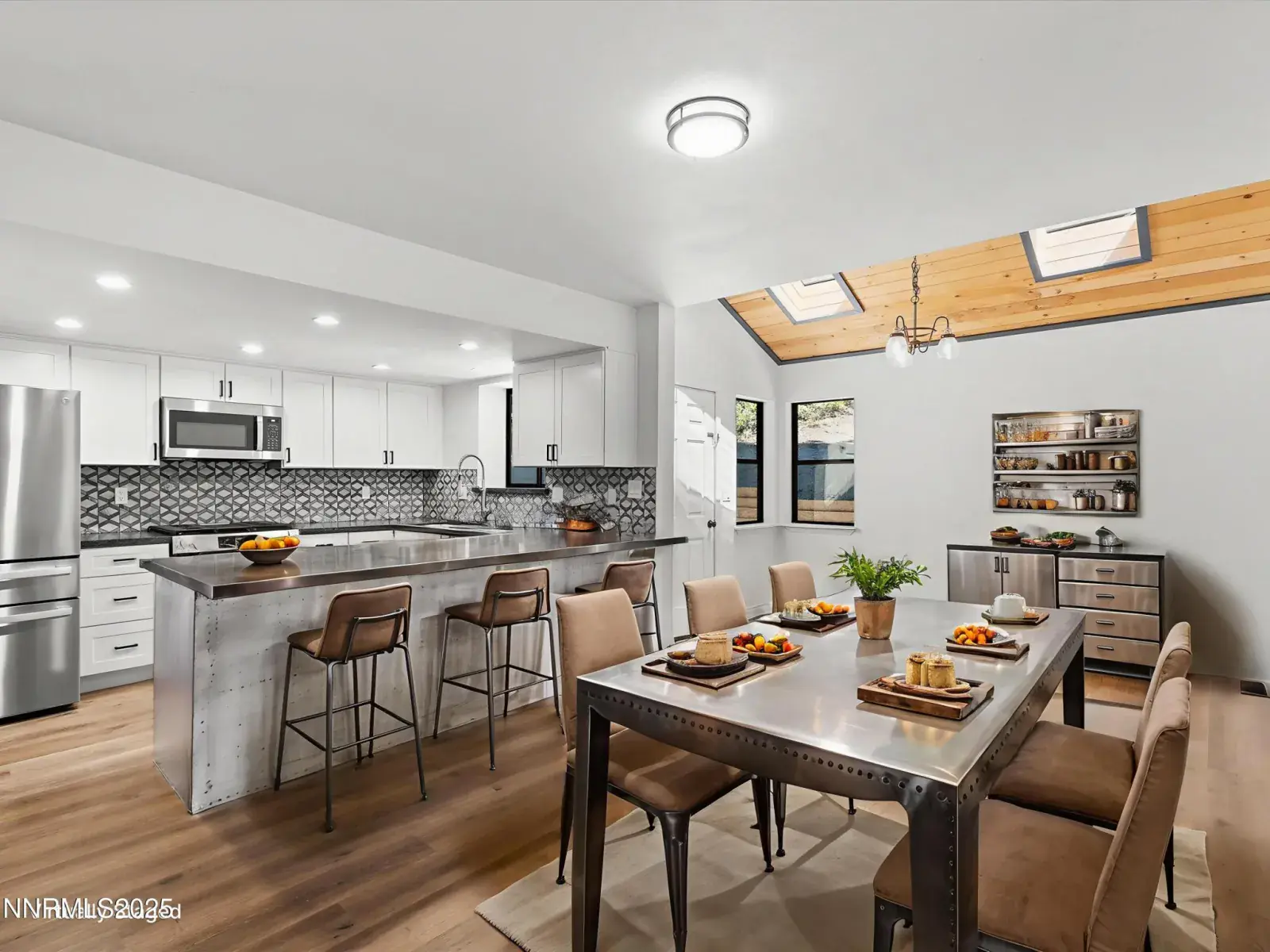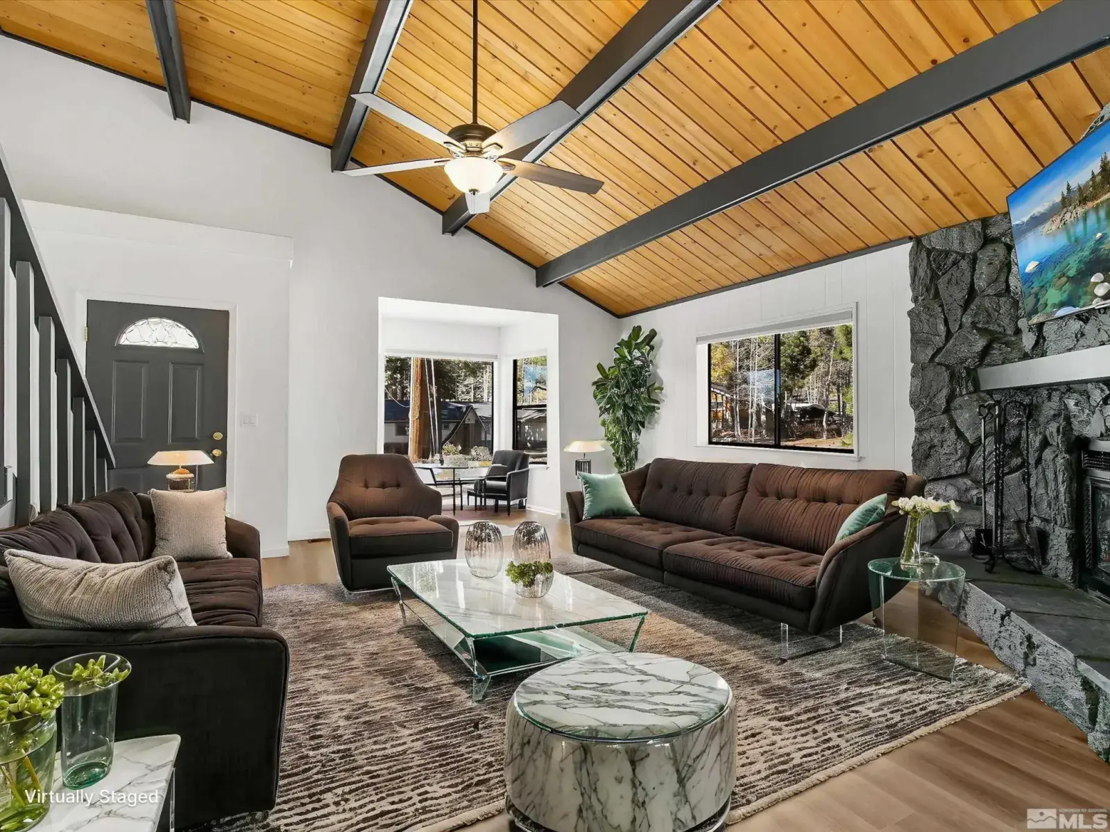 Beautifully Updated Kingsbury Home Near Heavenly & Lake Tahoe Set on over half an acre along sun-drenched Andria Drive, this 4-bedroom, 2-bath, 1,760 sq. ft. Kingsbury home offers a rare blend of privacy, convenience, and year-round outdoor access. Just 5 minutes from Heavenly Ski Resort and 10 minutes from the shores of Lake Tahoe, this inviting mountain retreat is perfectly situated for those who value both adventure and tranquility. The home has been thoughtfully updated with a brand new complete appliance package, including a GE Profile refrigerator and dishwasher, gas range, microwave, and washer and dryer. A new garage door is scheduled for installation on June 1, completing a series of recent enhancements that make the home truly move-in ready. Inside, the kitchen and primary bathroom have been fully renovated, showcasing a modern blend of form and function. Additional updates include fresh paint, new flooring, LED lighting, and stylish fixtures throughout. The living room welcomes you with vaulted open-beam ceilings, a cozy wood-burning fireplace, and a front nook offering charming street views. The adjacent dining area, filled with natural light from two skylights, opens directly to a secluded, park-like backyard patio—an ideal setting for outdoor dining or peaceful relaxation. The updated kitchen includes ample cabinetry and a breakfast bar that flows seamlessly into the living and dining spaces. The primary bedroom provides direct access to the backyard and tranquil forest views, creating a serene retreat. Upstairs, three additional bedrooms and a full bath offer flexible living options. Two of the upstairs bedrooms feature access to a spacious deck above the garage, perfect for enjoying Tahoe’s crisp mornings or clear starry nights. Additional features include a spacious two-car garage, a large basement storage area, a detached wood shed, and potential space for boat or RV parking. The home sits on a priority-plowed school bus route and is just minutes from the Tahoe Rim Trail, making it especially appealing for outdoor enthusiasts. This Kingsbury residence offers the best of Tahoe living, combining select modern updates, classic mountain charm, and an unbeatable location. Don’t miss the opportunity to own this move-in ready gem. Legal Disclaimer: Property photos may include digital enhancements and/or virtual staging. Actual property condition may differ.