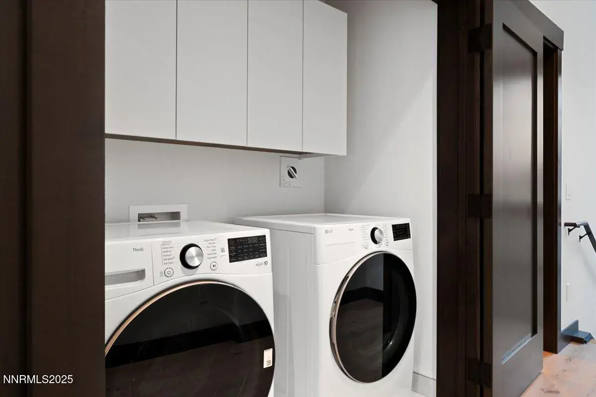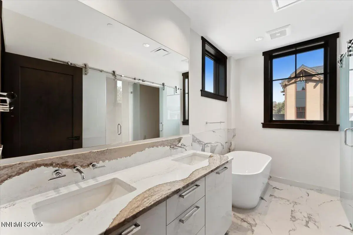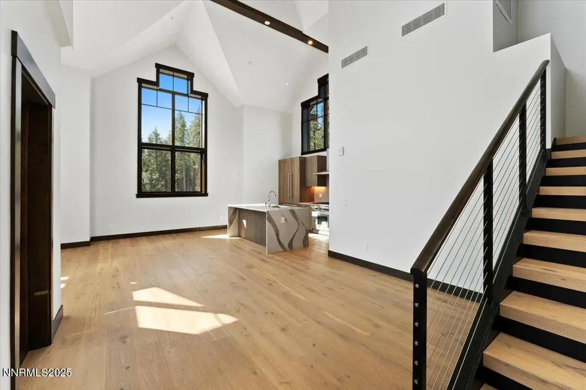 This impeccably designed residence offers a seamless blend of luxury, comfort, and functionality. Dramatic high ceilings and an open-concept layout create a bright, inviting atmosphere, while a generous loft area provides the perfect space for entertaining or relaxation. A private elevator ensures effortless access throughout the home. Every detail has been thoughtfully curated with refined finishes and high-end amenities—from sleek Eggersmann cabinetry and a modern fireplace to premium Thermador appliances and striking waterfall-edge quartz countertops. Radiant-heated hardwood floors add both warmth and elegance underfoot. Enjoy the convenience of a two-car garage with additional on-site guest parking. This is sophisticated Tahoe living, where modern design meets mountain serenity.