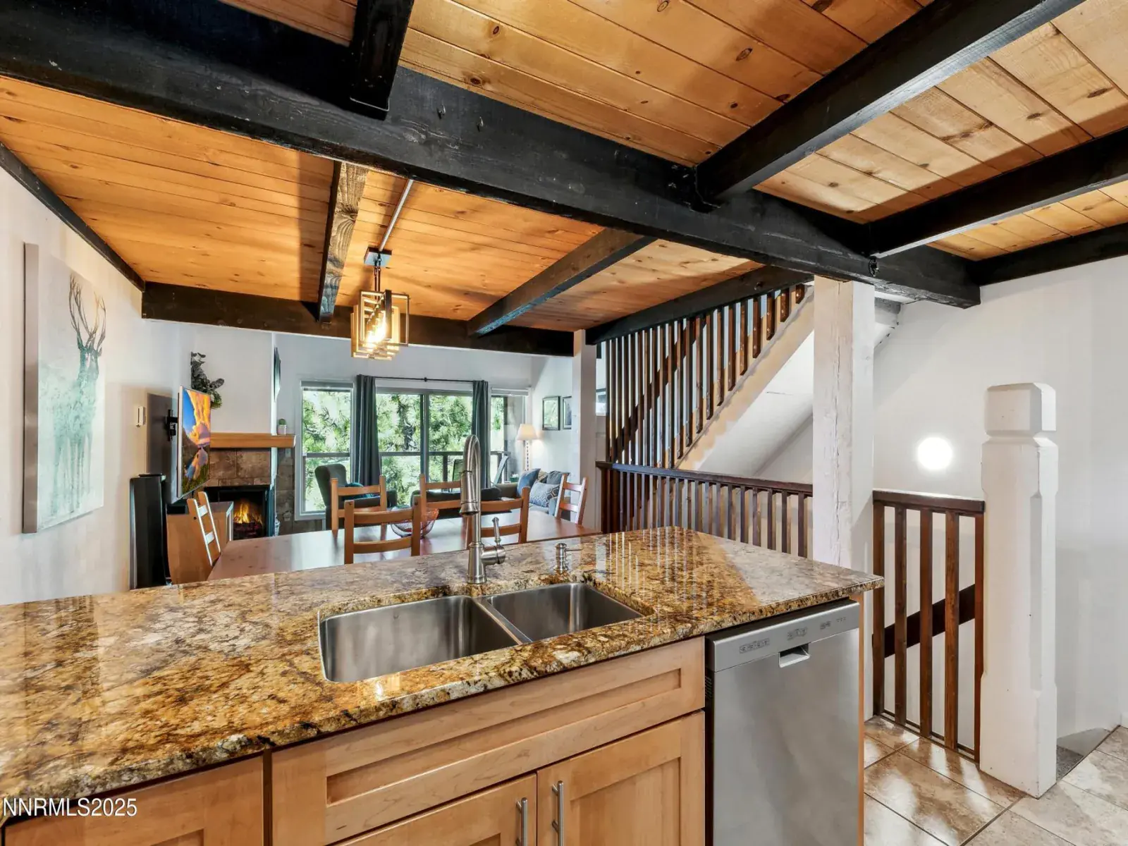 Step inside to find soaring vaulted ceilings with exposed beams that create an airy, expansive feel in the main living area. The open-concept design is enhanced by hardwood flooring and a cozy wood-burning fireplace—perfect for warming up after a day on the slopes. The thoughtfully renovated kitchen showcases granite slab countertops, stainless steel appliances, and solid maple cabinetry for both style and functionality.