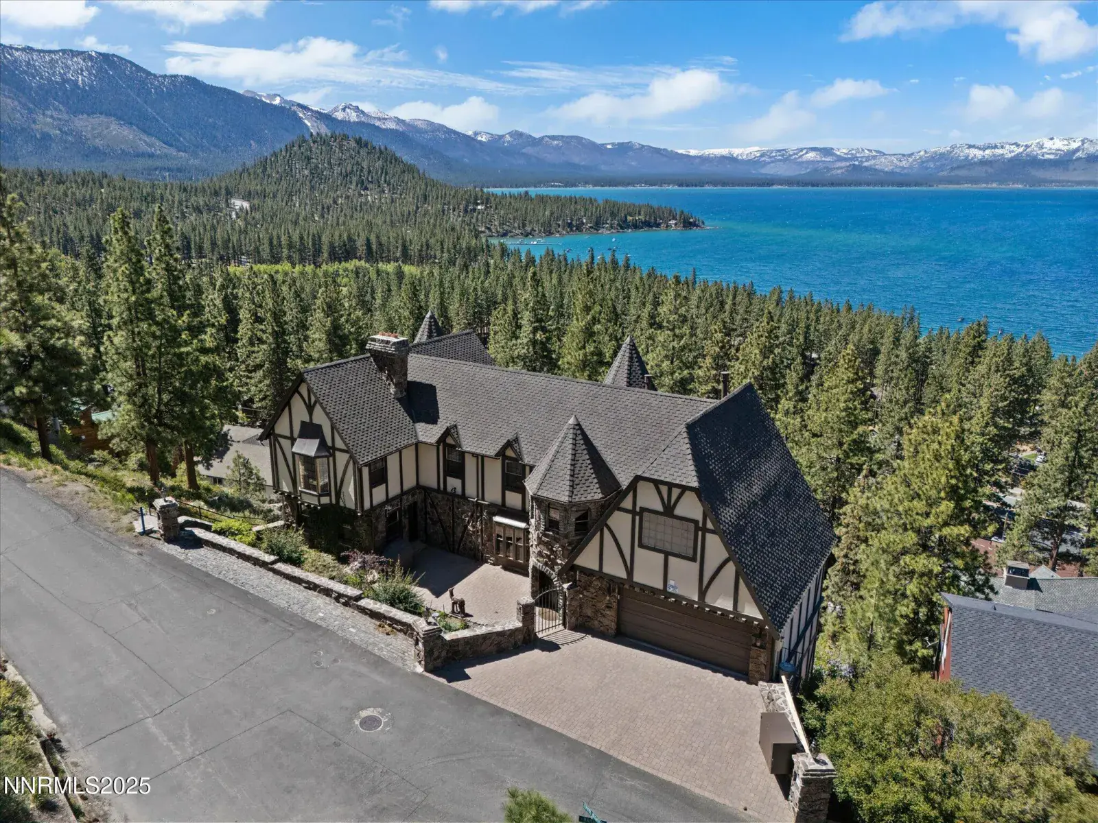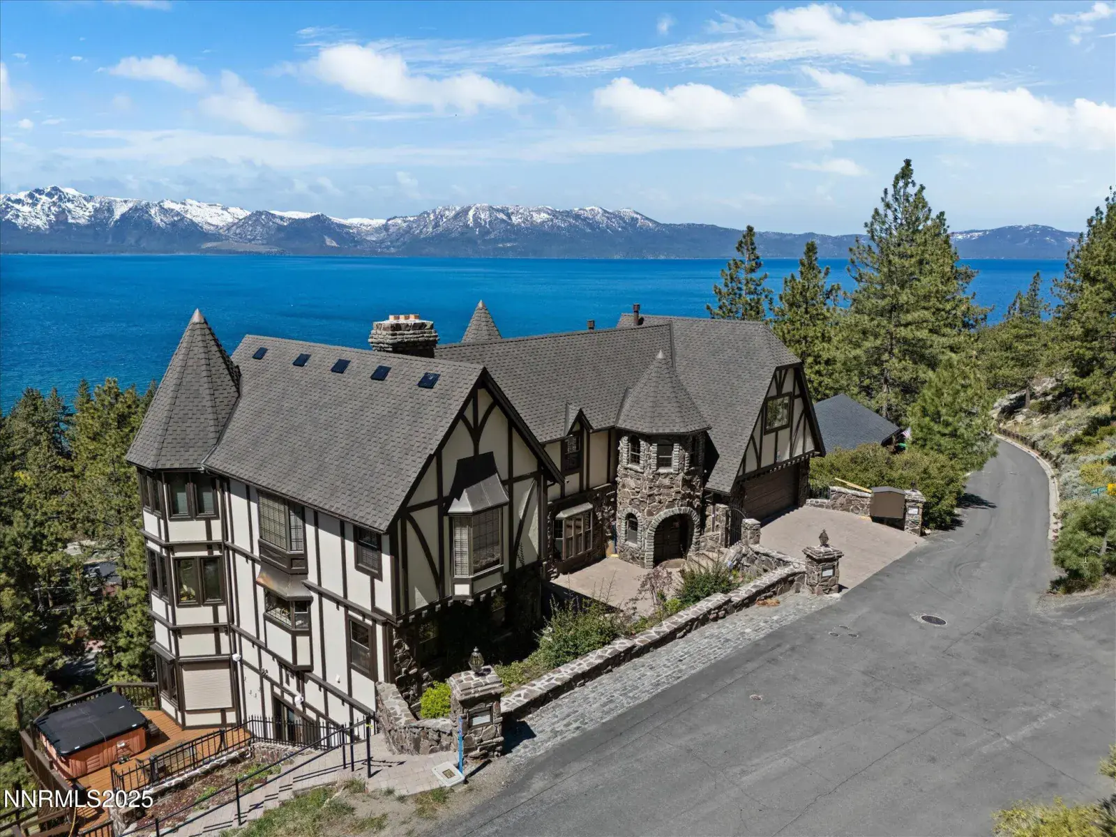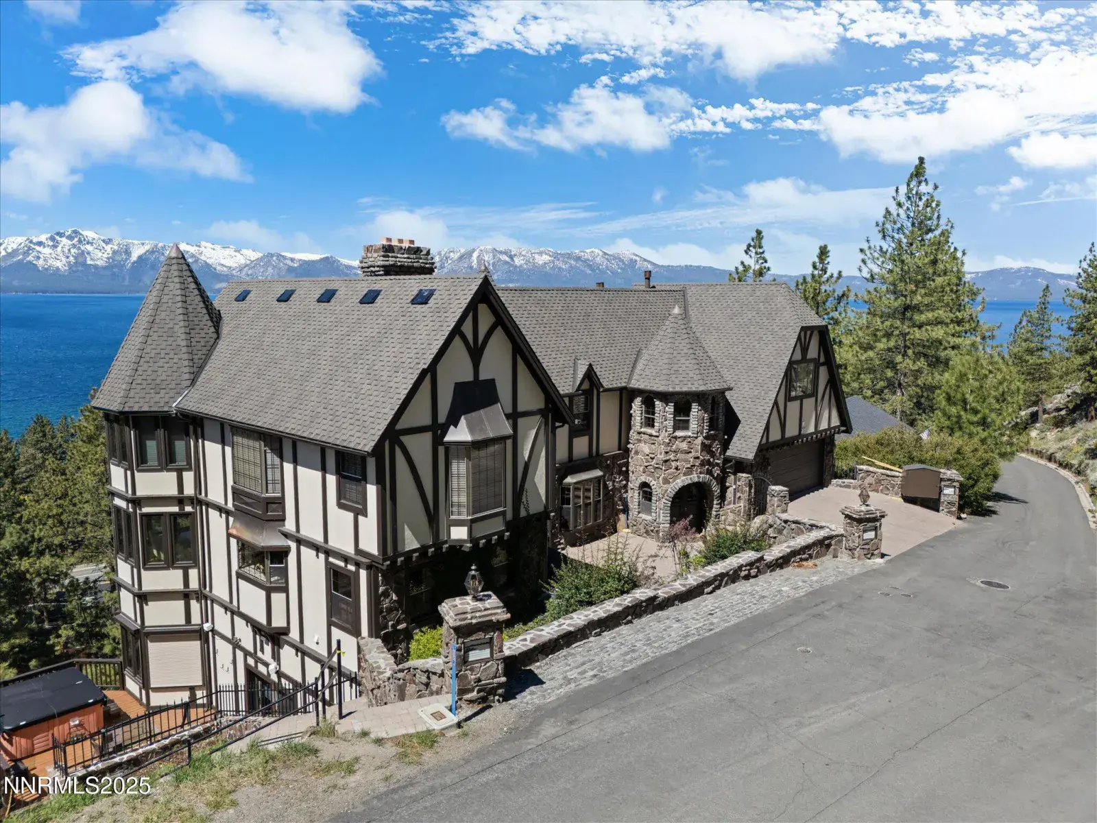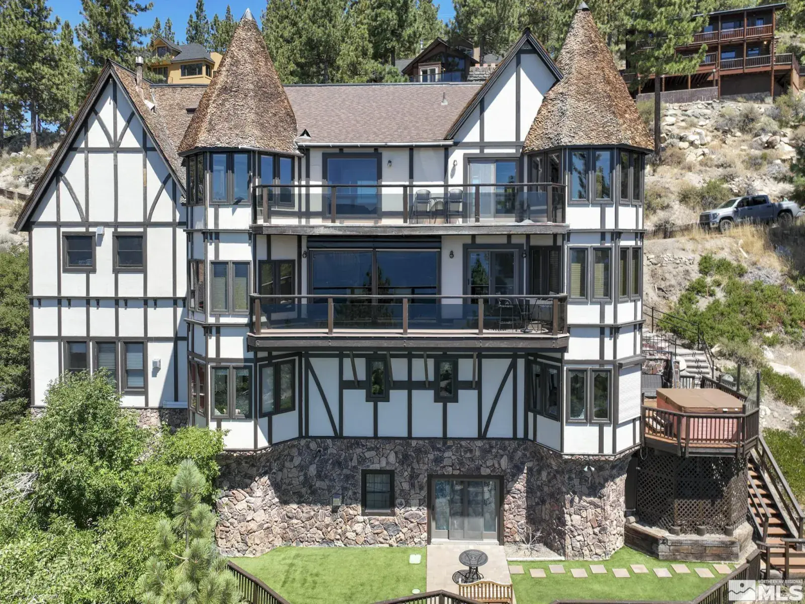Experience the grandeur of this extraordinary Tudor-style Tahoe castle, where Old World elegance meets modern luxury in a setting beyond compare. Offering sweeping, unobstructed southwest-facing lake views that stretch from the slopes of Heavenly Ski Resort to the North Shore of Lake Tahoe, this rare architectural treasure is perched on a premier cul-de-sac lot in Zephyr Heights — one of the most coveted neighborhoods on the Nevada side of the lake. Owner financing available for qualified applicants. Recently revitalized with extensive updates, including a brand-new roof, this stately residence invites you into nearly 5,800 square feet of refined mountain living, spread across multiple levels designed to inspire both grandeur and comfort. Step through the castle-style entry and be transported into a world of craftsmanship, featuring custom stonework, exposed beam ceilings, warm wood finishes, and floor-to-ceiling windows that frame the lake like a living painting. The upper-level primary suite feels like a five-star retreat, offering two cozy fireplaces, central AC, a private office, oversized walk-in closet, and a spa-style bathroom that stuns — with a soaking tub set in a turreted alcove overlooking the water and a glass-enclosed shower with panoramic views. Just outside, a private deck offers a front-row seat to Tahoe’s famed sunsets. Adjacent, a loft-style sixth guest suite includes its own en-suite bath — ideal for guests, in-laws, or a home office. The heart of the home — a chef’s kitchen — has been thoughtfully updated with quartz countertops, two large center islands, new stainless steel appliances, and exquisite cabinetry. The adjacent octagonal formal dining room offers a dramatic yet intimate setting for up to eight guests, while the lakeview living room features a grand rock fireplace, large screen TV, built-in wet bar with quartz counters, and a sunken conversation pit that opens to an expansive outdoor deck. Downstairs, the amenities continue: a second full kitchen, a family room with space for games or media, a dedicated art studio, dry sauna, and a 300-bottle wine cellar. A game room with pool table and direct access to the spa patio creates the perfect après-ski gathering space. Three additional bedroom suites provide ultimate flexibility for multi-generational living, vacation hosting, or luxurious guest quarters. Outside, newly installed pavers, tiered stone patios, and professional landscaping complement the home’s storybook architecture. Soak in the hot tub while taking in a view that rivals any five-star resort. Additional highlights include forced air heating, split AC units for individual comfort zones, a two-car garage with additional driveway parking, a private stone stairway leading to the lowest level, and a bonus off-street parking area for two more vehicles — rare in the hills of Tahoe. Tucked just minutes from the excitement of Stateline casinos, the world-class Edgewood Golf Resort, and the iconic beaches of Lake Tahoe’s East Shore, this enchanting property offers the perfect balance of peaceful seclusion and unmatched access. Whether you’re seeking a luxurious full-time residence, an investment-grade vacation home, or a generational estate to pass down for years to come — this is your castle in the sky. Legal Disclaimer: Property photos may include digital enhancements and/or virtual staging. Actual property condition may differ.