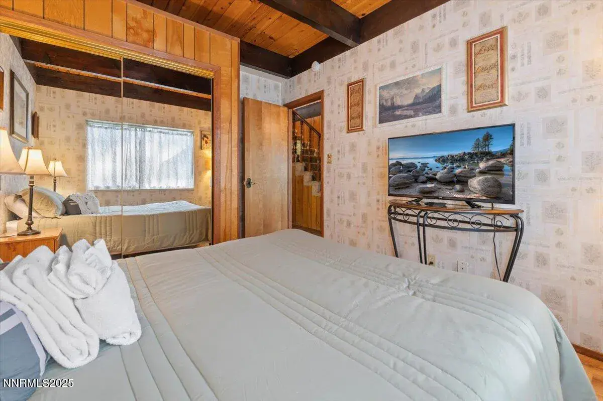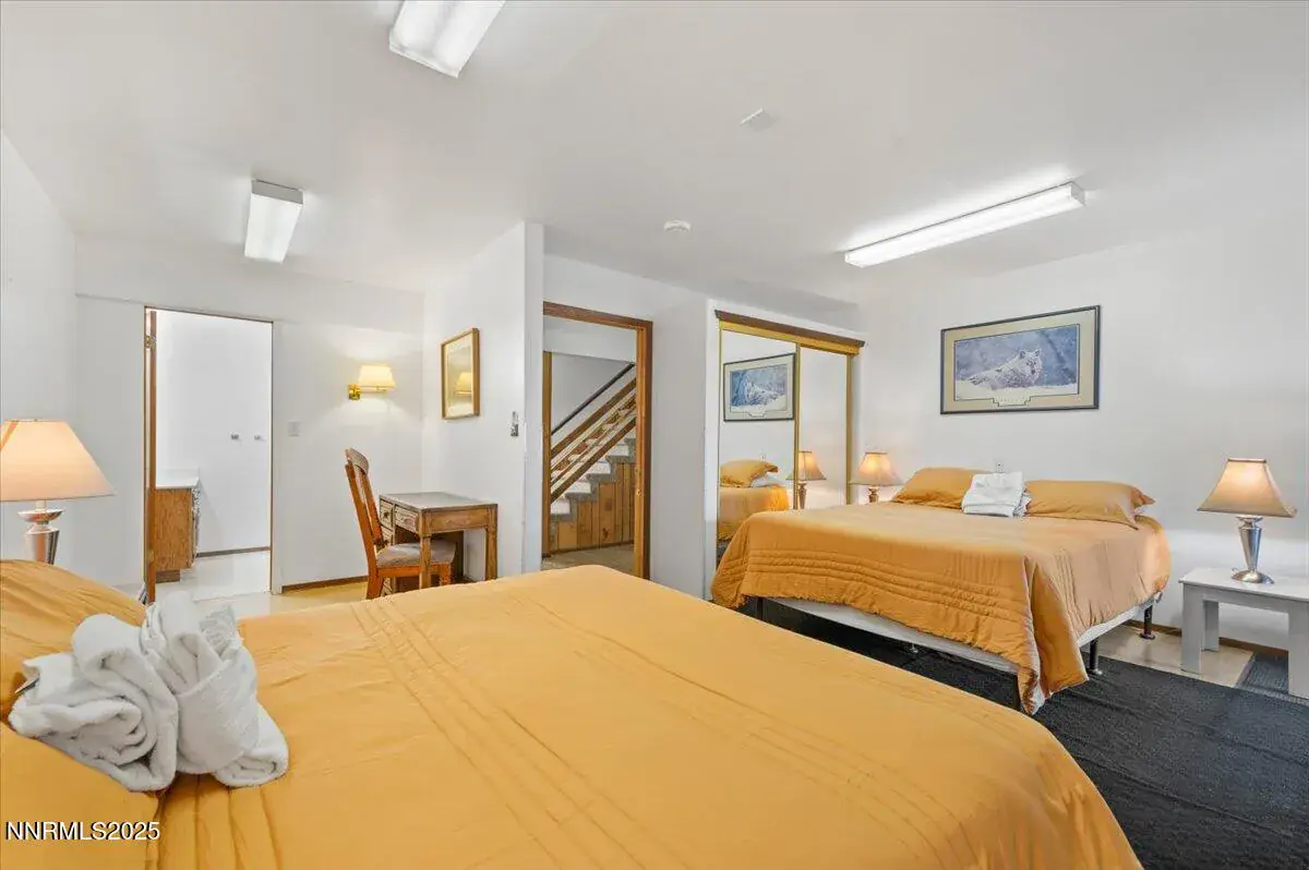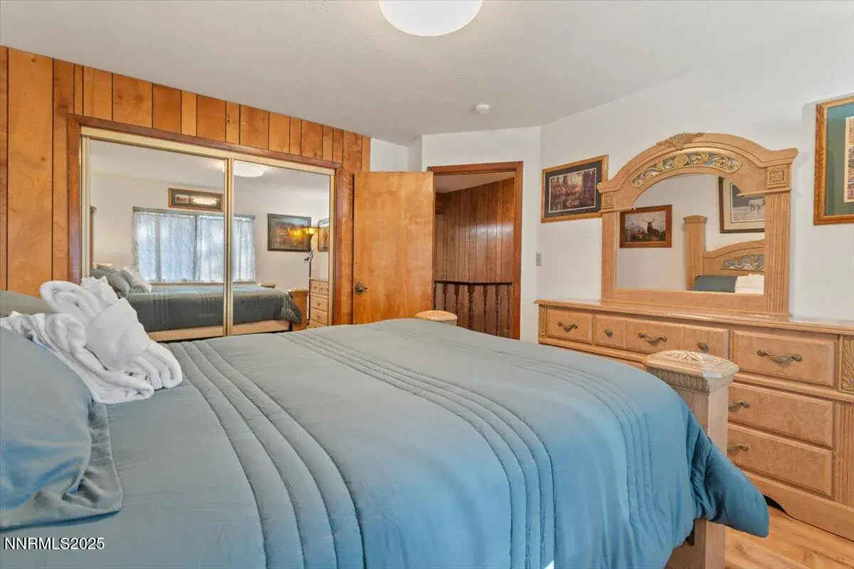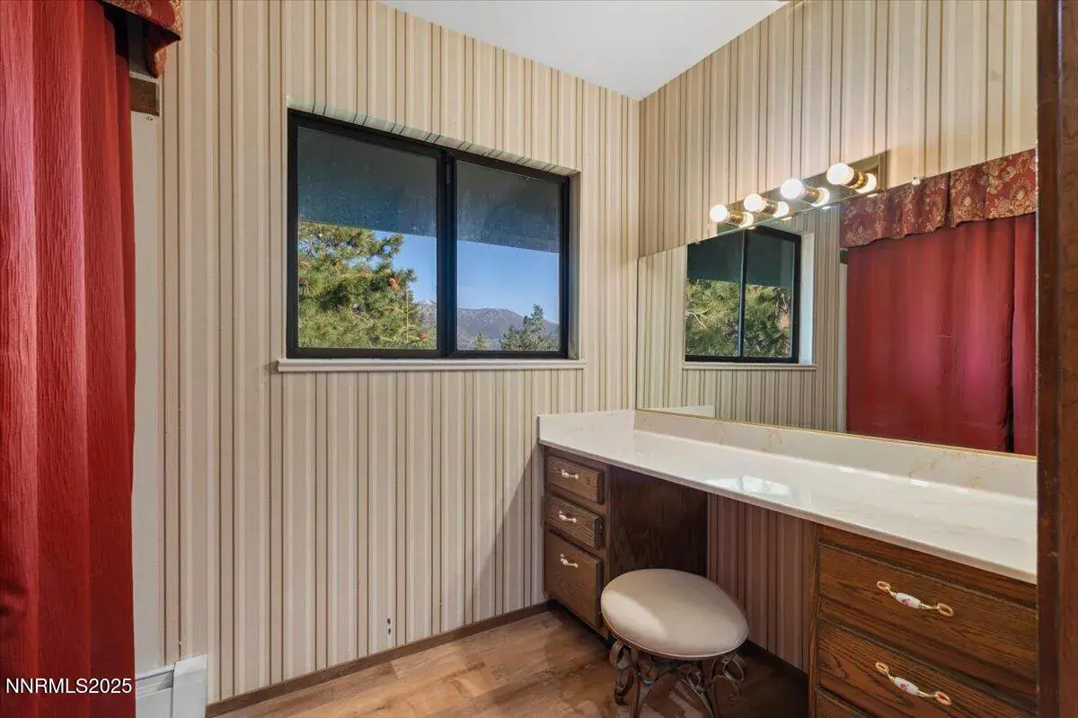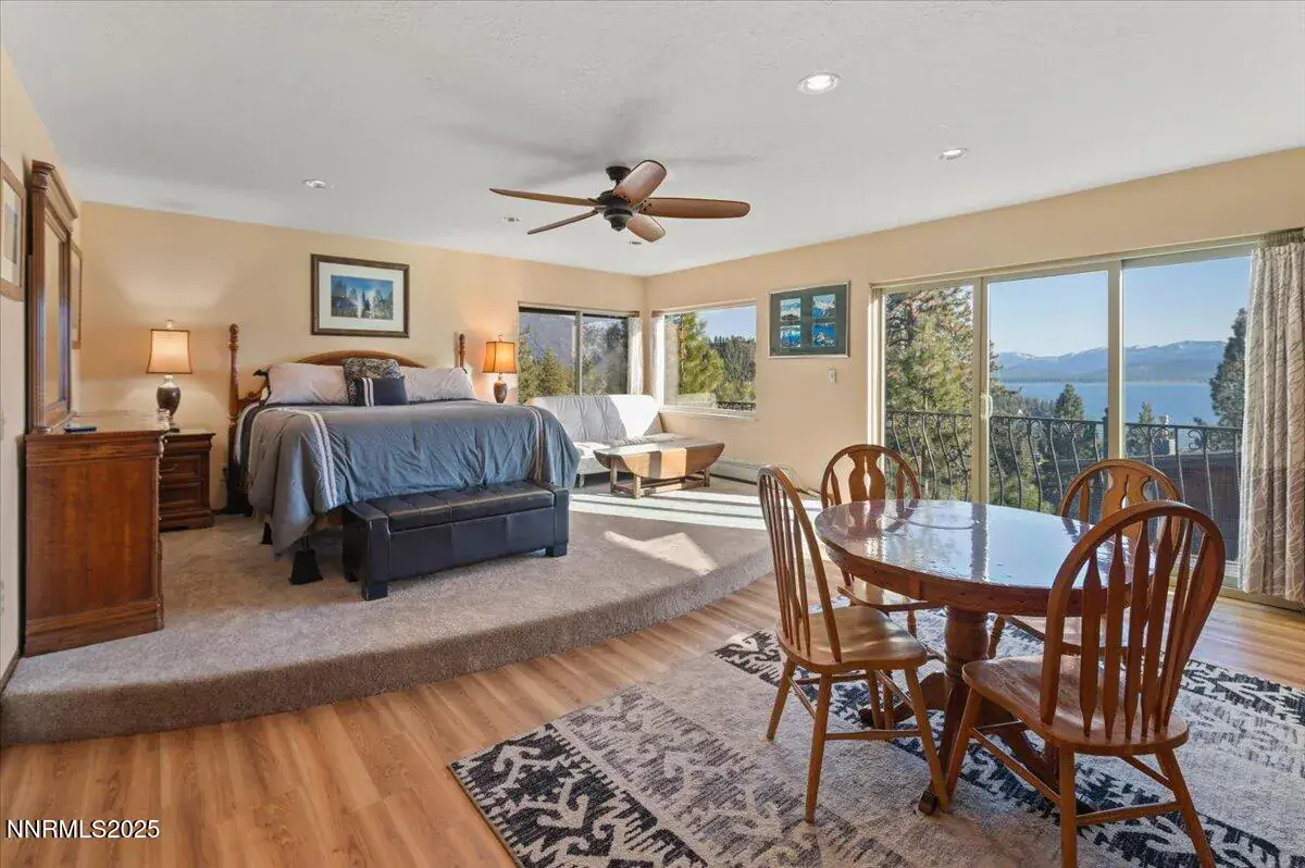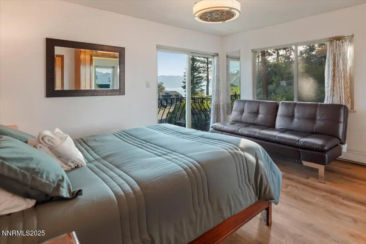 The expansive primary bedroom is a private retreat featuring ample space to unwind while taking in views of the lake and Sierra skyline. It includes a walk-in closet, dedicated vanity area, and an appointed ensuite bathroom with a double sink. Downstairs, a spacious guest suite features its own ensuite bath and a sliding glass door that opens directly to the outdoors, perfect for guests or extended stays. Blending classic Tahoe charm with a flexible, generous floor plan, the home offers plenty of room for everyone to enjoy privacy and comfort.